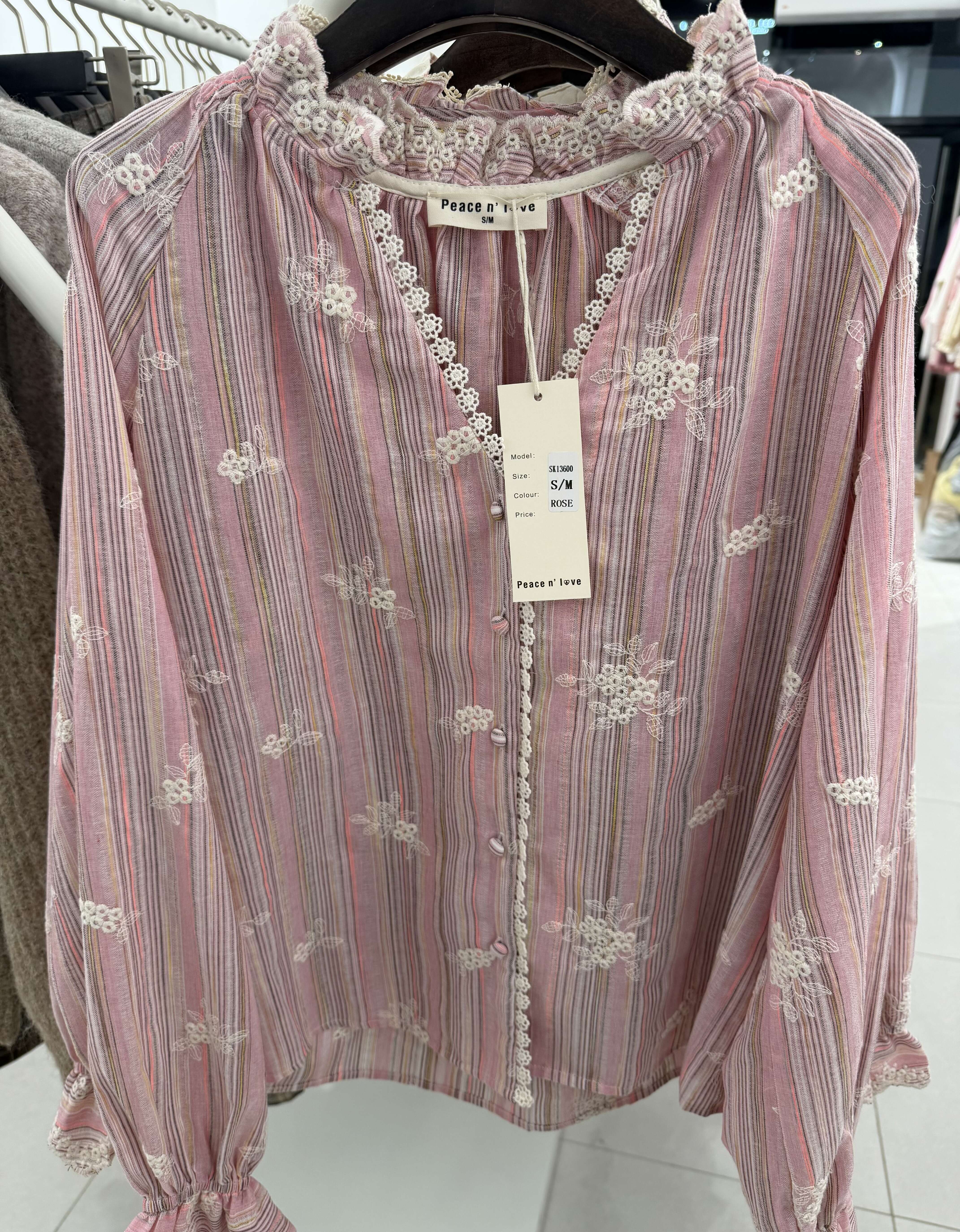Zwiewna koszula w odcieniu różu z haftowanymi kwiatami i subtelną koronką. Modny, luźny krój zapewnia wygodę i kobiecy styl na co dzień.