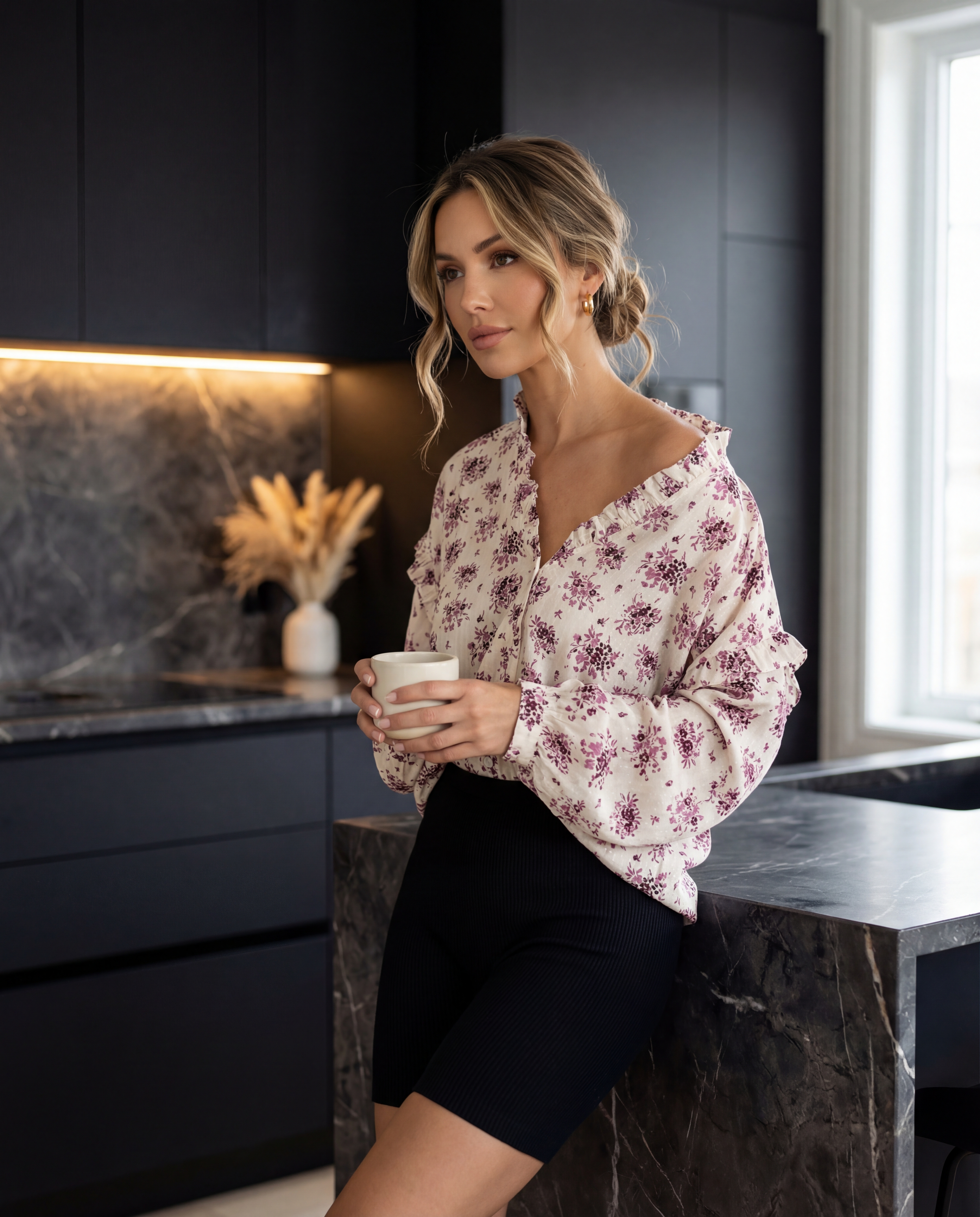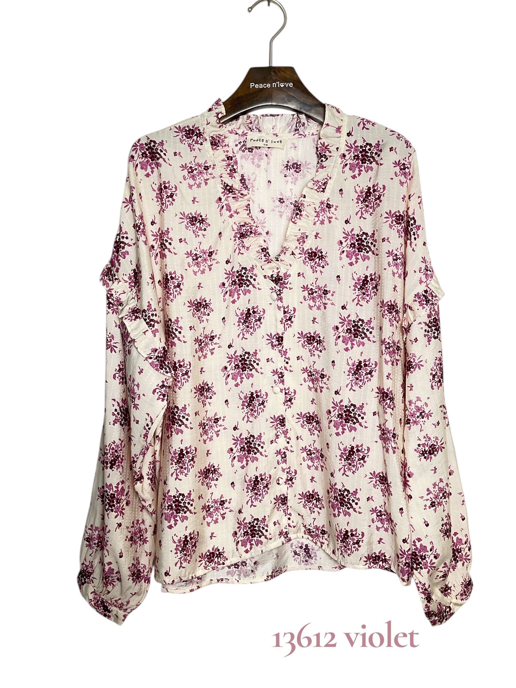 Lekka koszula o luźnym kroju z romantycznym fioletowym wzorem kwiatowym, wykończona subtelną falbanką przy dekolcie i rękawach – wygoda i styl na co dzień.
