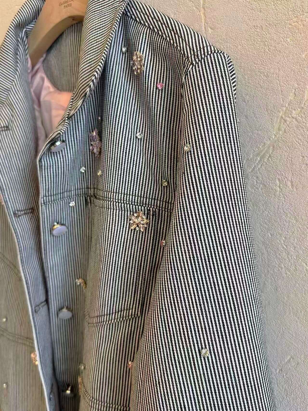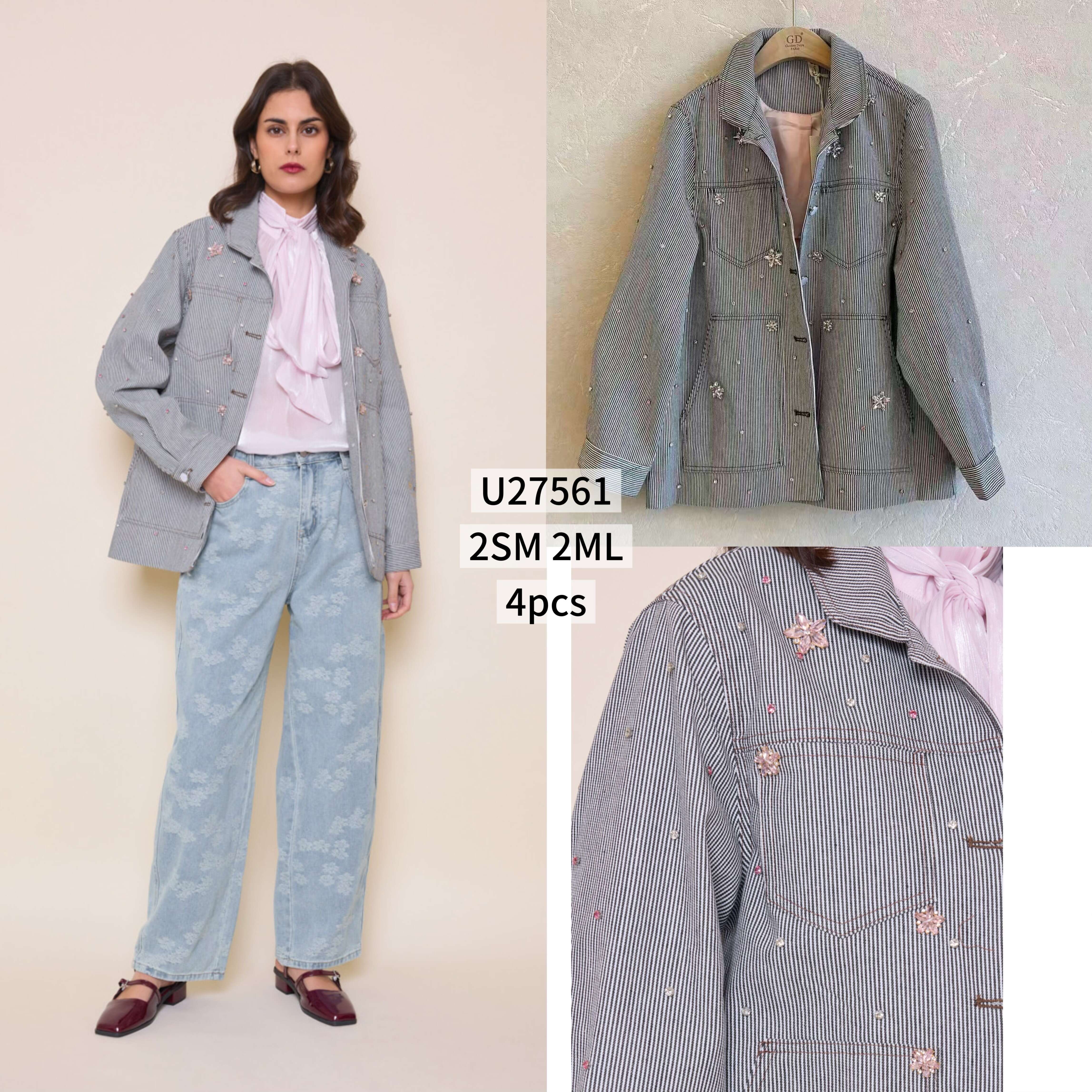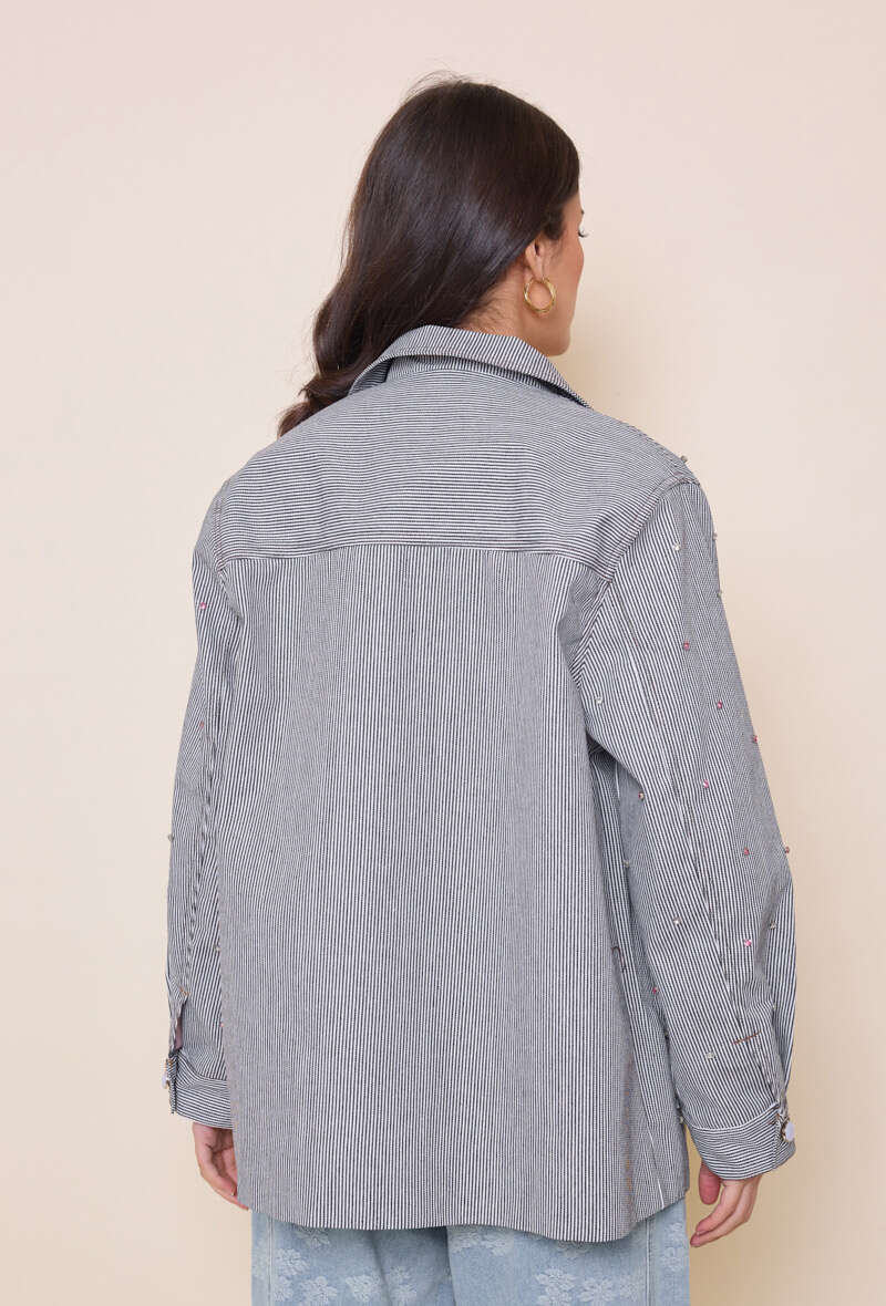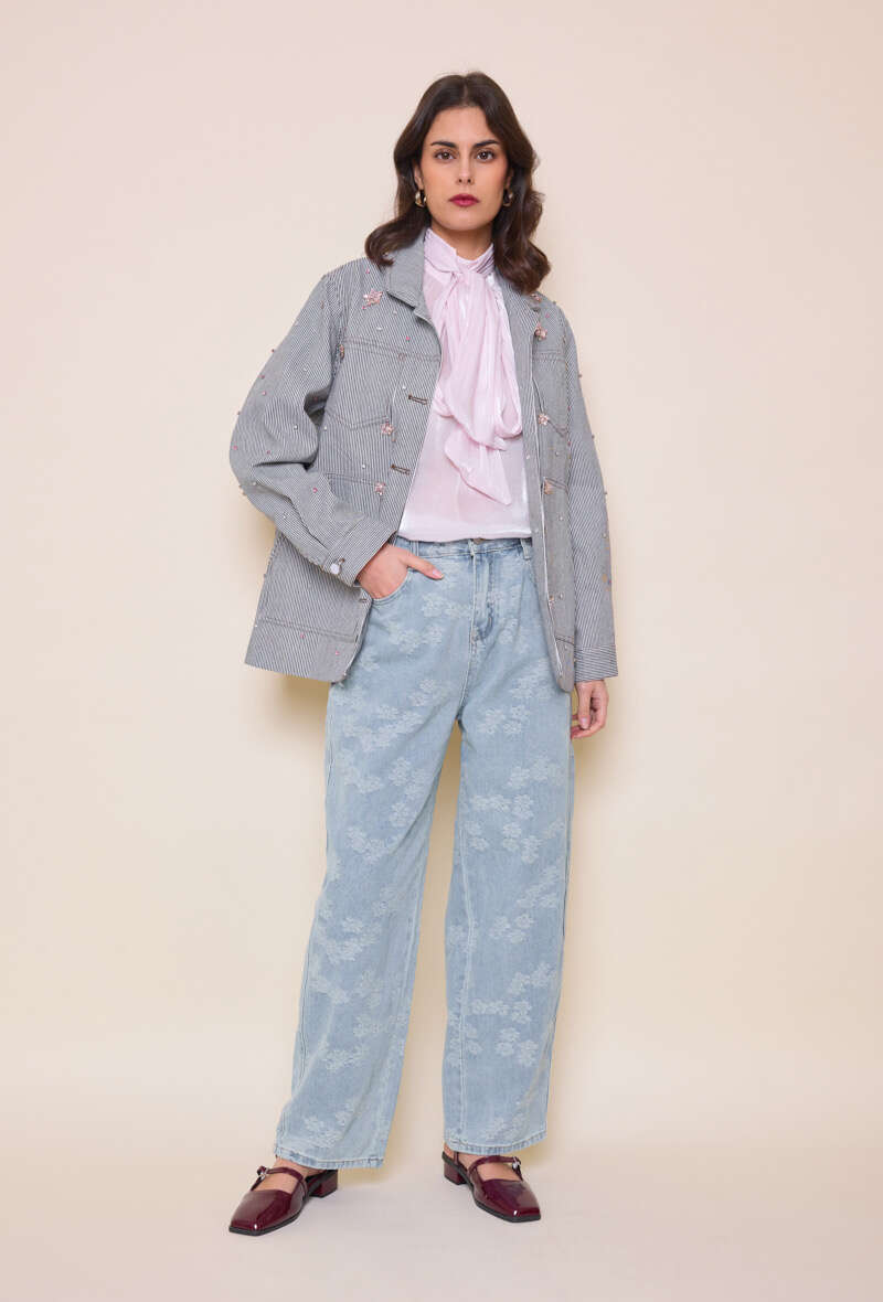Modna kurtka w subtelne paski, ozdobiona delikatnymi haftami. Luźny krój zapewnia komfort noszenia, a wysokiej jakości materiał sprawdzi się na każdy sezon.