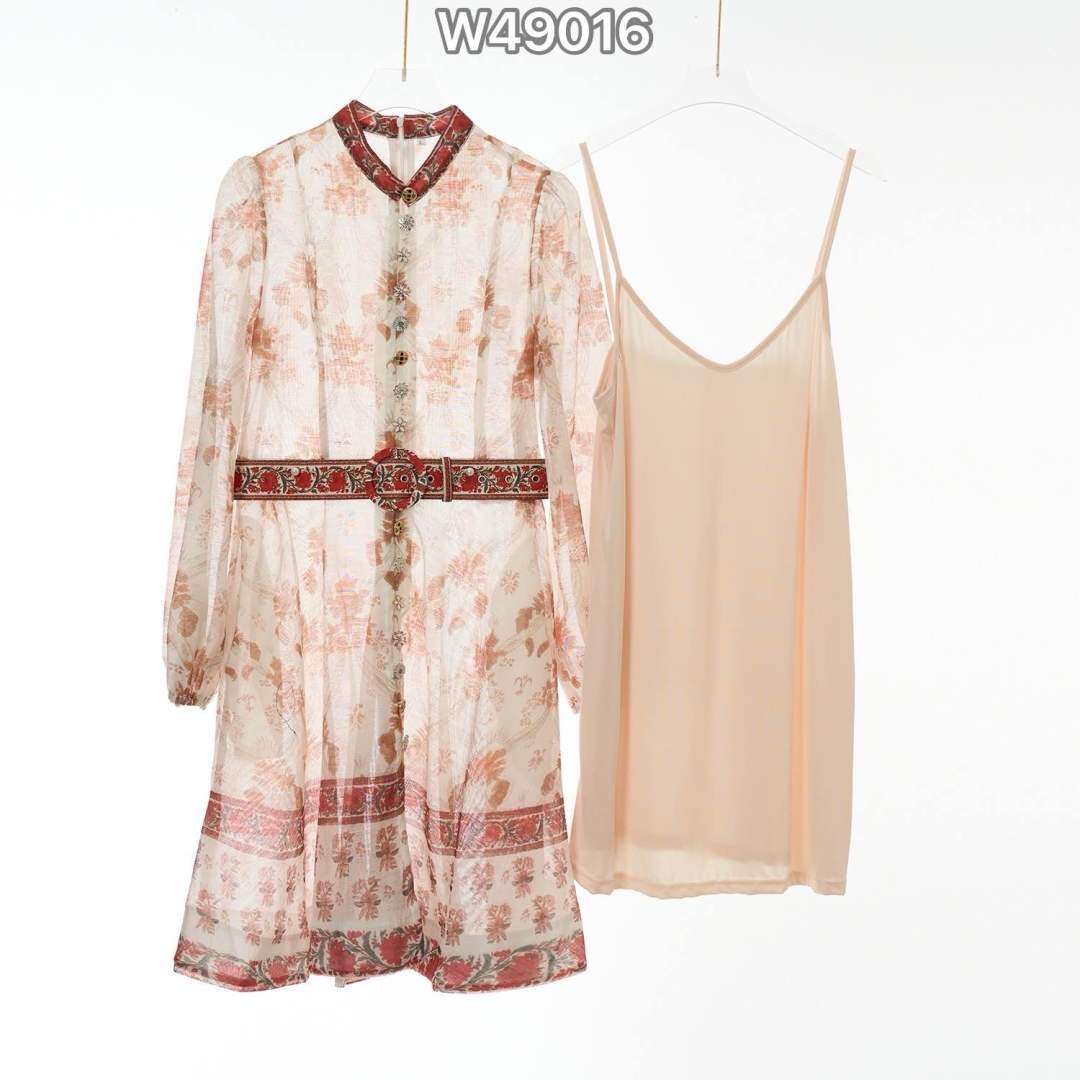 Zwiewna sukienka w beżowym odcieniu z kwiatowym wzorem, ozdobnymi guzikami i eleganckim paskiem. Idealna na wyjątkowe okazje i codzienny szyk.
