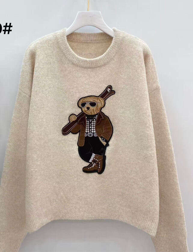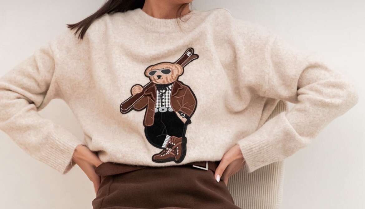 Miękki sweter o luźnym kroju z oryginalną aplikacją misia, idealny na chłodniejsze dni – wygoda i styl w jednym.