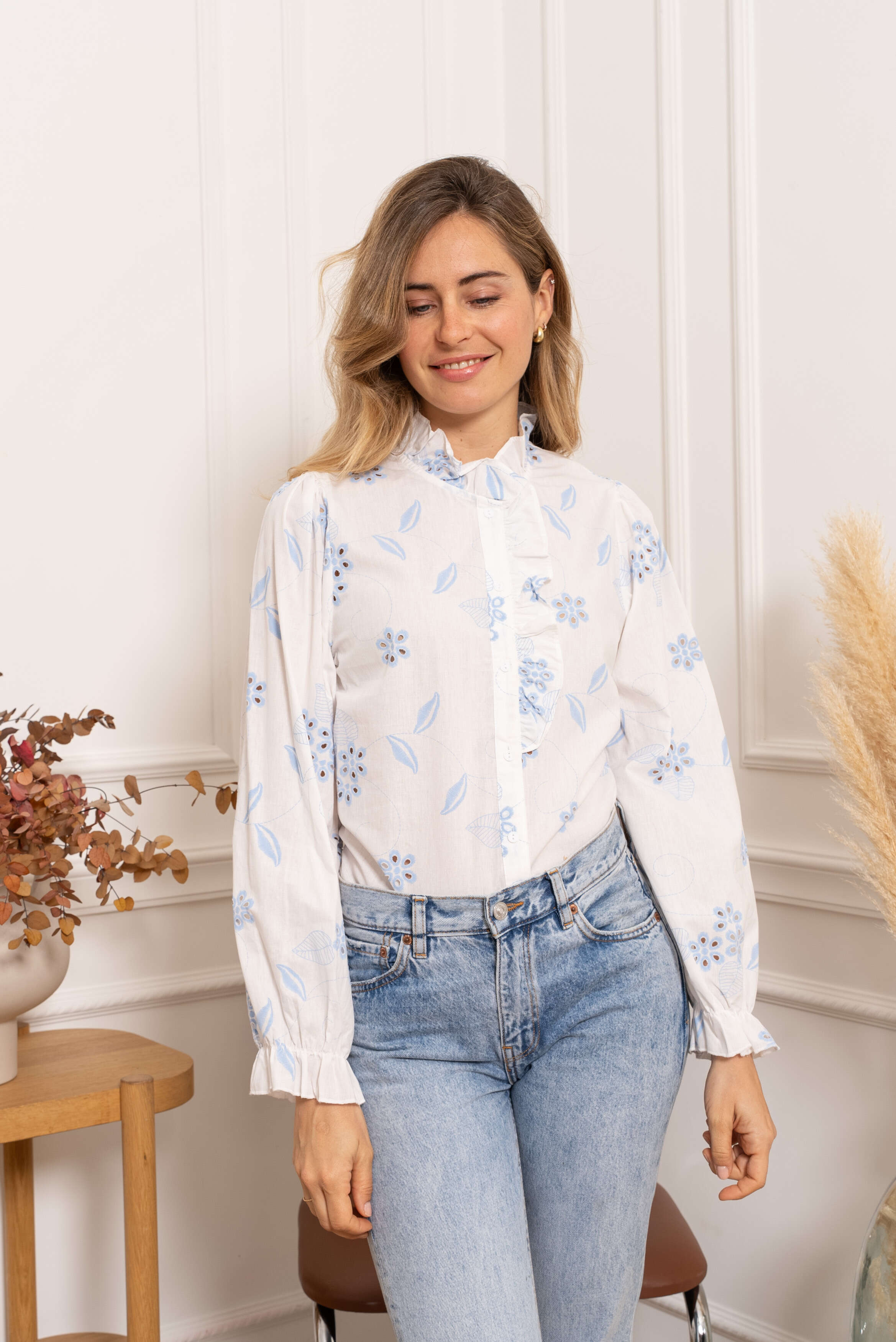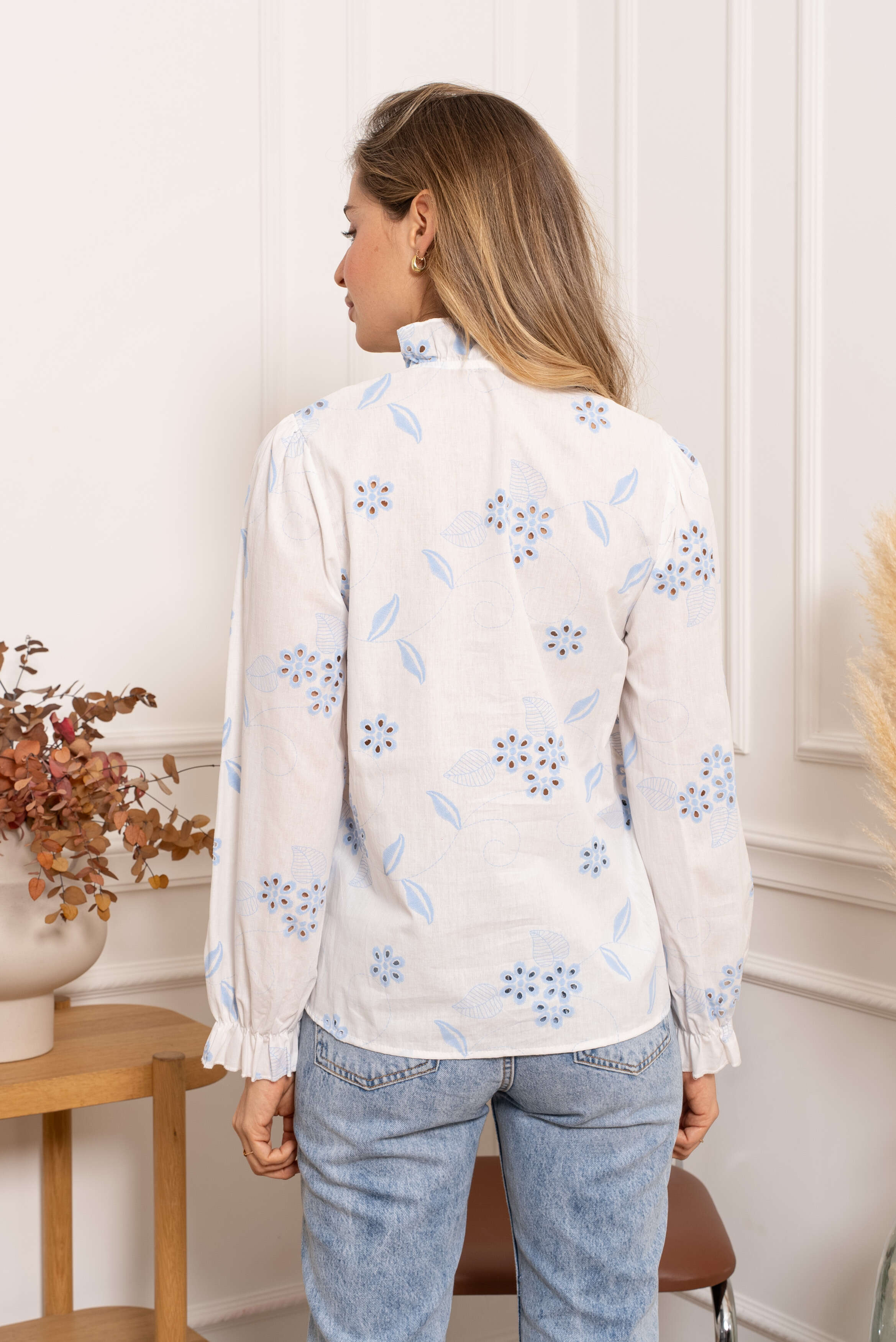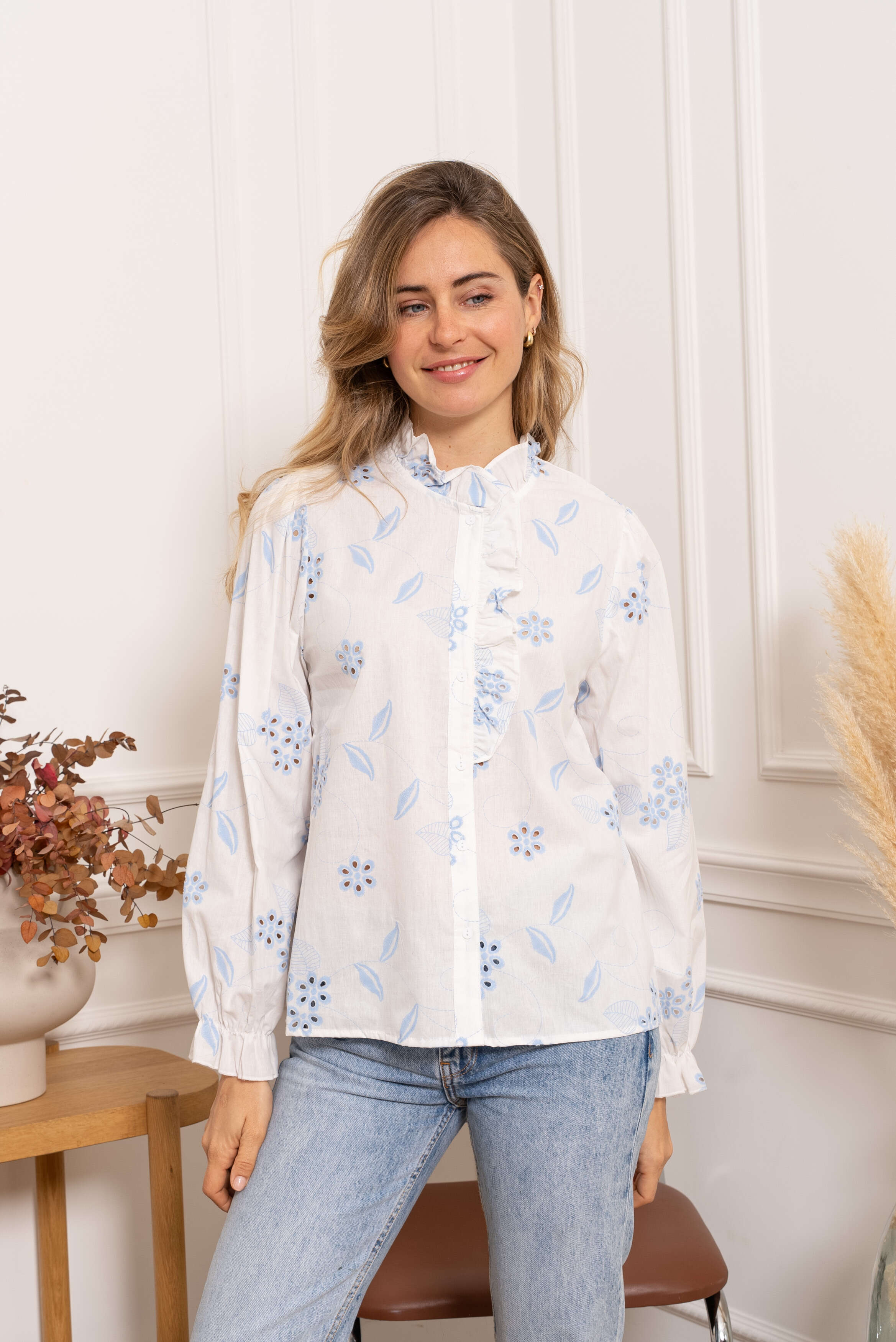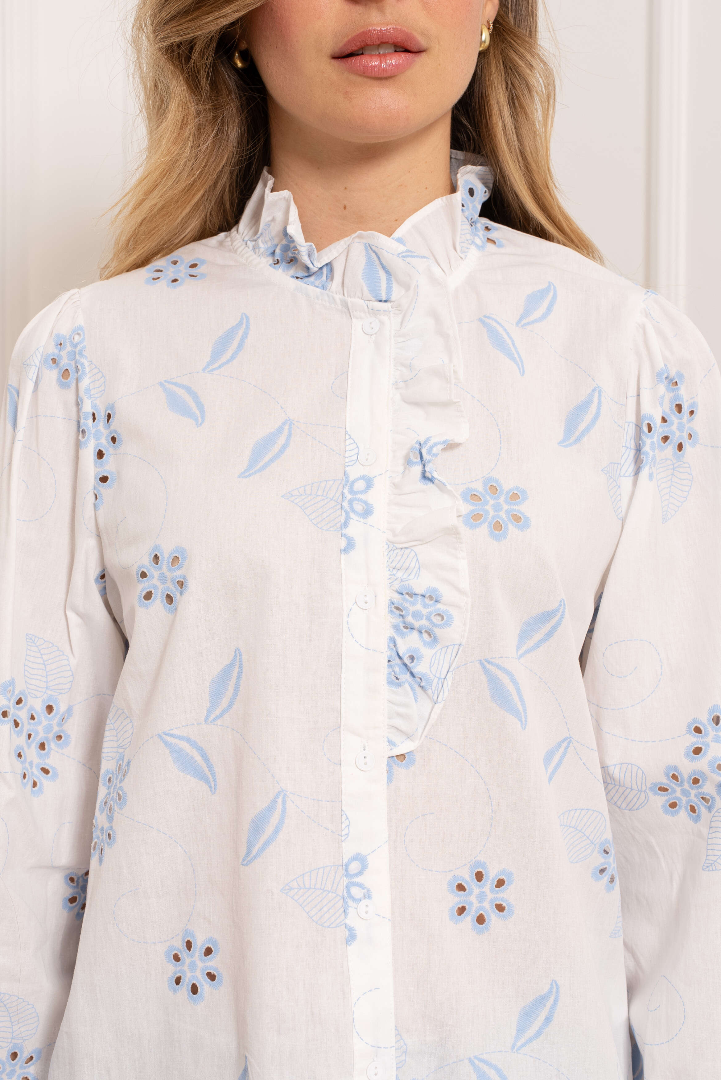 Subtelna koszula z białej, przewiewnej tkaniny, zdobiona delikatnym haftem i falbanką przy kołnierzu – kobiecy akcent do każdej stylizacji.