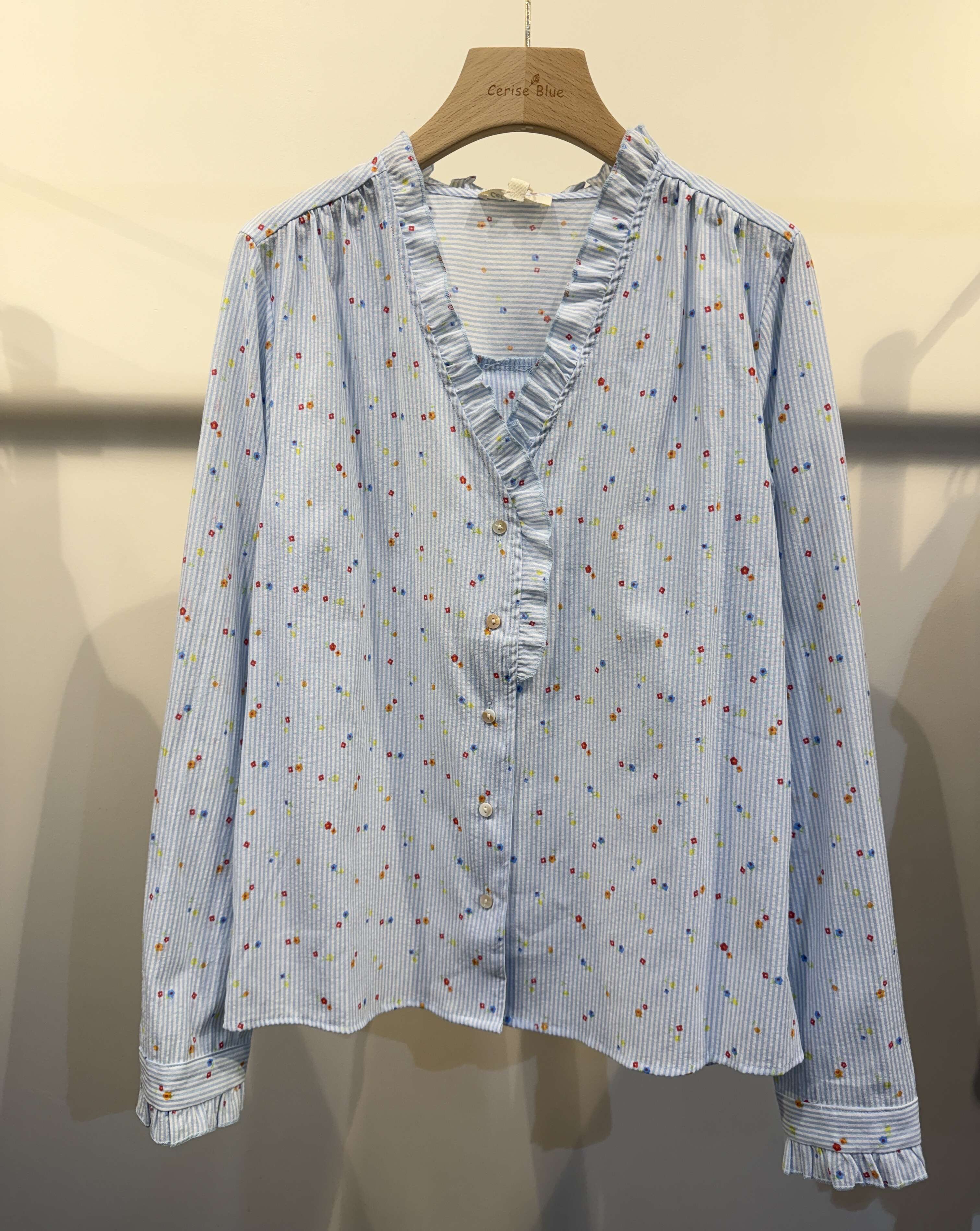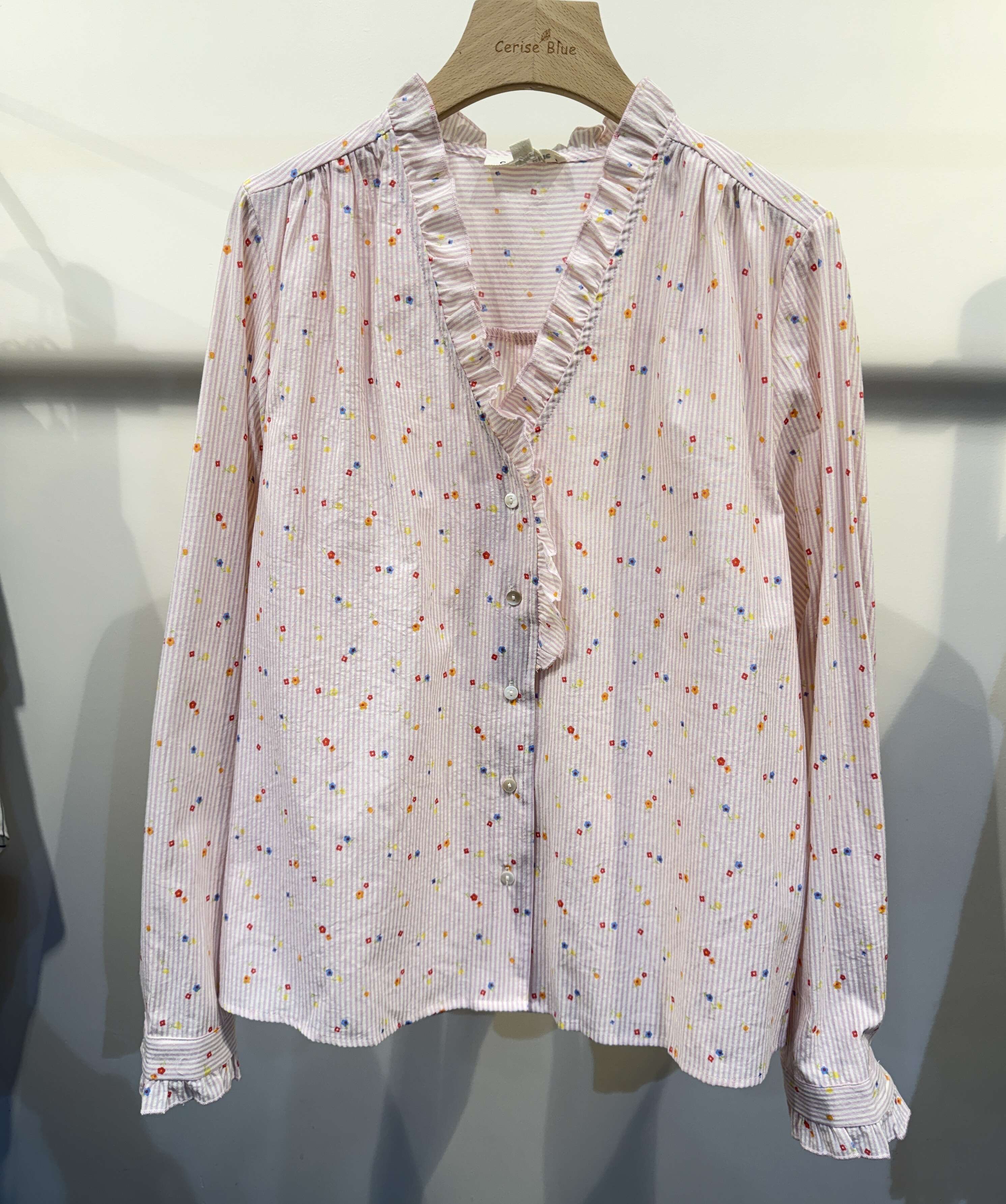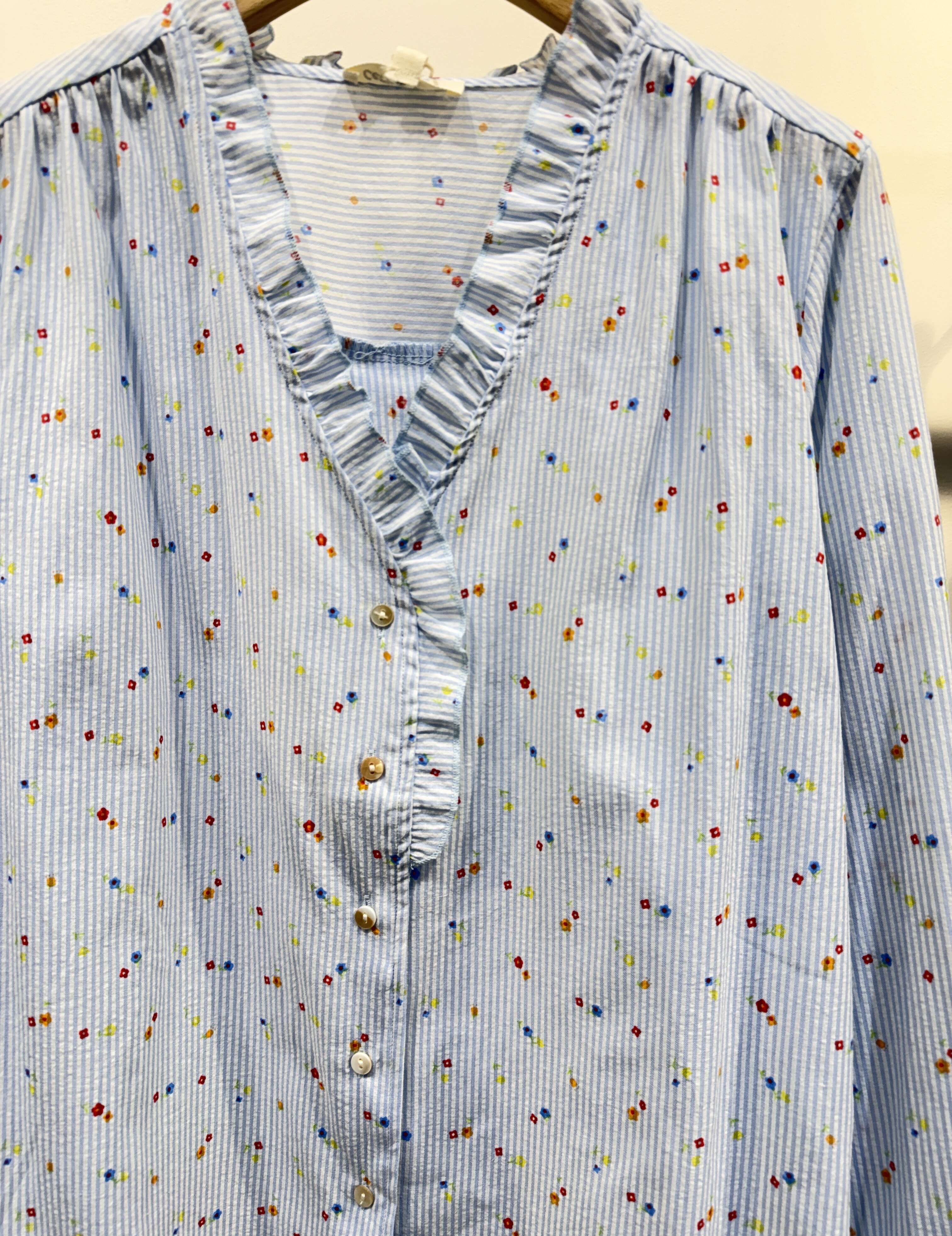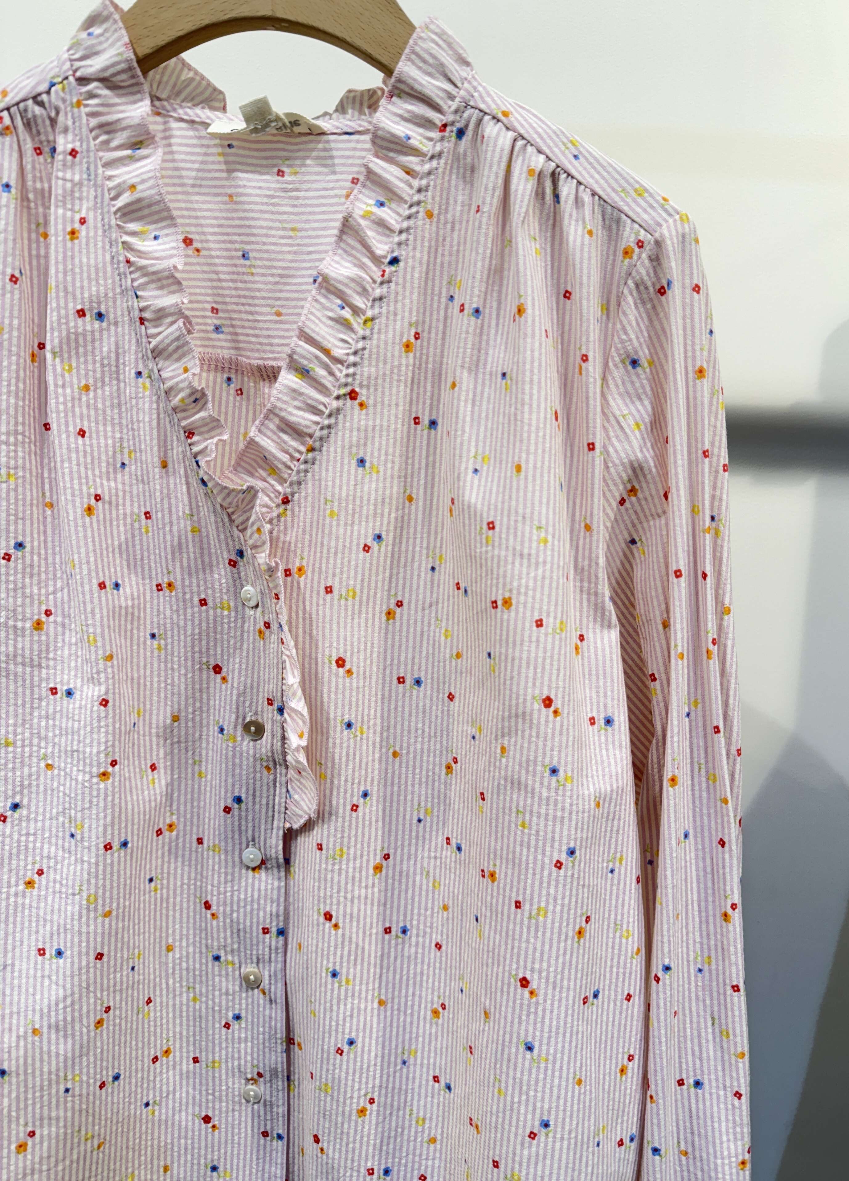 Zwiewna koszula o klasycznym kroju z delikatnym printem w kwiaty, ozdobiona subtelną falbanką przy dekolcie i mankietach, zapewniająca komfort i kobiecy styl.