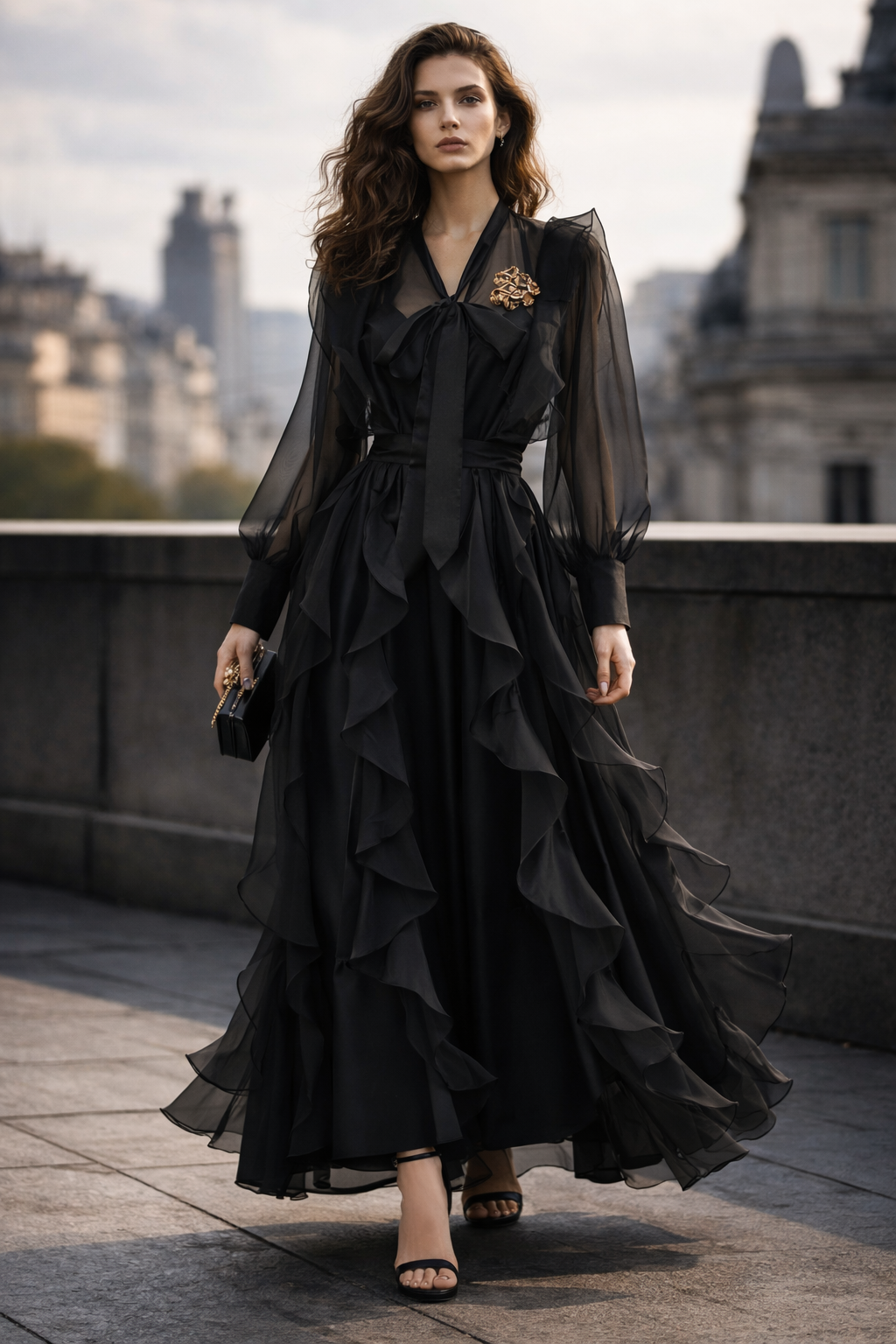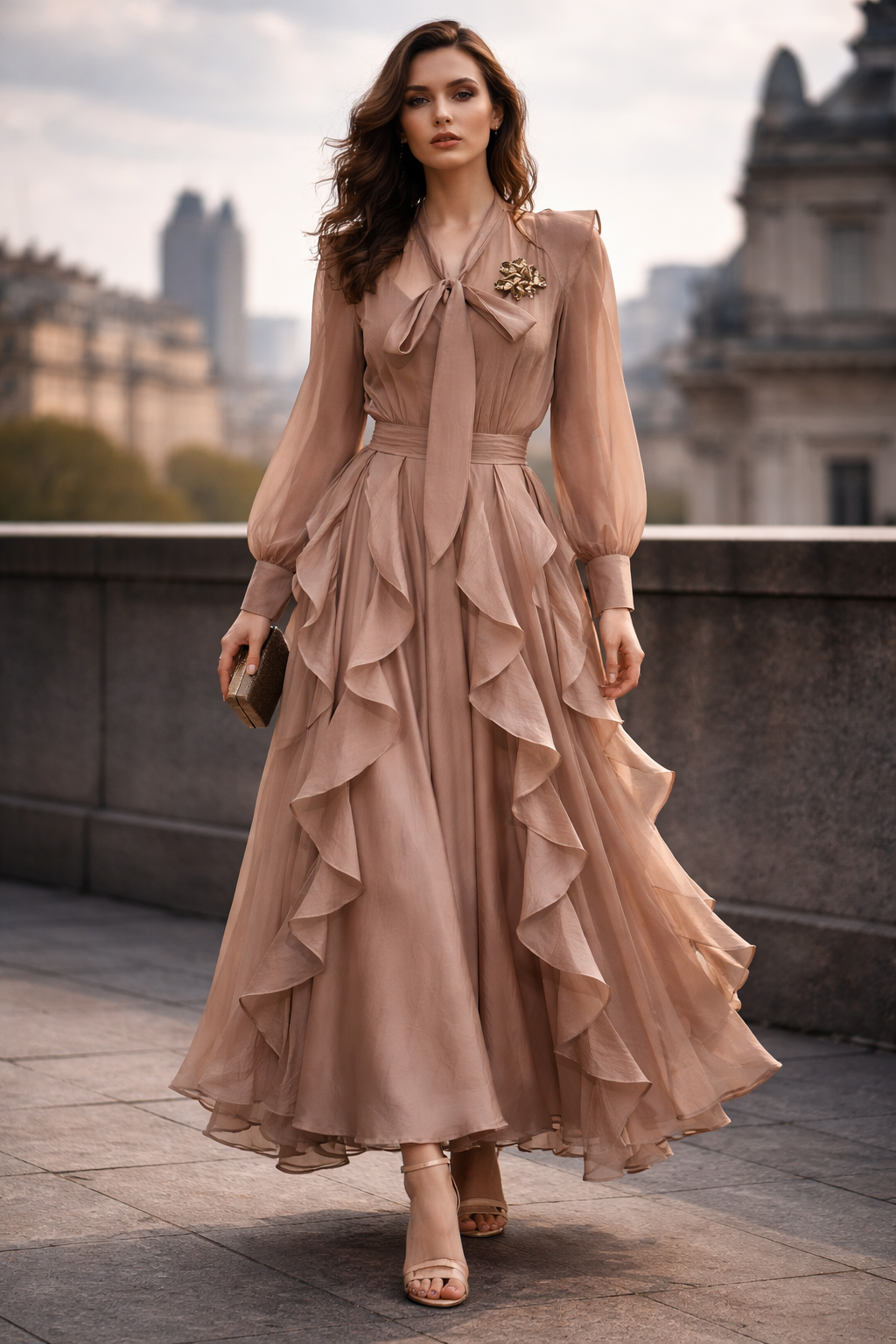 Zwiewna maxi z romantycznymi falbanami, kokardą przy dekolcie i długim rękawem – elegancja i wygoda w jednym.