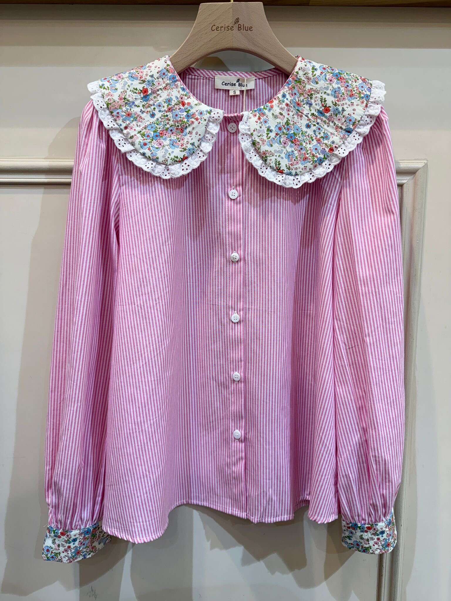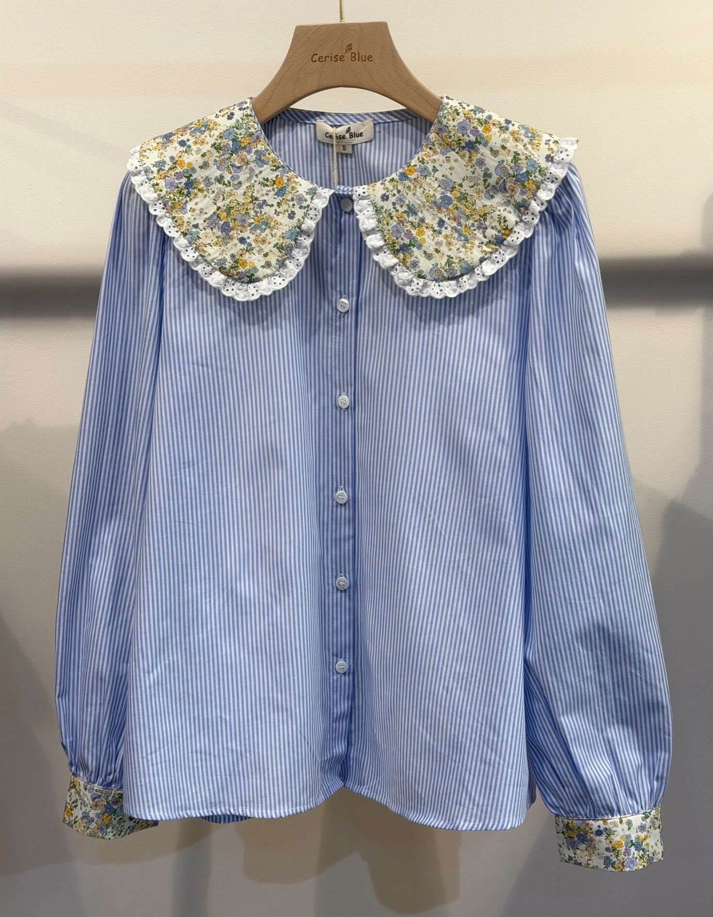 Subtelna koszula w paski z efektownym, szerokim kołnierzem w kwiaty i mankietami wykończonymi florystycznym akcentem. Lekka, przewiewna, idealna na wiosnę i lato.