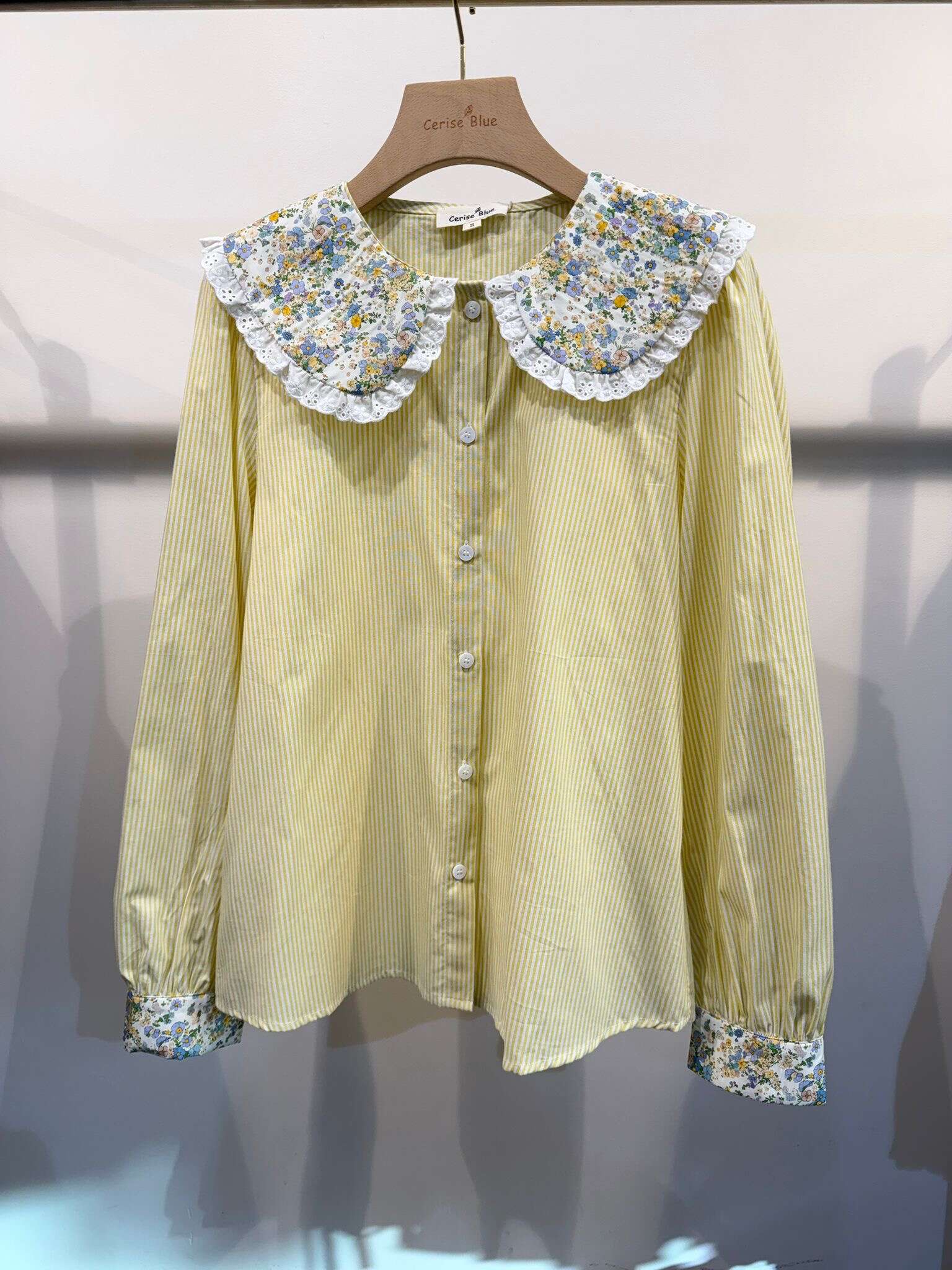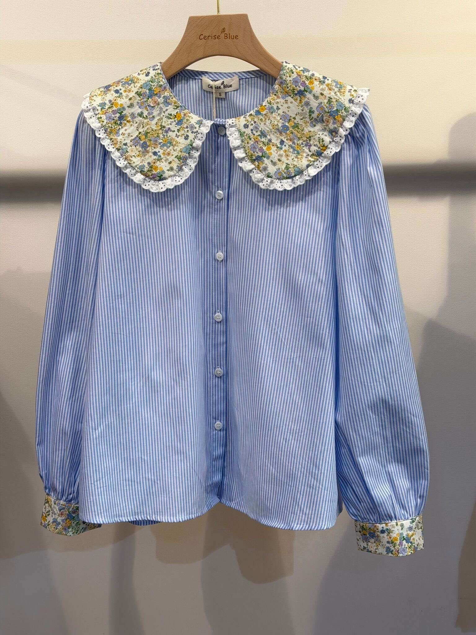 Subtelna koszula w paski z efektownym, szerokim kołnierzem w kwiaty i mankietami wykończonymi florystycznym akcentem. Lekka, przewiewna, idealna na wiosnę i lato.