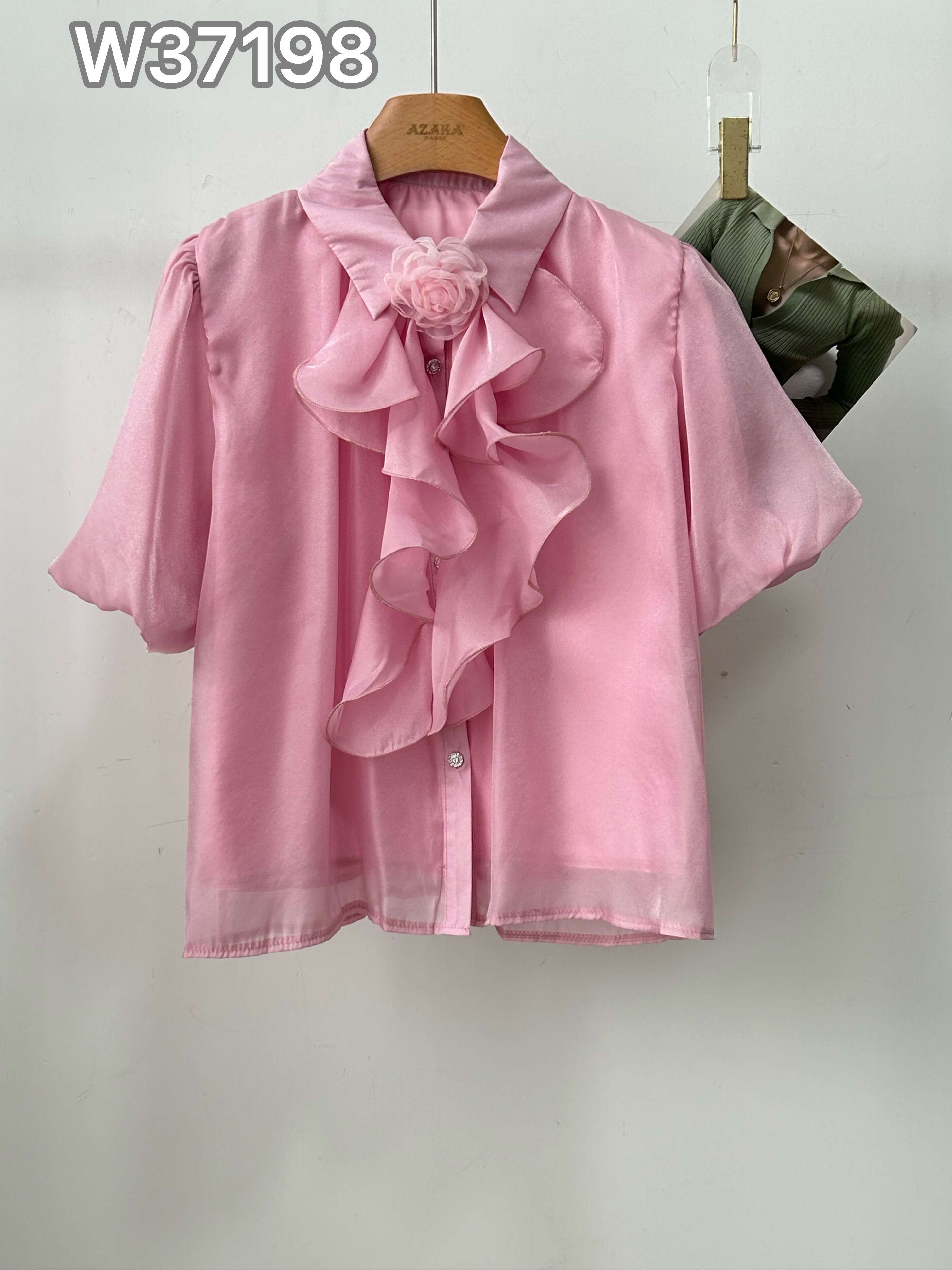 Elegancka koszula z krótkim rękawem i efektowną falbaną, wykonana z lekkiego, delikatnego materiału. Stylowy kołnierzyk z ozdobą i zwiewny fason dla najwyższego komfortu.