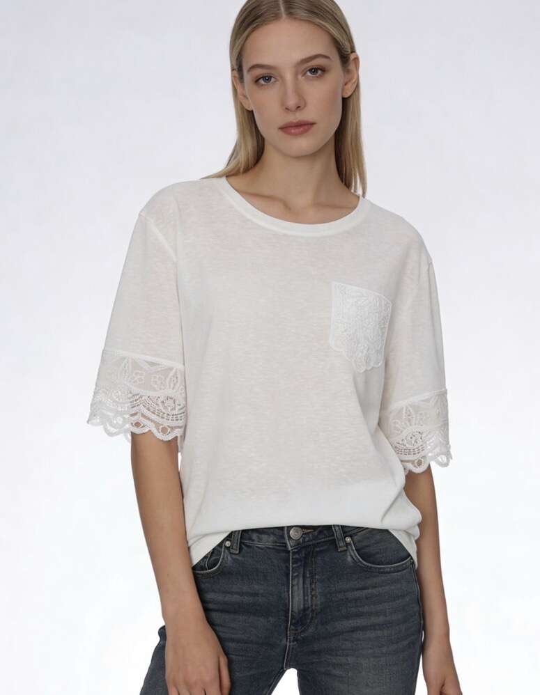 Bluzka o luźnym kroju z koronkowymi rękawami i kieszonką, wykonana z miękkiej bawełny, zapewniająca wygodę i kobiecy styl.