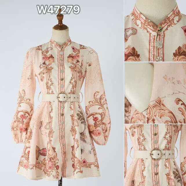Zjawiskowa sukienka o kobiecym kroju z beżowym tłem, ozdobiona efektownym, barokowym wzorem i pasującym paskiem w talii.