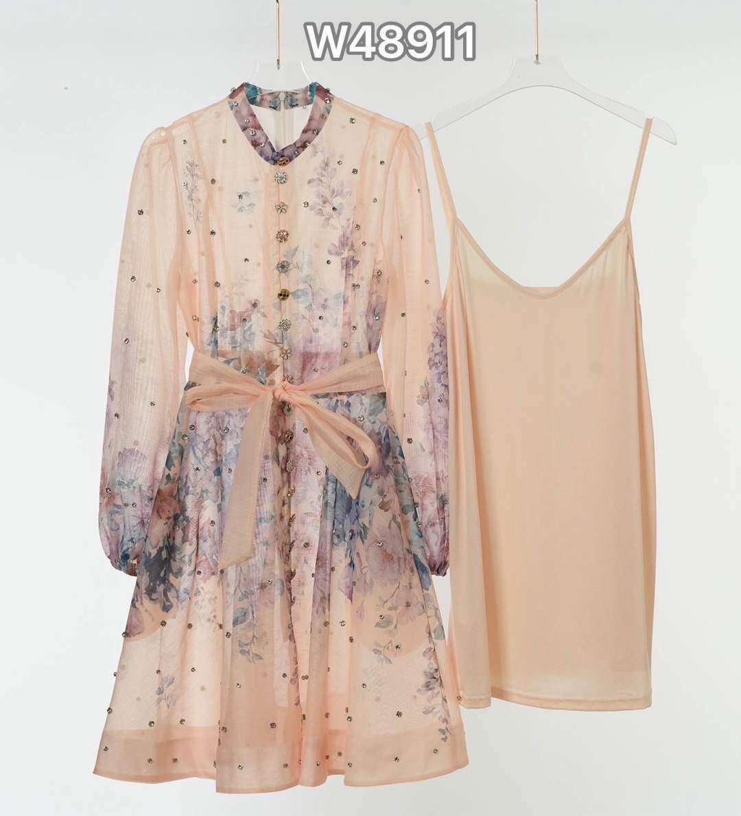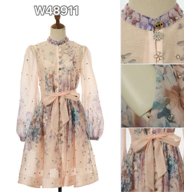 Zwiewna sukienka o pastelowym, różowym odcieniu z romantycznym printem kwiatowym, zdobiona subtelnymi koralikami oraz satynową kokardą w talii. Lekka, wygodna i niezwykle kobieca – idealna na wiosnę i lato.