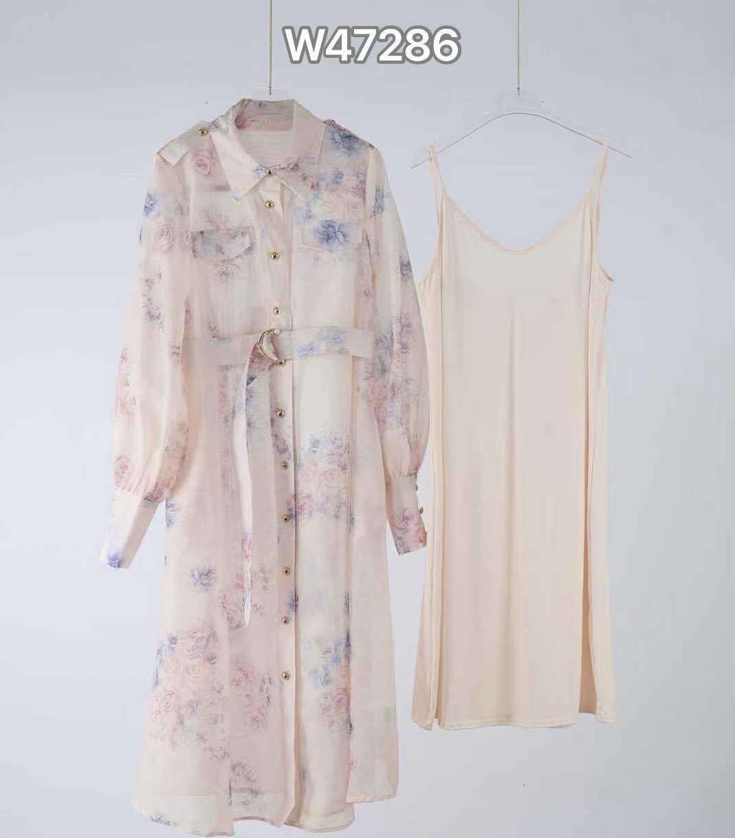 Dwuczęściowa sukienka w delikatny kwiatowy wzór, z eleganckim paskiem i lekkim, beżowym spodem. Idealna na wiosenne stylizacje.