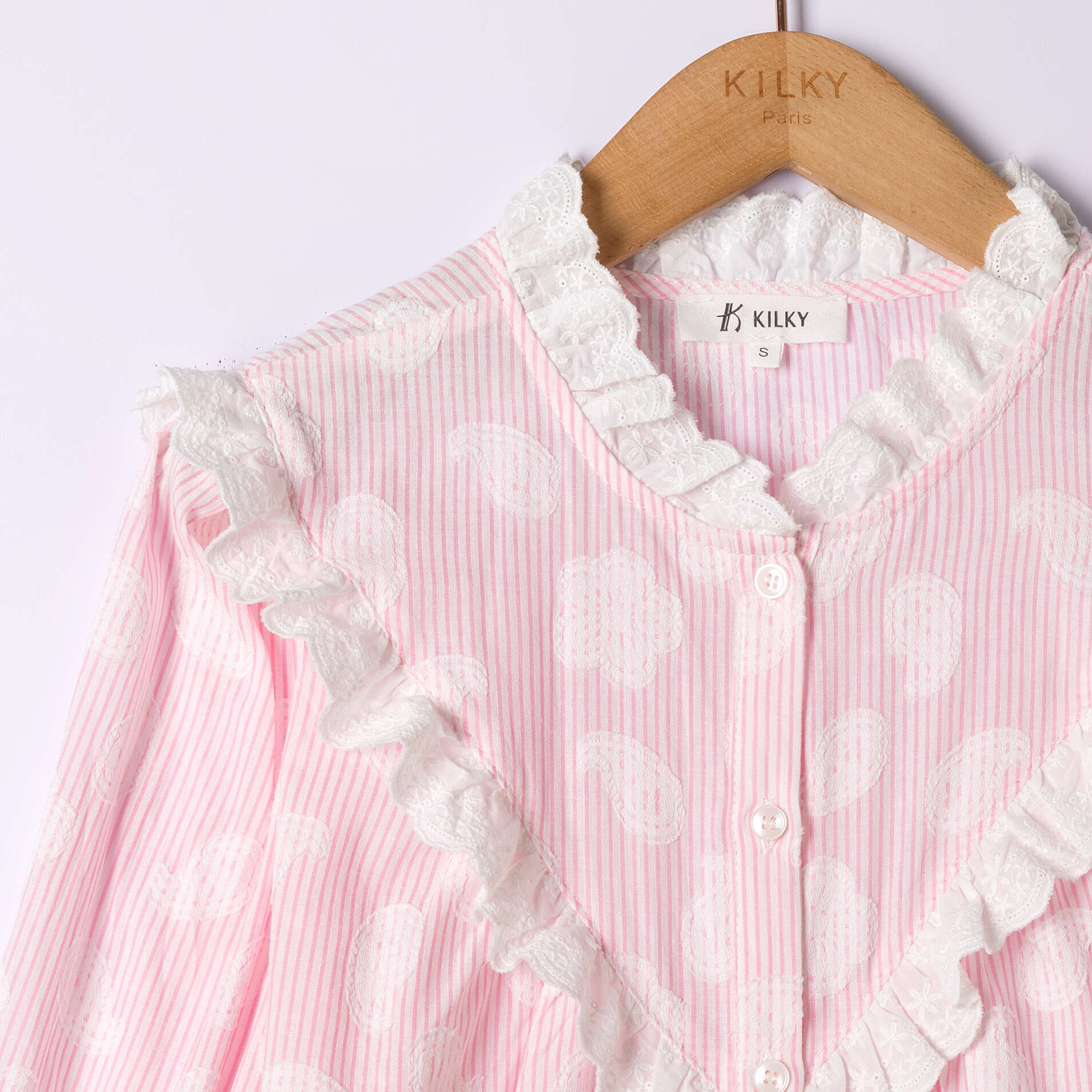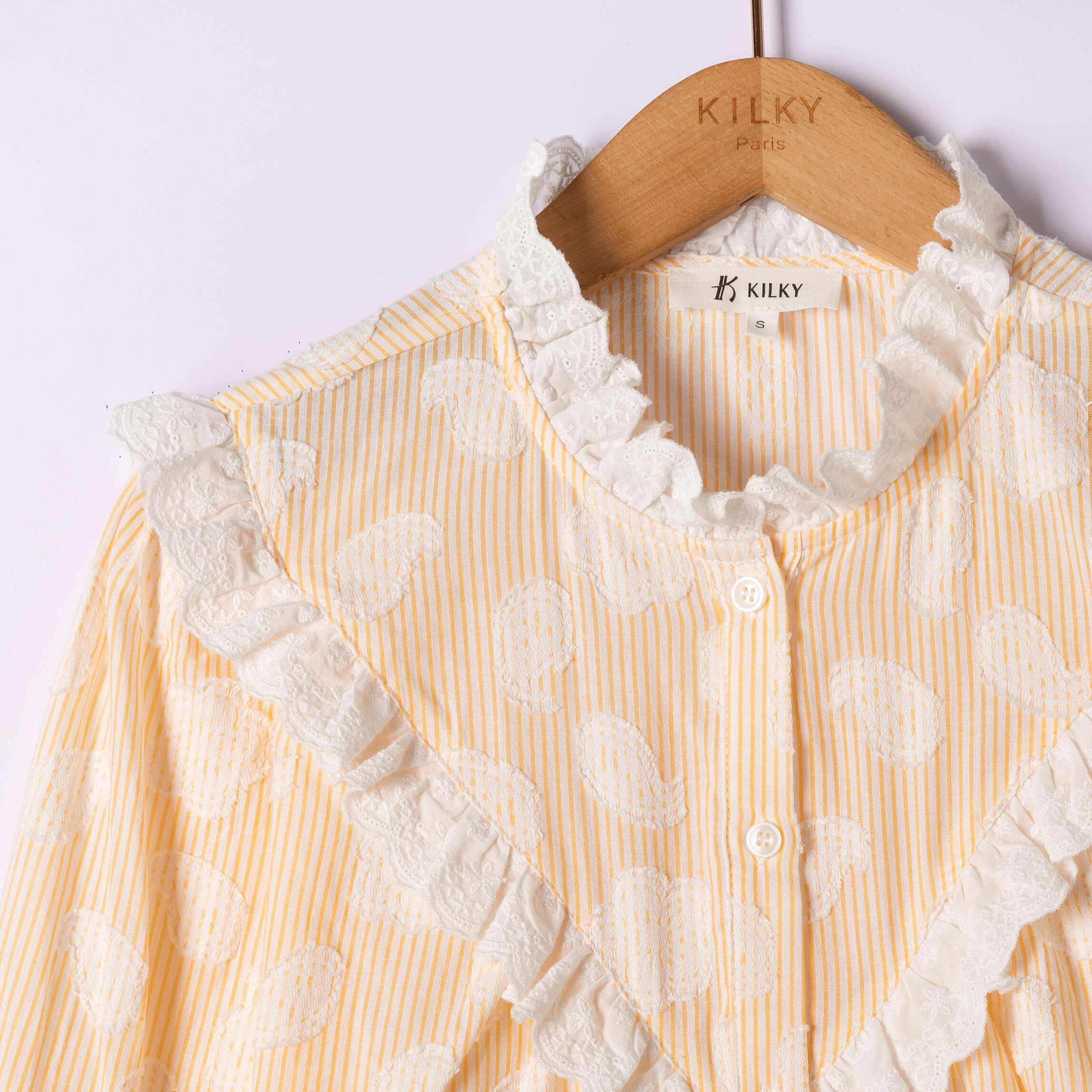 Subtelna koszula z falbanką i delikatnym wzorem, wykonana z lekkiego, oddychającego materiału.