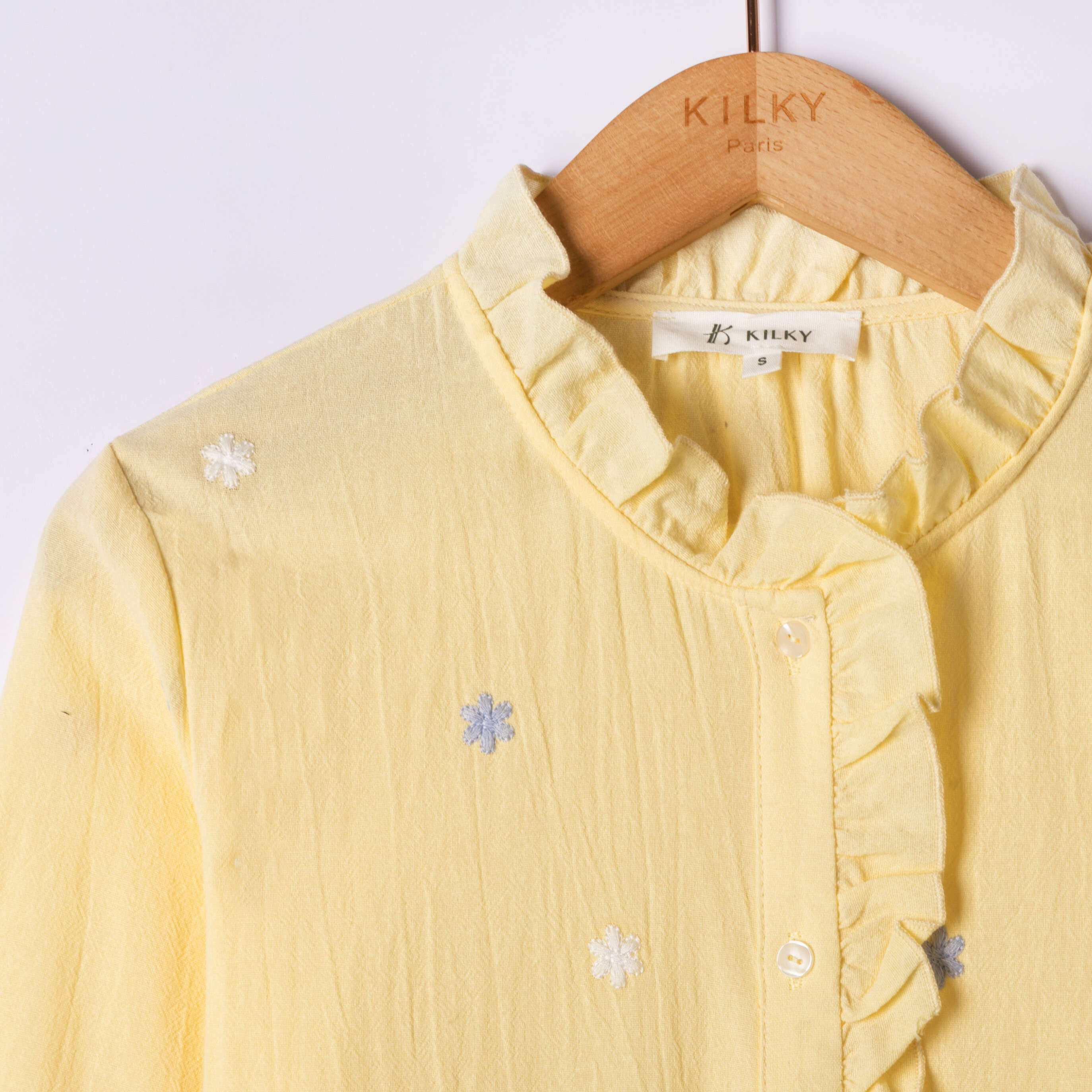 Romantyczny fason z falbanką, długie rękawy wykończone gumką, delikatny haft w kształcie kwiatków; wygodny, lekki materiał.