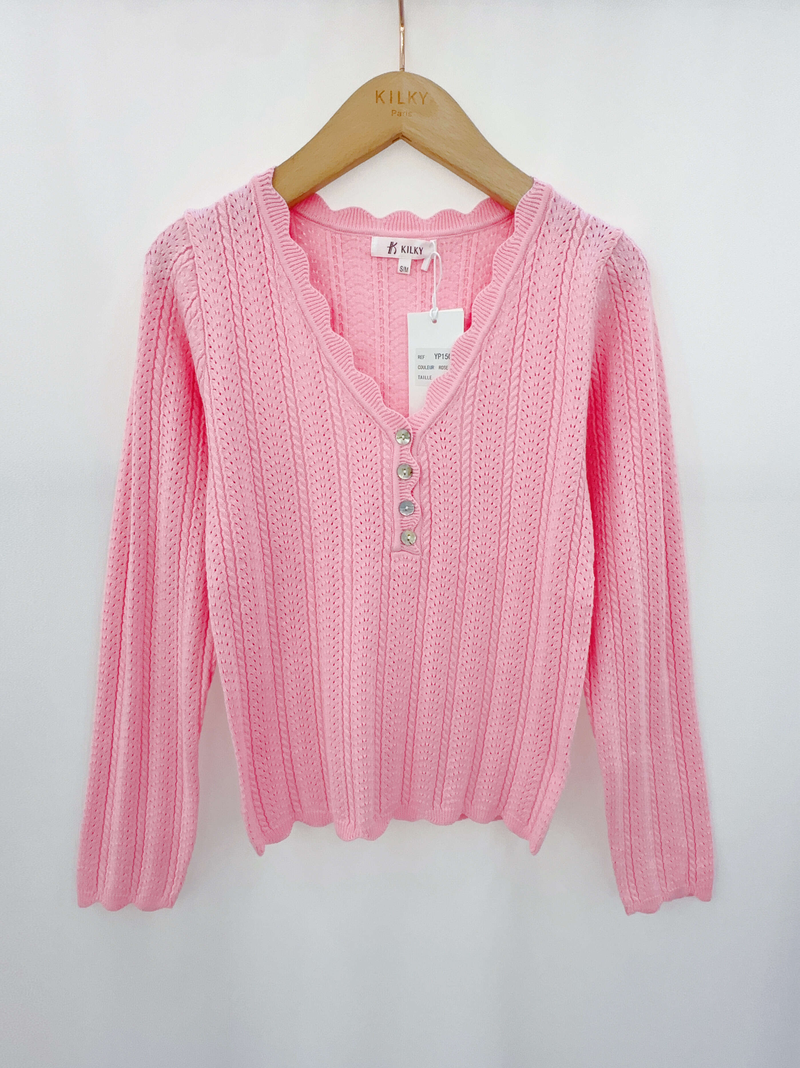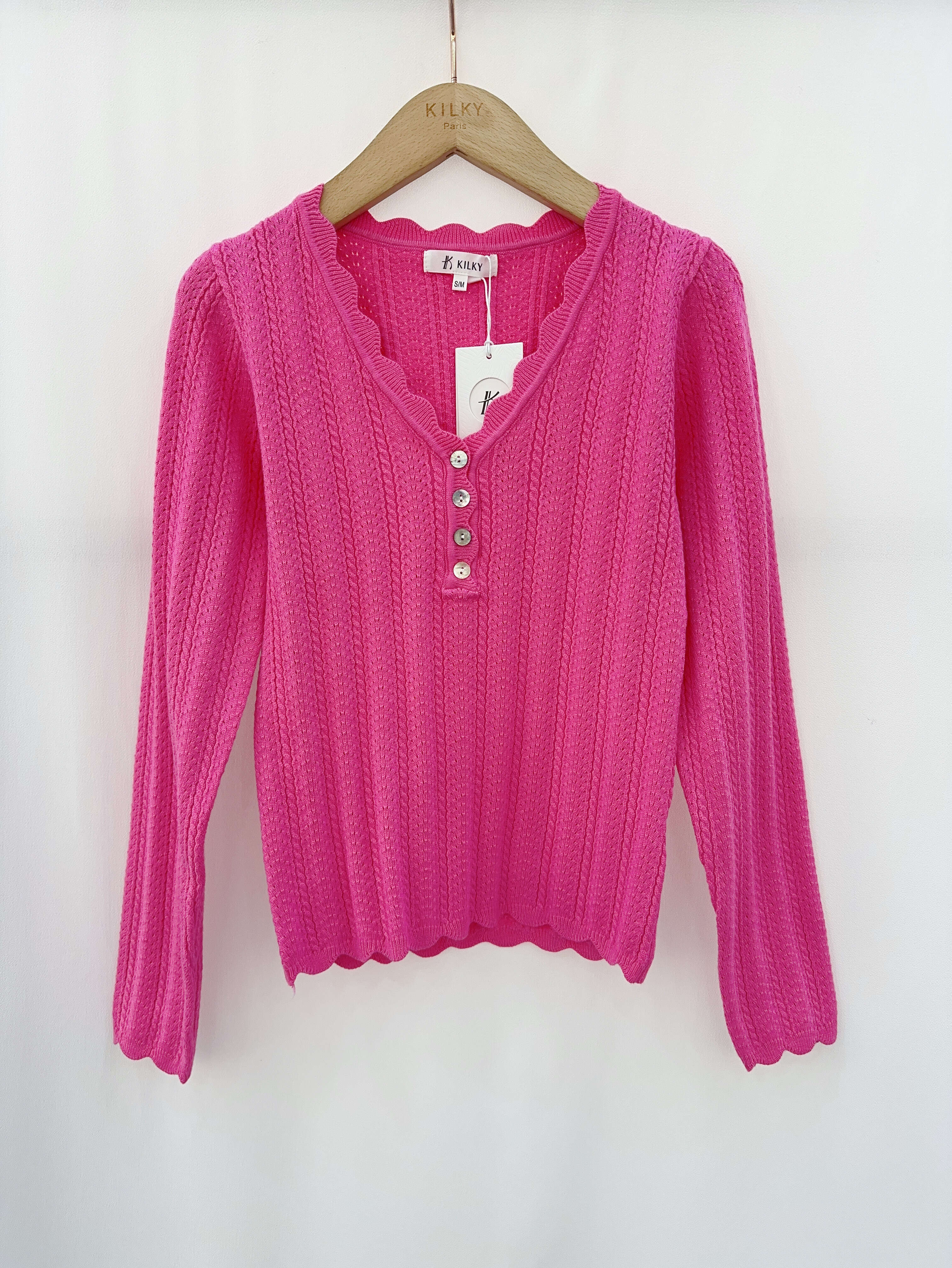Modna bluzka z ażurowym splotem, dekoltem w serek i perłowymi guzikami. Idealna na co dzień i do eleganckich stylizacji.