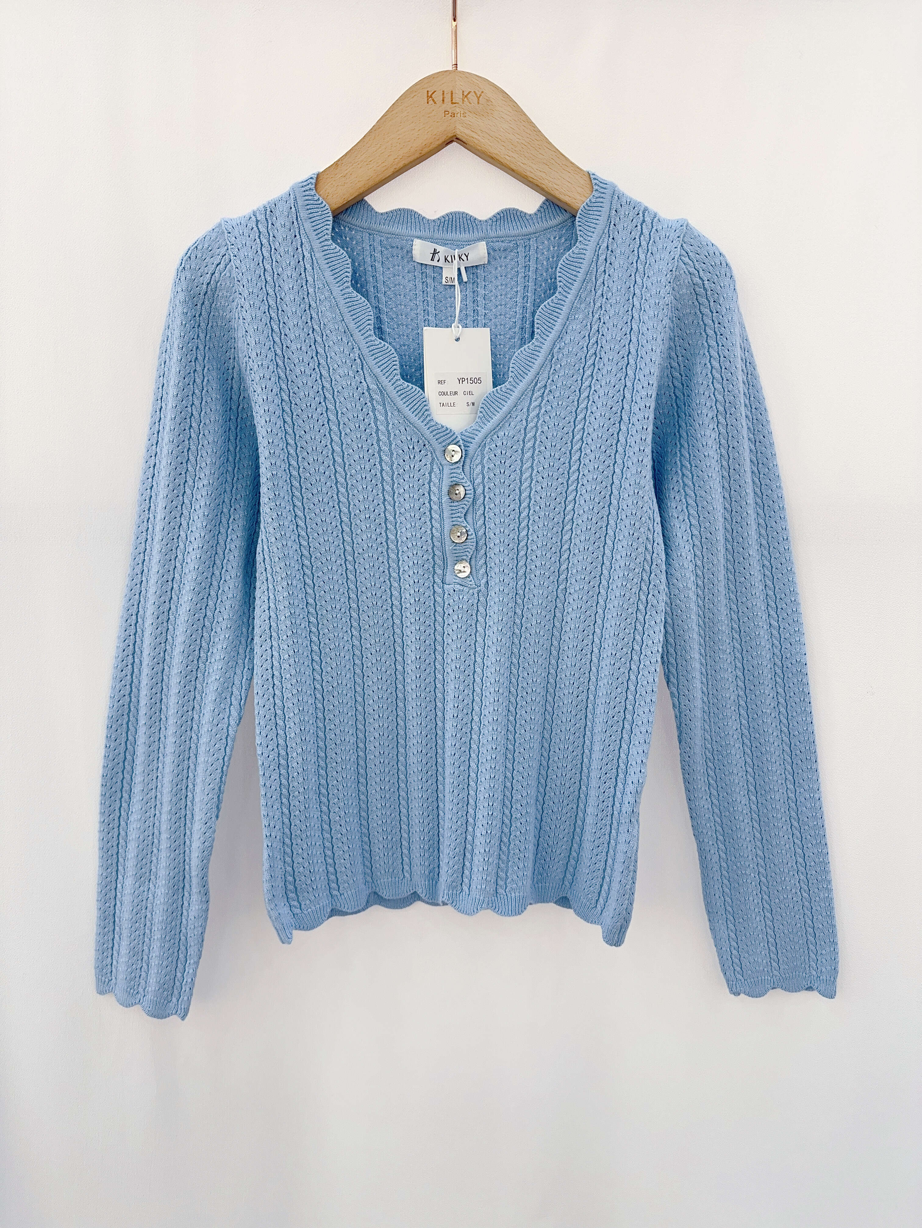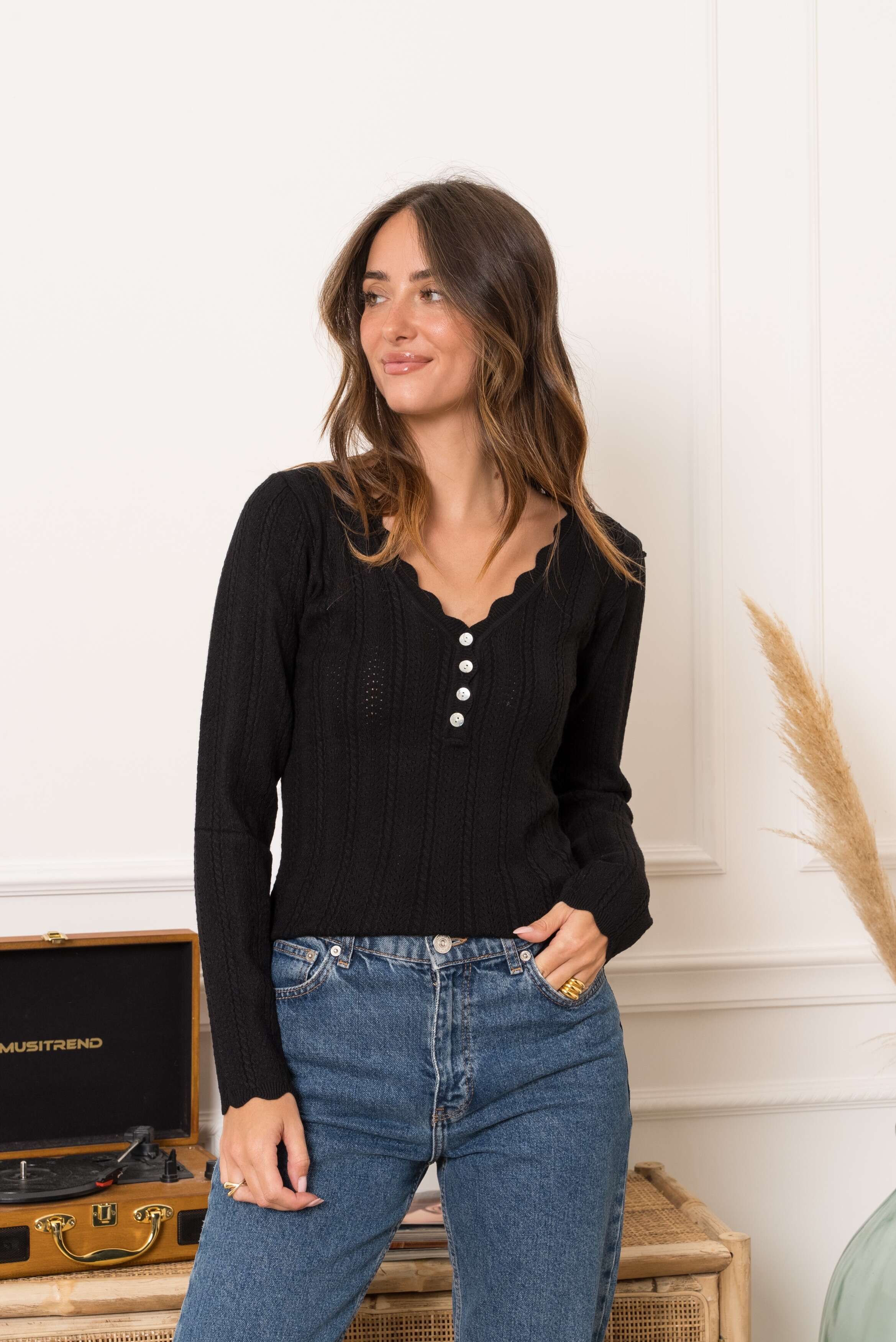 Modna bluzka z ażurowym splotem, dekoltem w serek i perłowymi guzikami. Idealna na co dzień i do eleganckich stylizacji.
