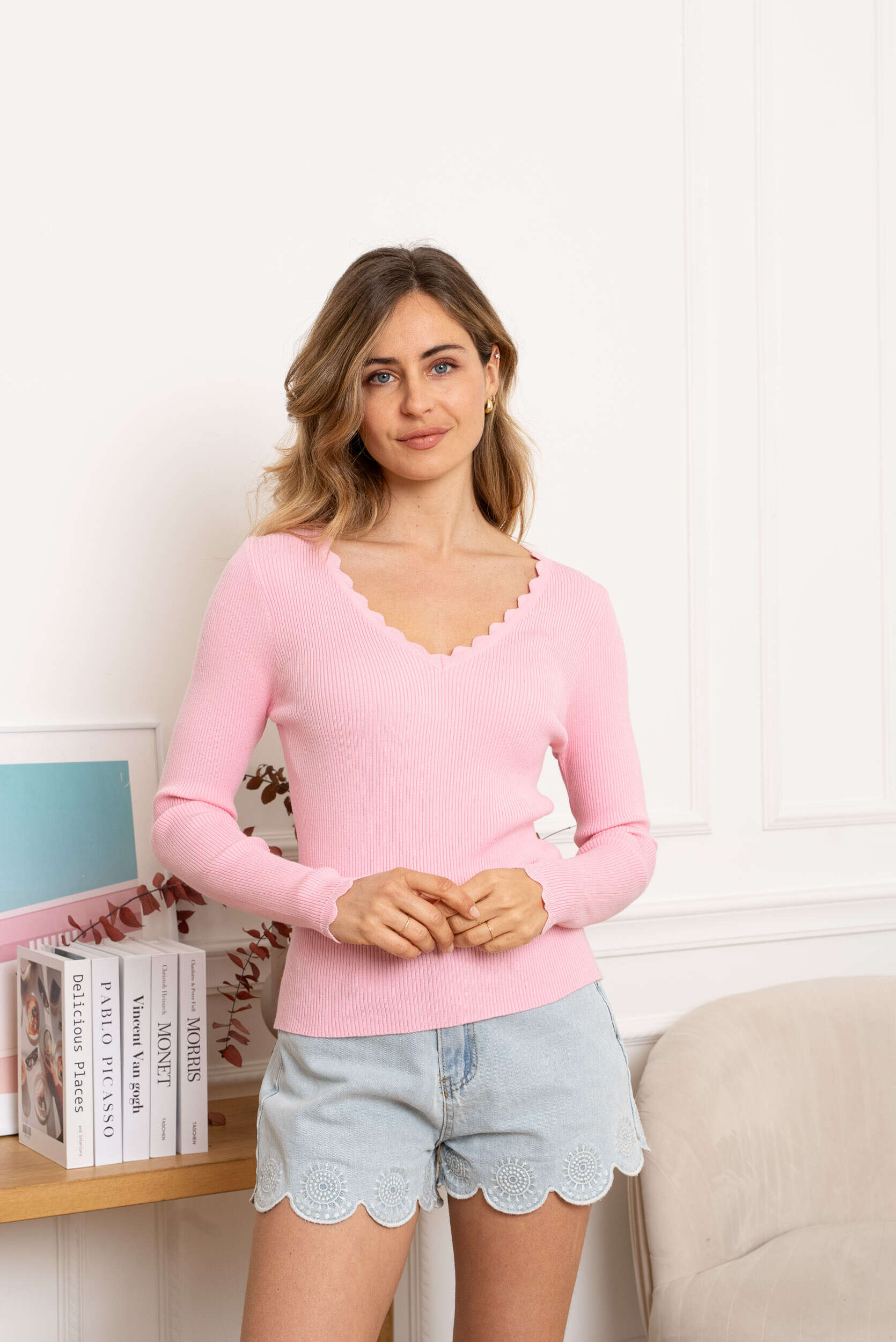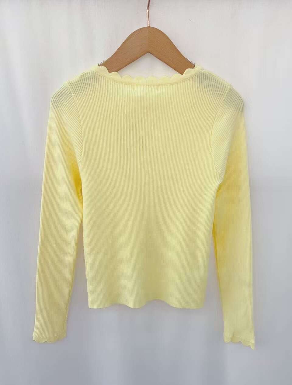 Prążkowana bluzka z długim rękawem i efektownym falowanym dekoltem – wygoda i styl na co dzień.