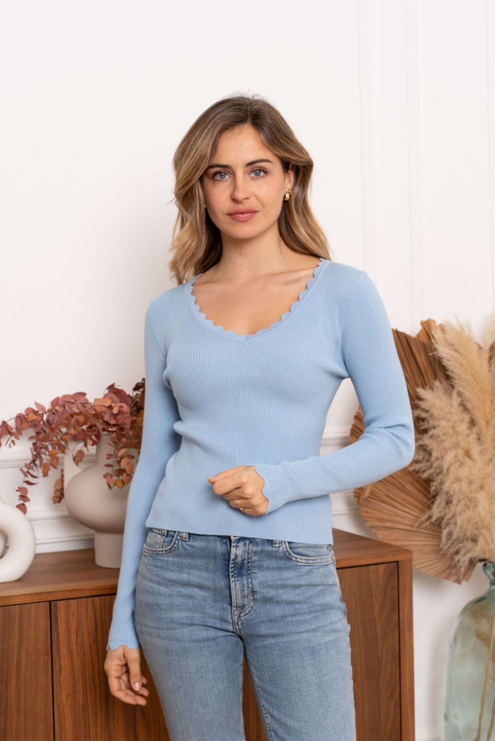 Prążkowana bluzka z długim rękawem i efektownym falowanym dekoltem – wygoda i styl na co dzień.