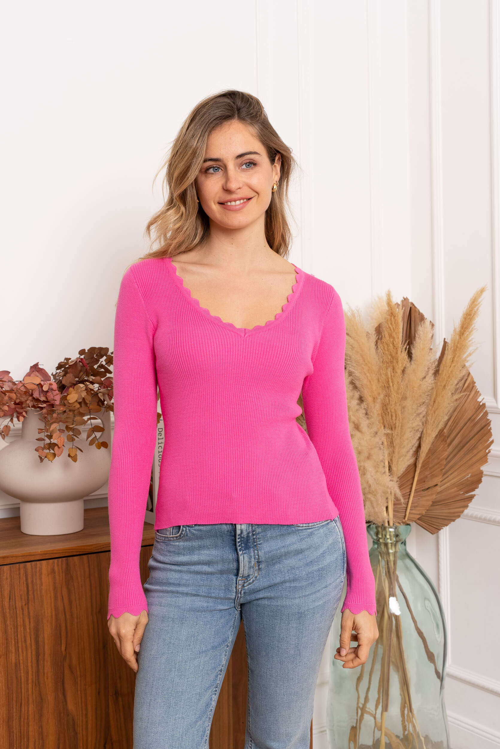 Prążkowana bluzka z długim rękawem i efektownym falowanym dekoltem – wygoda i styl na co dzień.