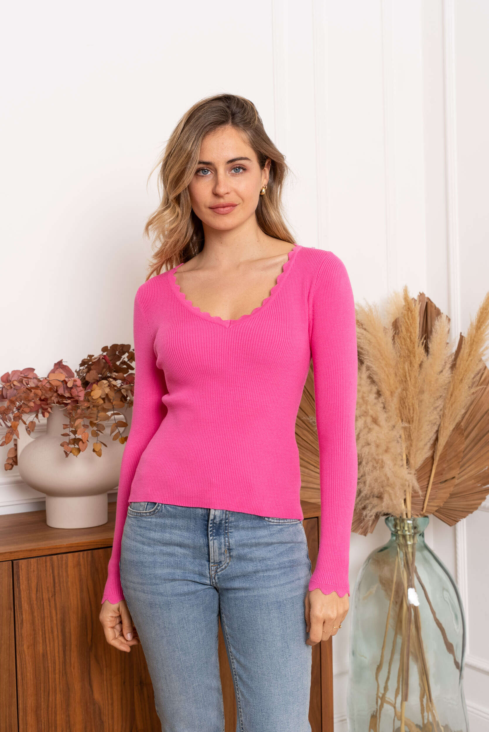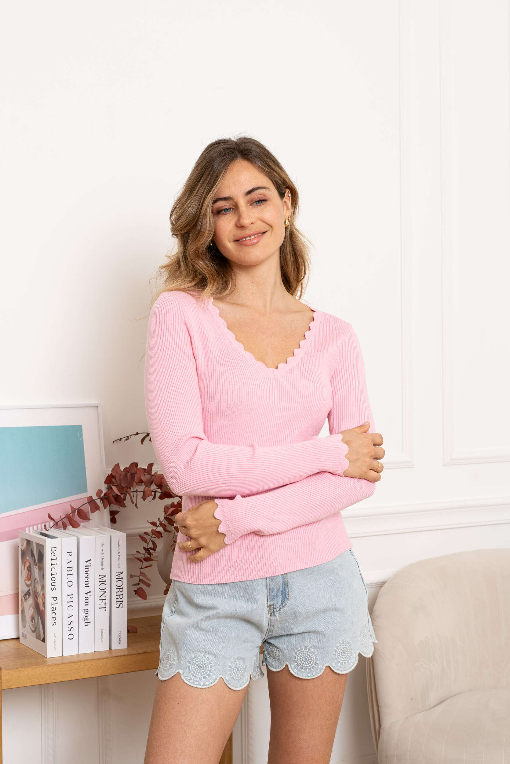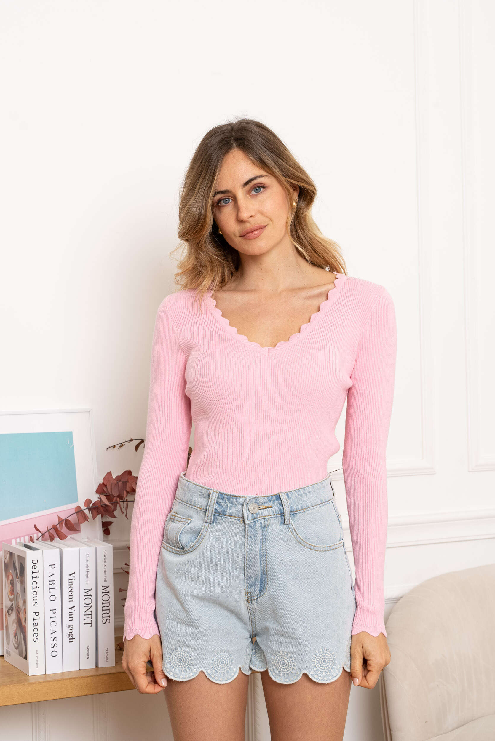 Prążkowana bluzka z długim rękawem i efektownym falowanym dekoltem – wygoda i styl na co dzień.