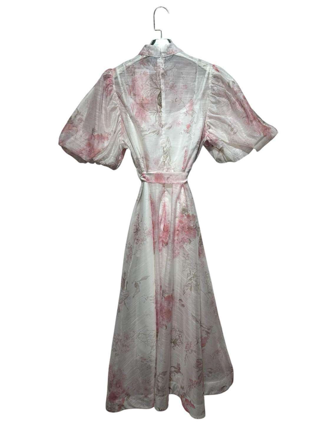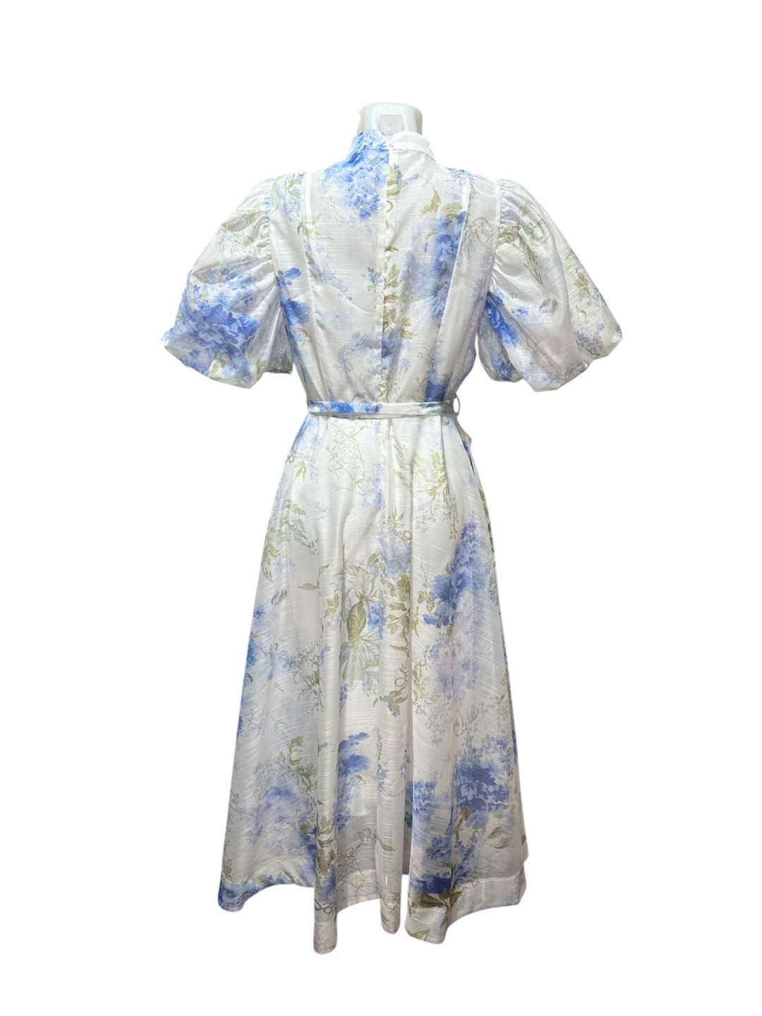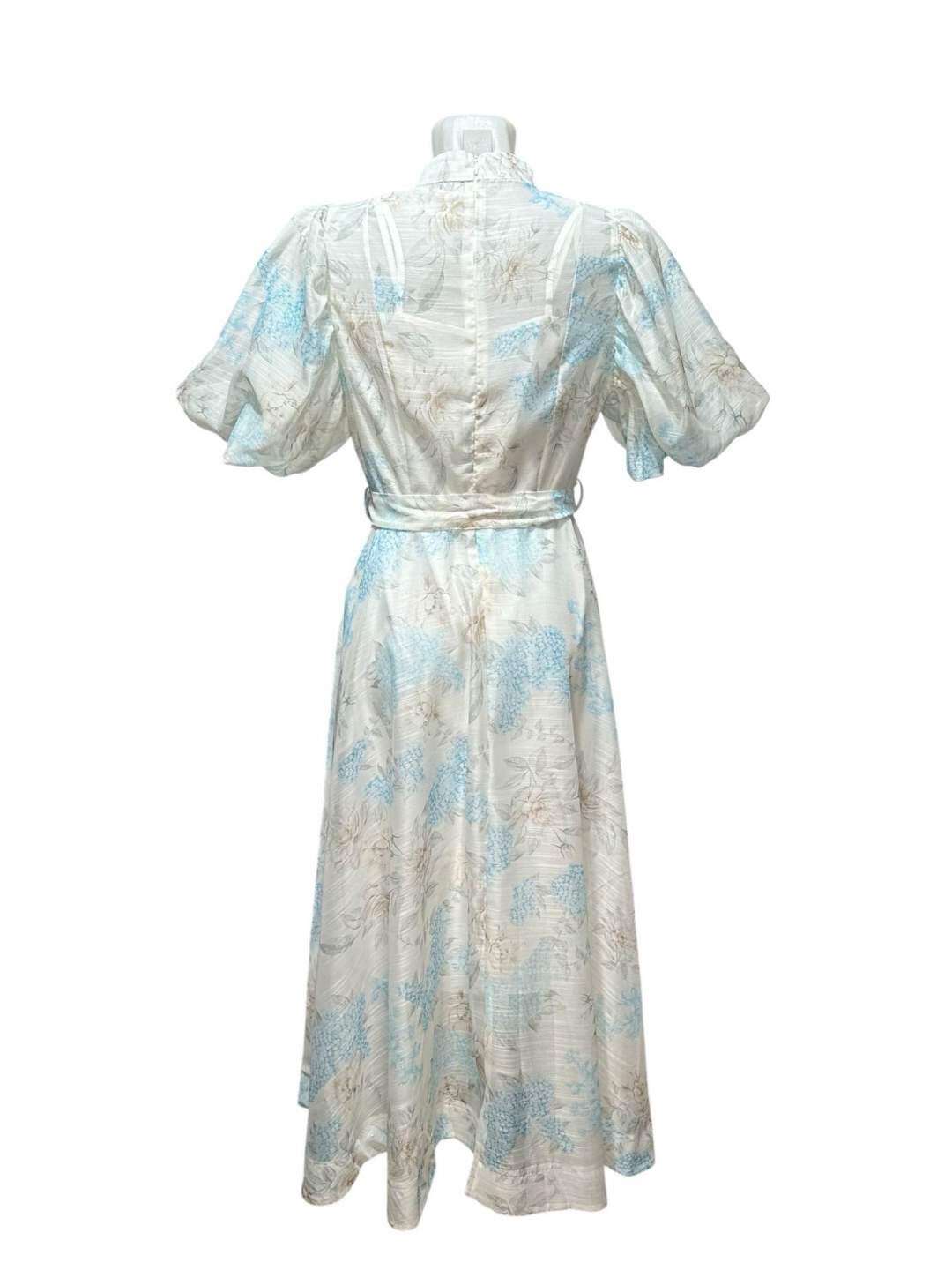 Zwiewna sukienka z lekkiego materiału, z wiązaniem w talii i stylowymi guziczkami, zapewnia swobodę ruchów oraz kobiecy, romantyczny look.