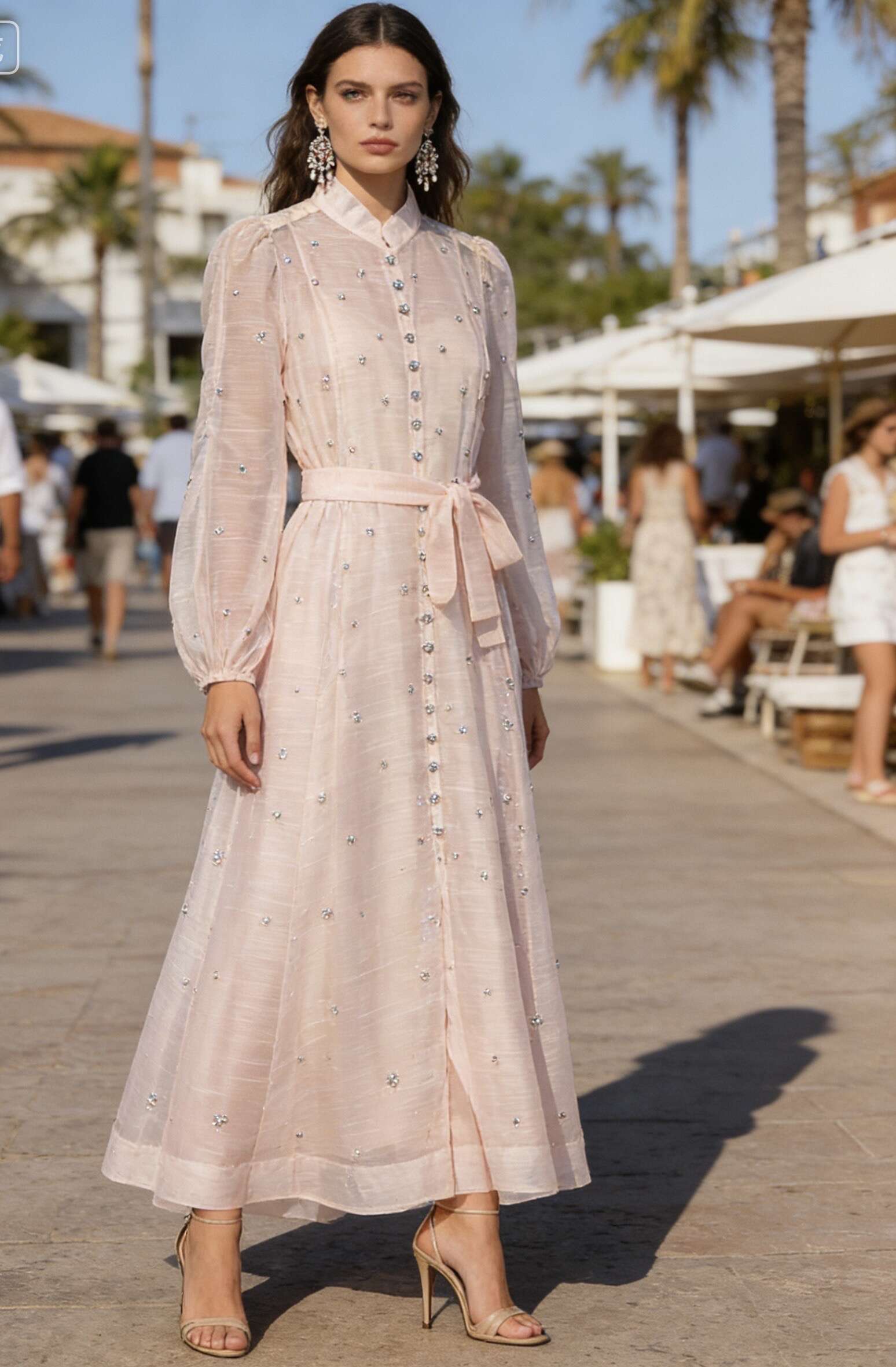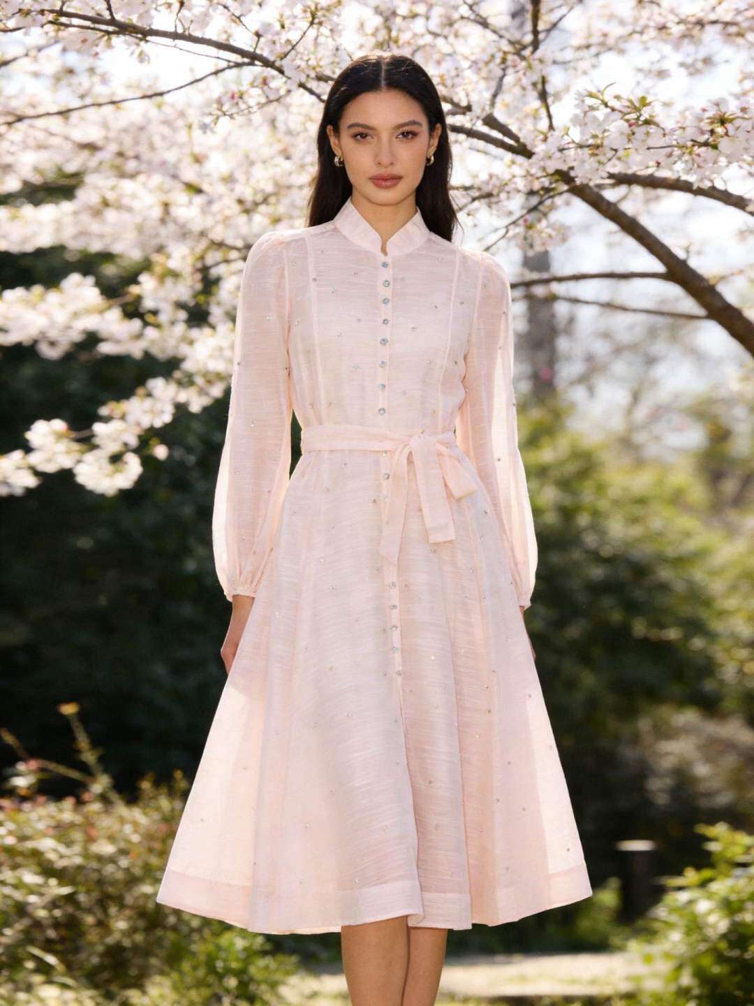 Rozkloszowany krój, lekki, przewiewny materiał, subtelnie zdobione guziki, długie rękawy i pasek w talii.