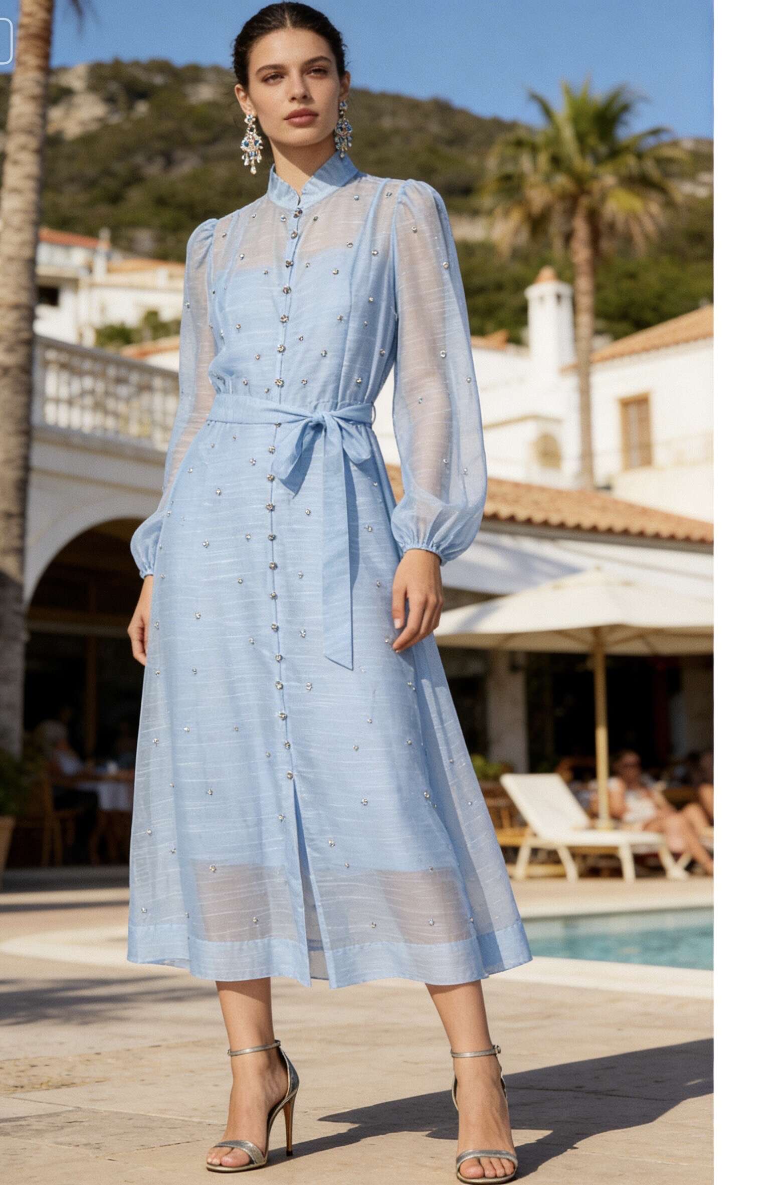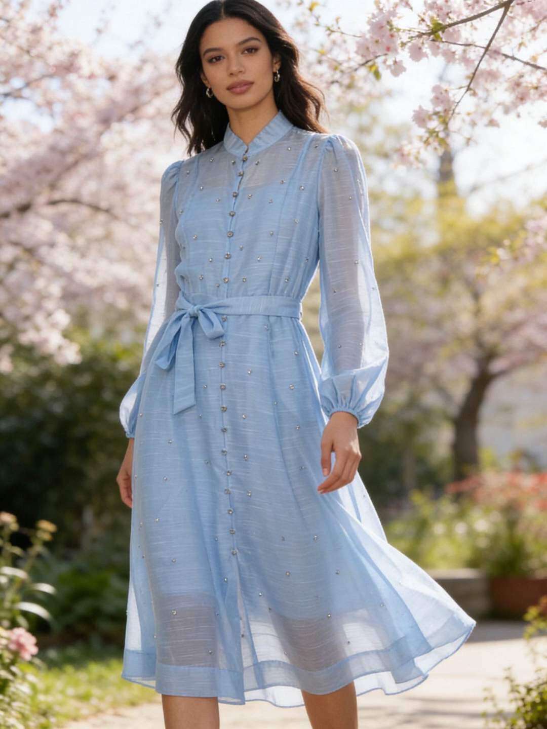 Rozkloszowany krój, lekki, przewiewny materiał, subtelnie zdobione guziki, długie rękawy i pasek w talii.