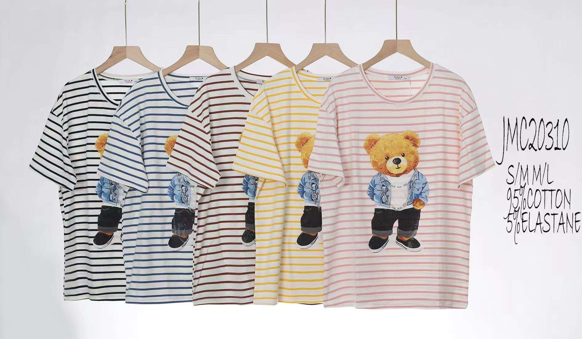 Urocza bluzka z motywem misia, wykonana z miękkiej, elastycznej bawełny. Idealna na co dzień – wygodny krój i modne paski przyciągają wzrok.