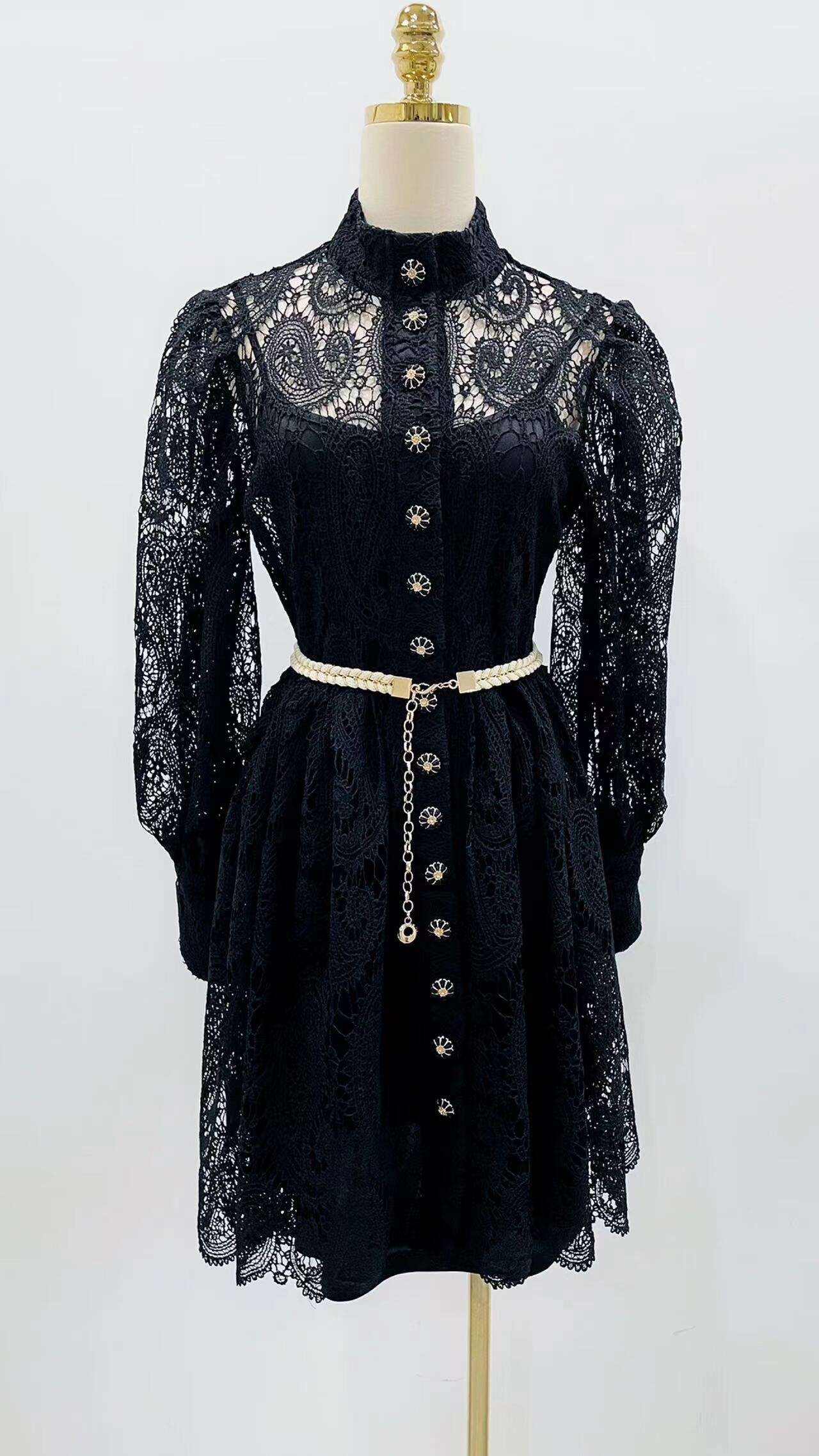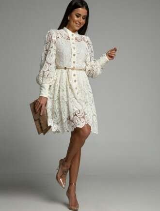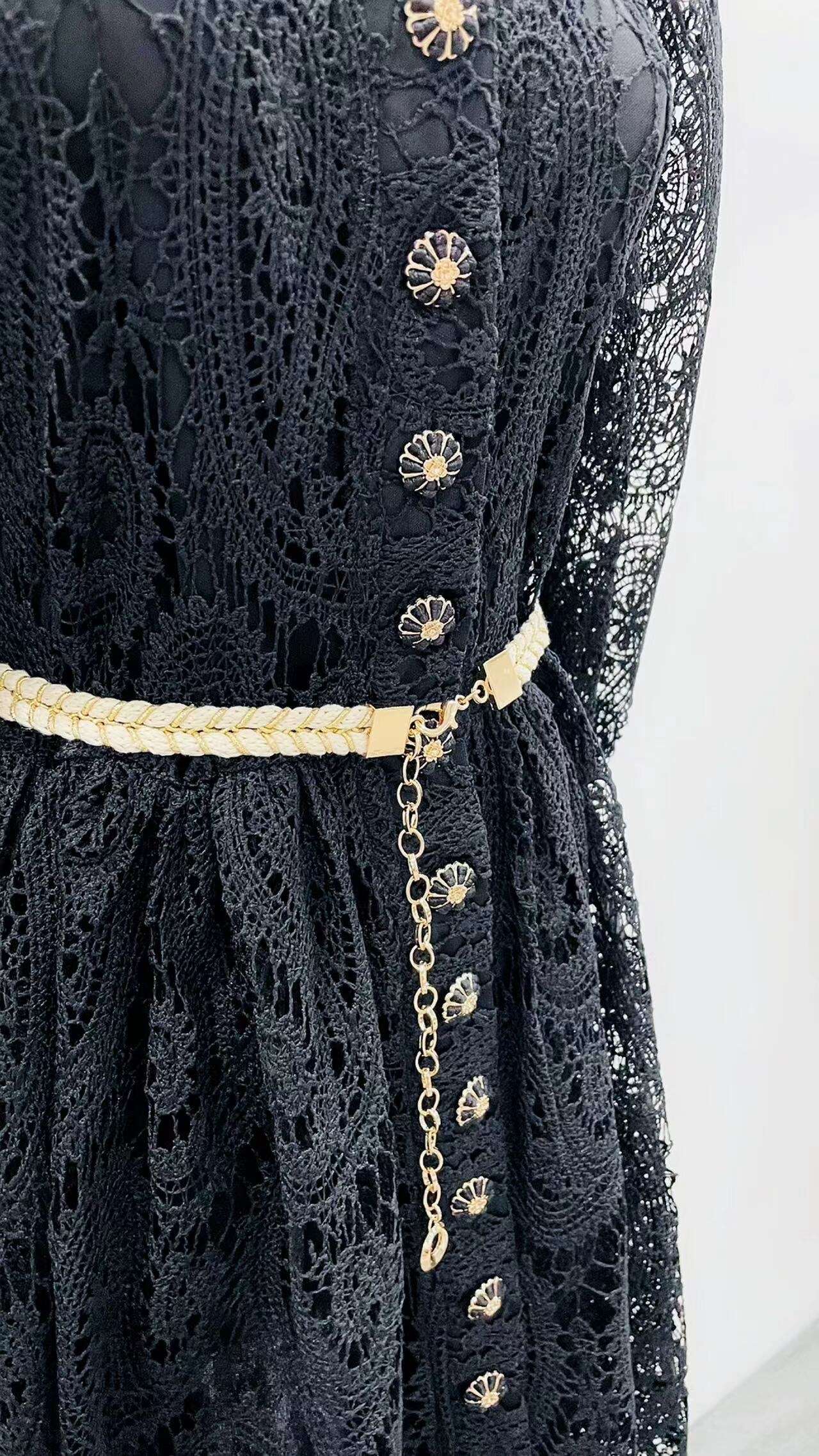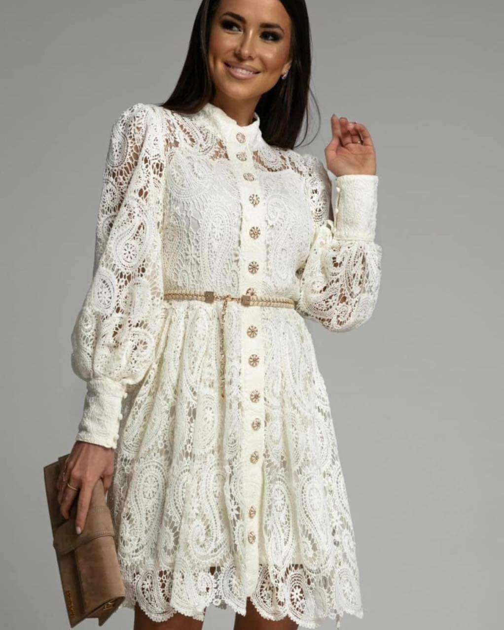 Stylowa sukienka z delikatnej koronki, z eleganckimi guzikami i ozdobnym paskiem, doskonała na specjalne okazje.