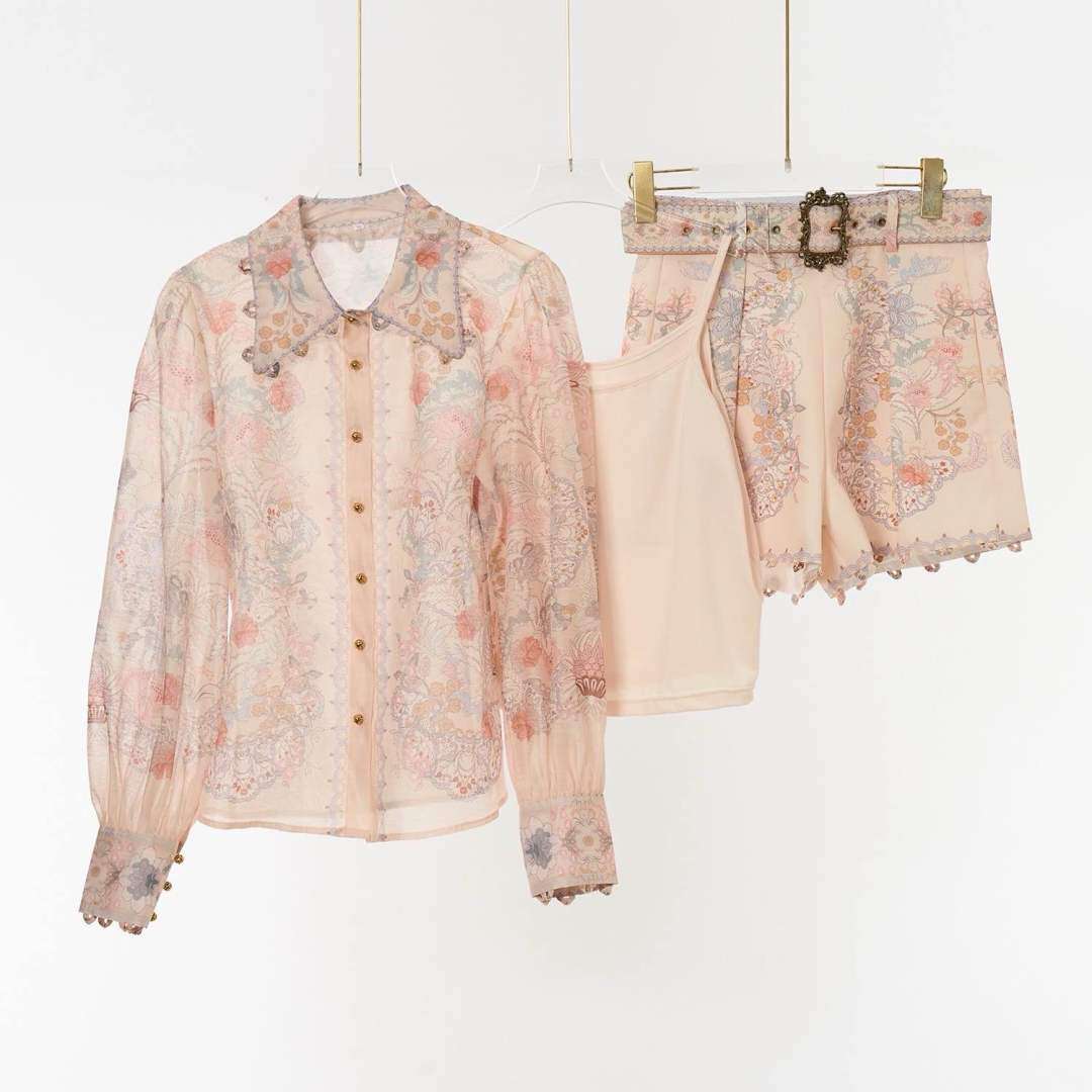 Zwiewny komplet w kolorze beżu z subtelnym, kwiatowym haftem. Delikatna koszula, top na ramiączkach i szorty z ozdobnym paskiem gwarantują wyjątkowy styl i wygodę.