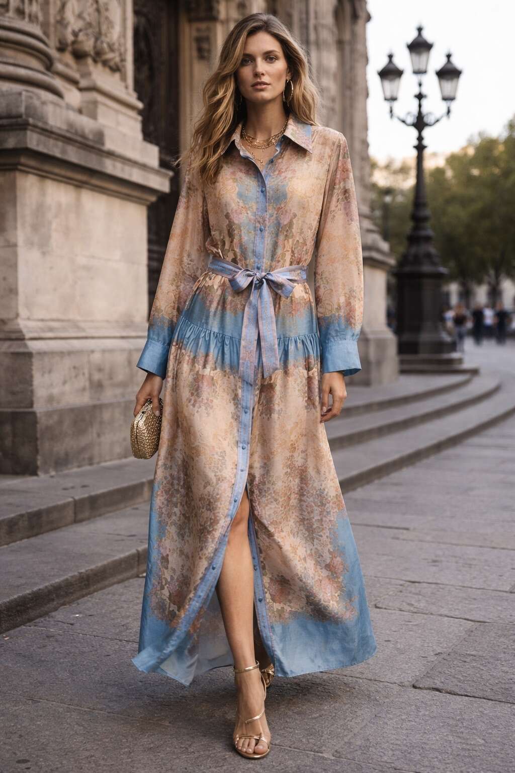 Zwiewna maxi z niebieskimi akcentami, romantyczny fason koszulowy, wygodny pasek w talii, lekki materiał i eleganckie detale.