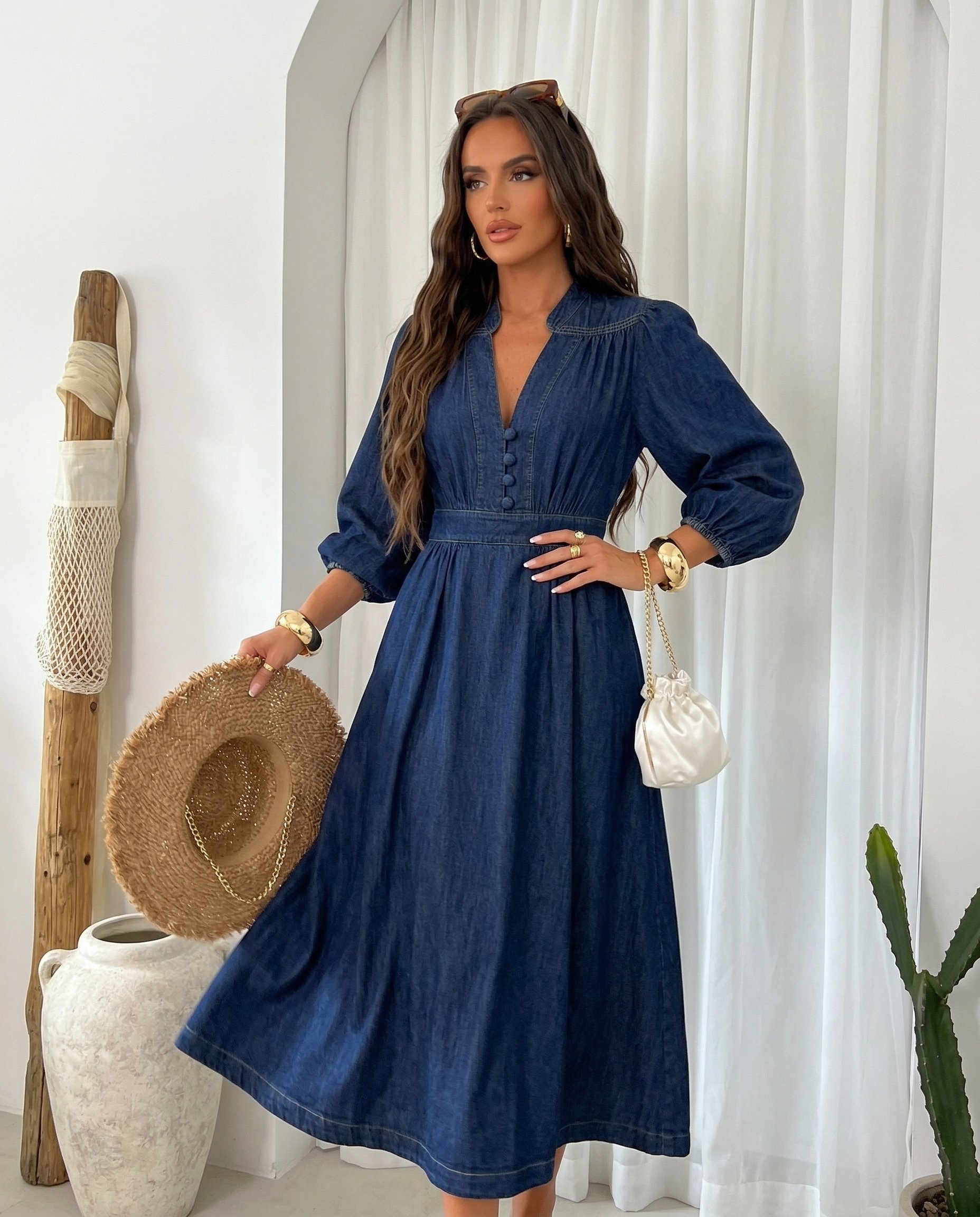 Nowoczesny krój midi z jeansowego, 100% bawełnianego materiału. Długie rękawy, eleganckie guziki i stylowa stójka – idealna wygoda i uniwersalny wygląd.