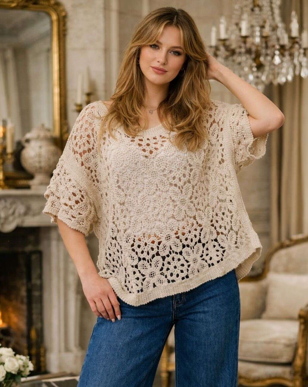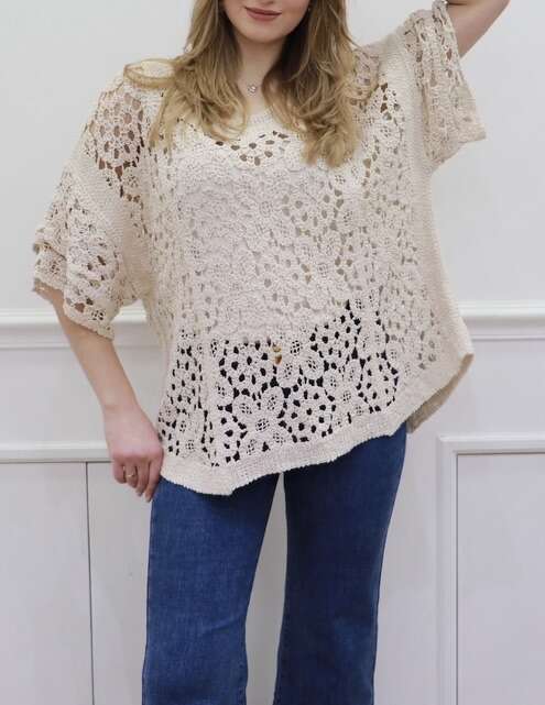 Ażurowa, oversize’owa bluzka w odcieniu beżu – idealna propozycja na sezon wiosna-lato. Lekki, przewiewny materiał, stylowy wzór i wygodny krój.