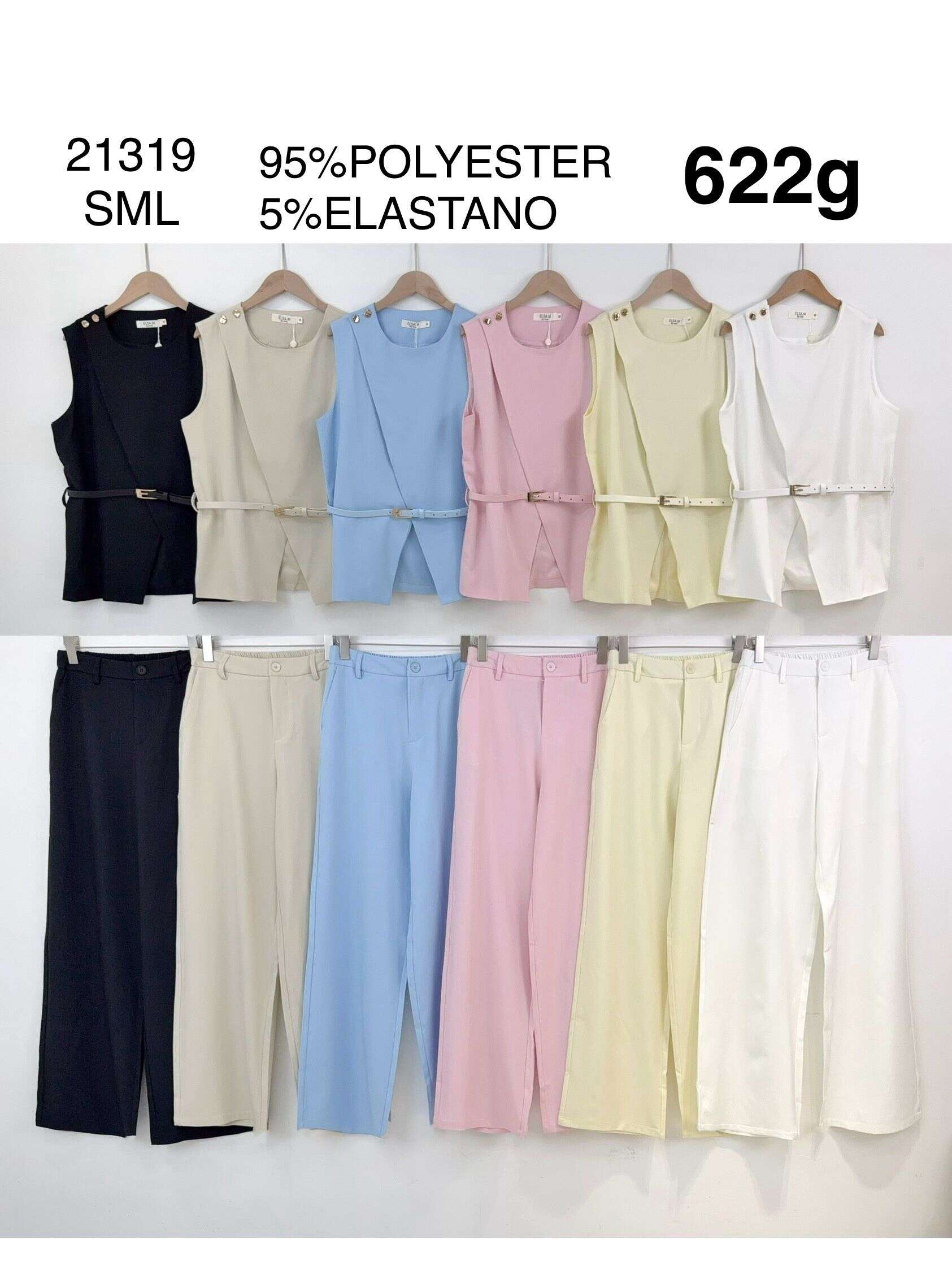 Klasyczny komplet damski zaprojektowany z myślą o klientkach ceniących komfort i kobiecy styl. Model składa się z eleganckiej kamizelki z subtelnymi guzikami na ramionach oraz szerokich spodni z rozcięciem u dołu. Dzięki połączeniu 95% poliestru i 5% elastanu zestaw jest lekki, wygodny, a jednocześnie doskonale układa się na sylwetce. Dostępność w pięciu modnych kolorach – żółtym, różowym, błękitnym, białym oraz beżowym – pozwala indywidualnie dopasować ofertę do oczekiwań różnych klientek. Komplet dostępny w rozmiarach S, M i L, sprawdzi się zarówno w codziennych stylizacjach do pracy, jak i podczas eleganckich, wiosennych oraz letnich spotkań. Zainwestuj w bestseller, który podniesie atrakcyjność Twojej kolekcji hurtowej!