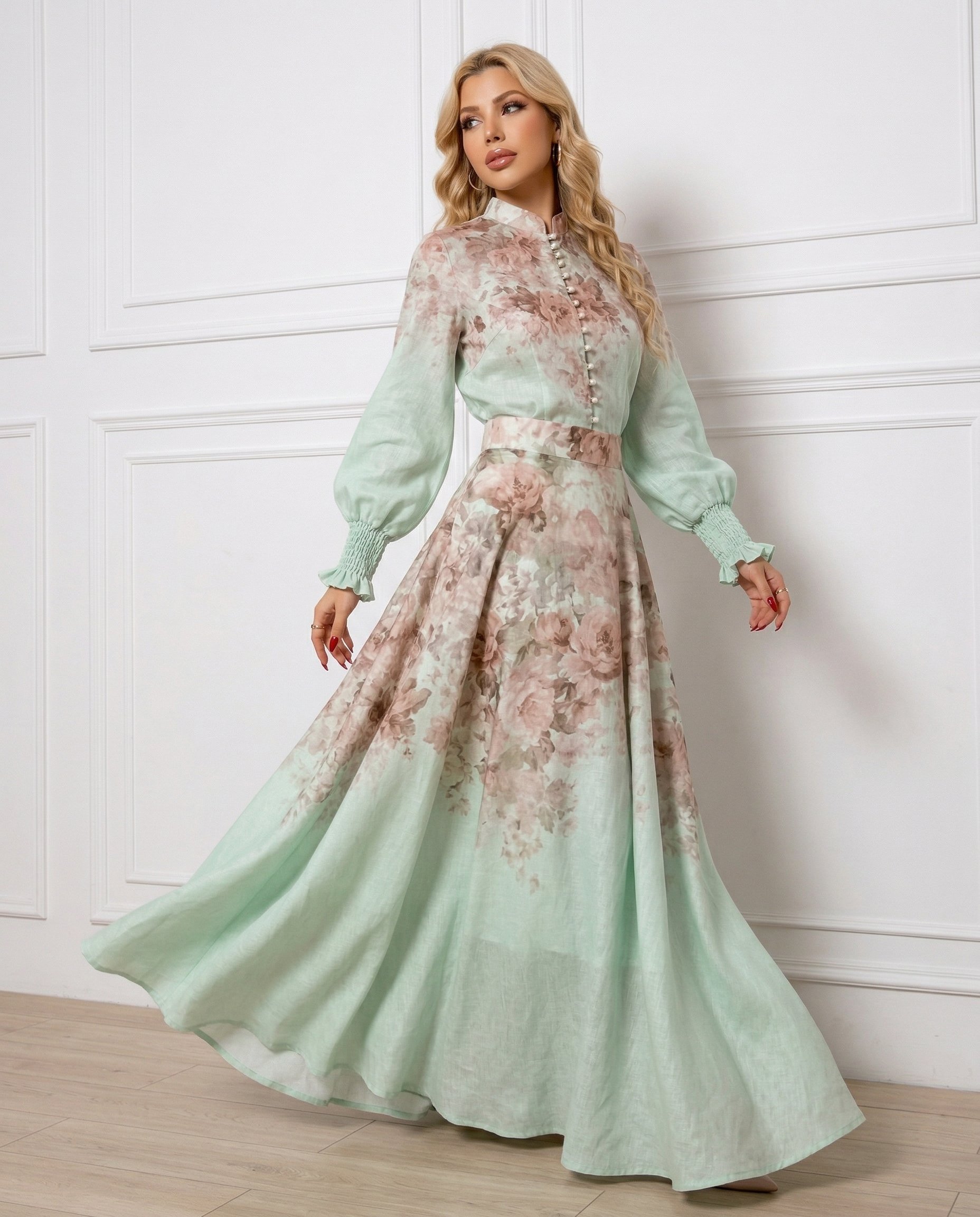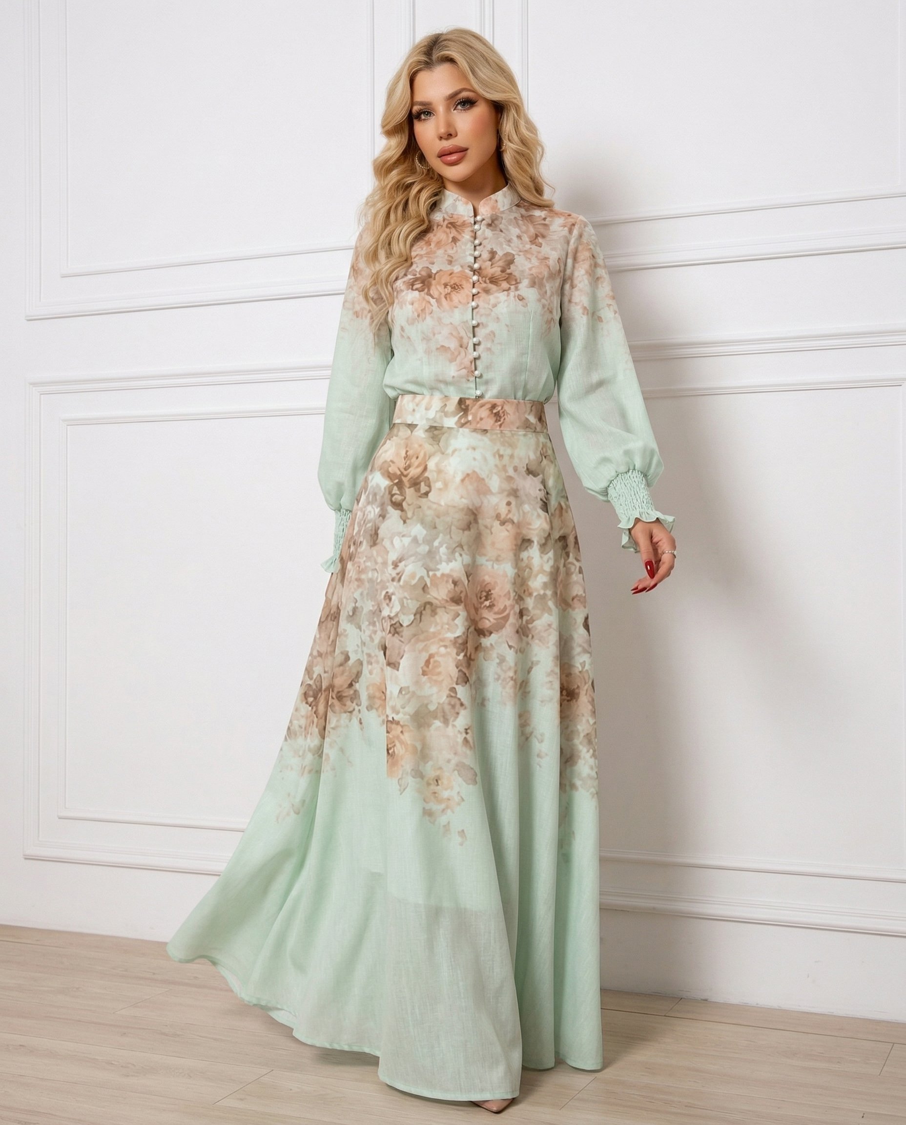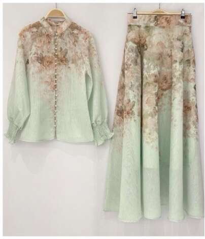 Zwiewny komplet damski z długą spódnicą i koszulą, ozdobiony delikatnym, kwiatowym wzorem. Elegancki krój, subtelny beżowy kolor i wysokiej jakości materiał zapewniają wygodę i styl na każdą okazję.
