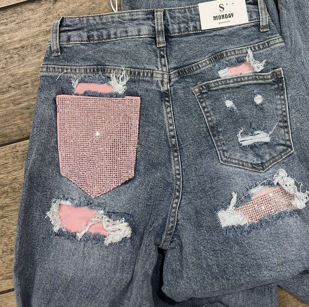 Jeansowe spodnie z efektem przetarć, dekoracyjnymi kieszeniami wysadzanymi cyrkoniami i kolorowymi wstawkami. Modny, streetwearowy look i wygodny krój na co dzień.