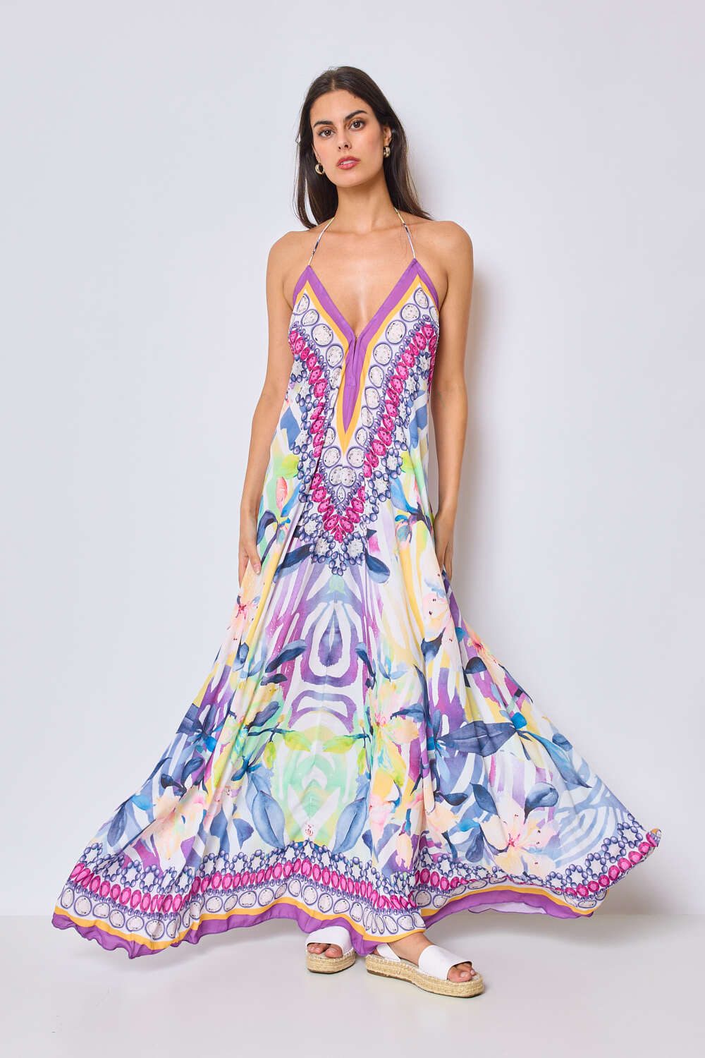 Zwiewna maxi sukienka z głębokim dekoltem, na cienkich ramiączkach, w multikolorowy, artystyczny print.