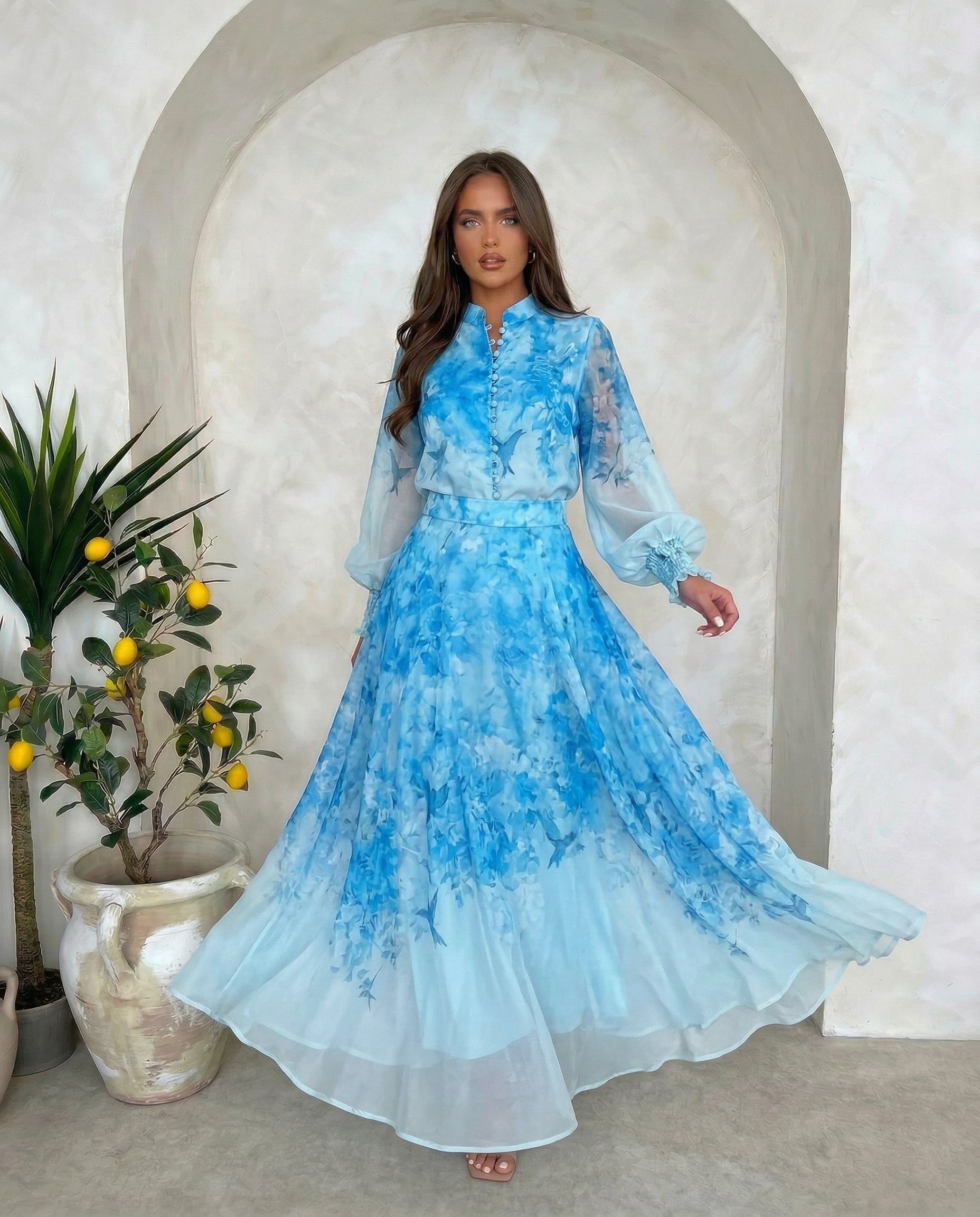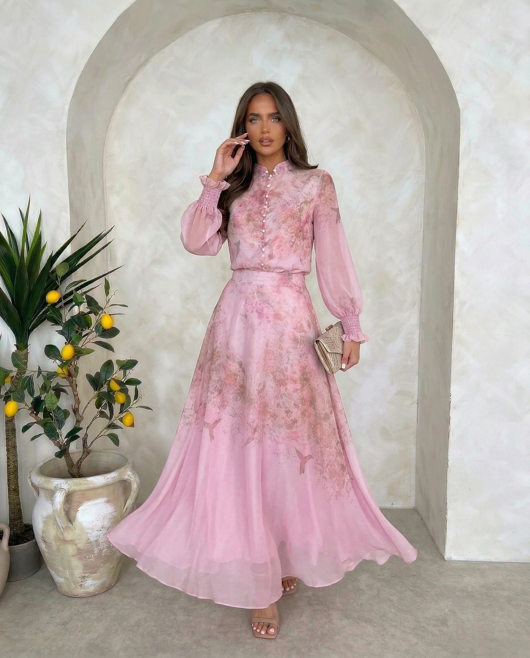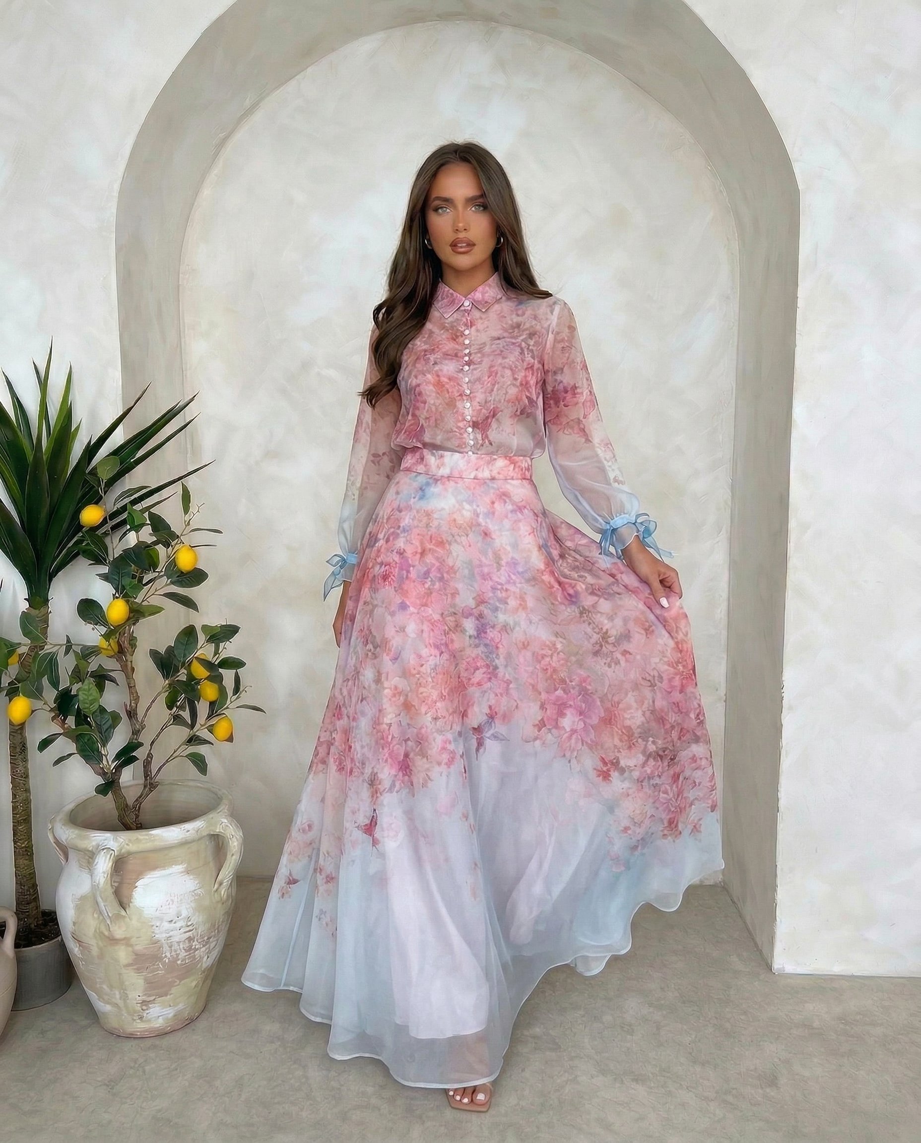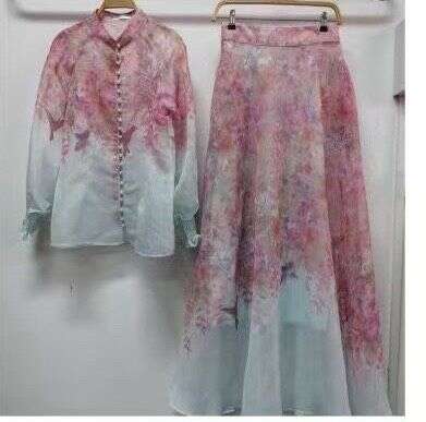 Zwiewny komplet z eleganckiej tkaniny, subtelny print, romantyczny krój i delikatne perłowe guziki. Idealny wybór na wyjątkowe okazje.