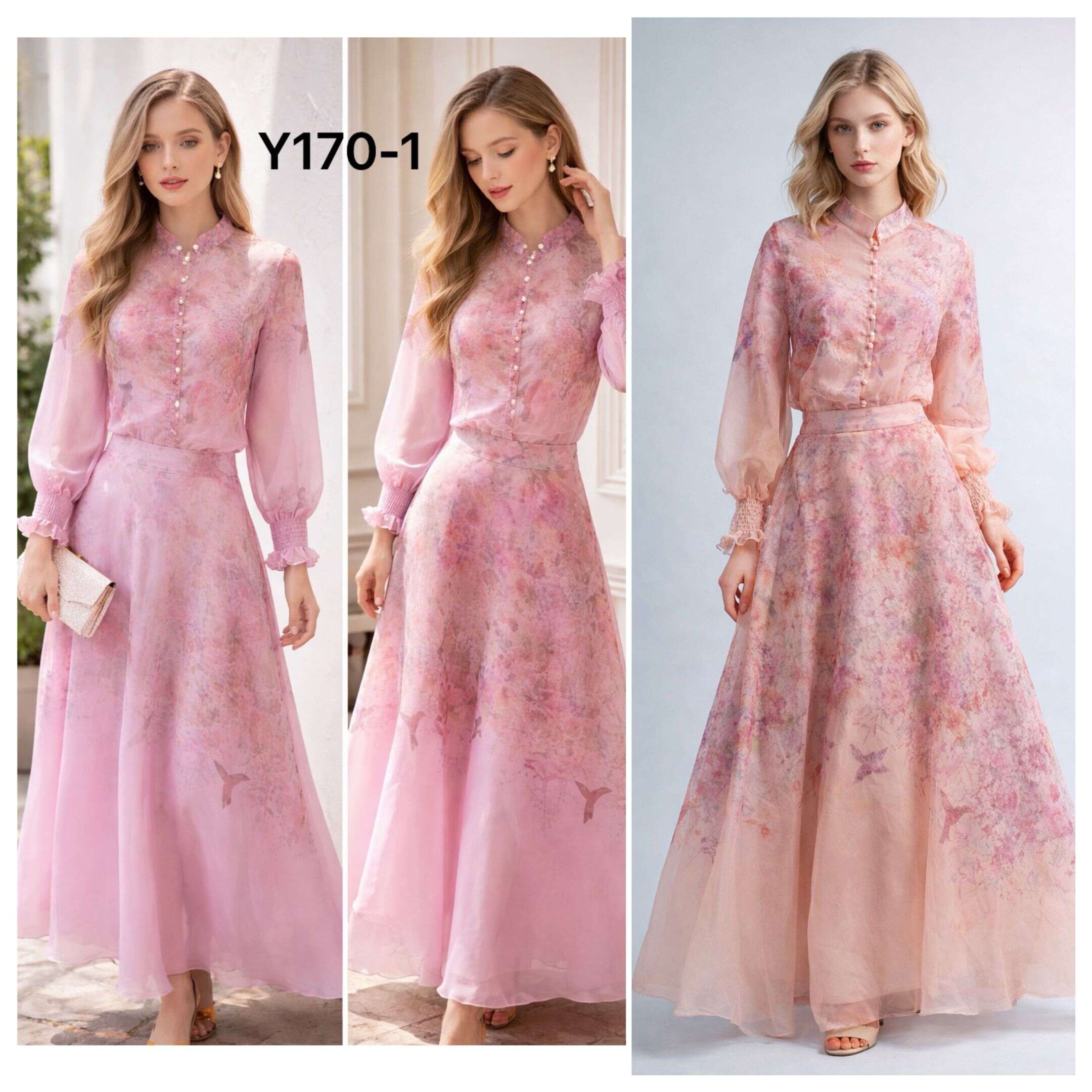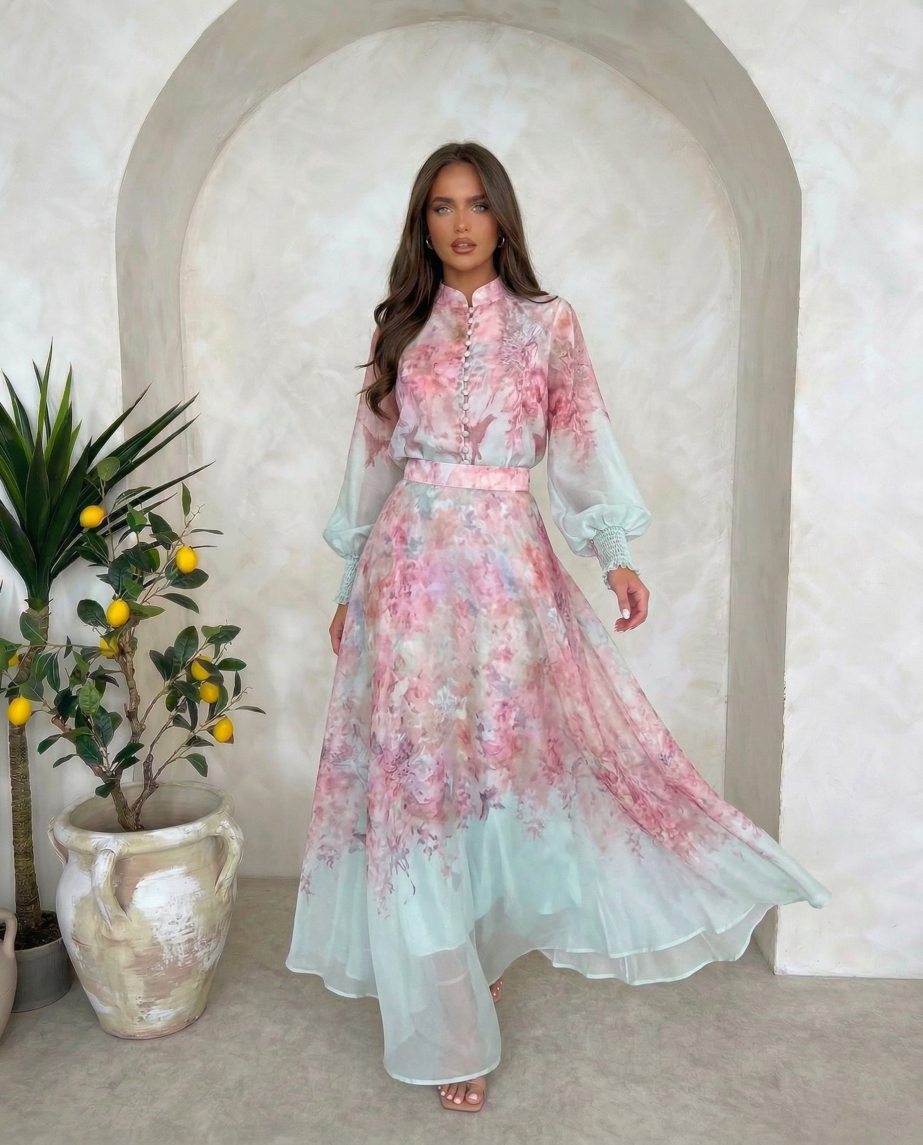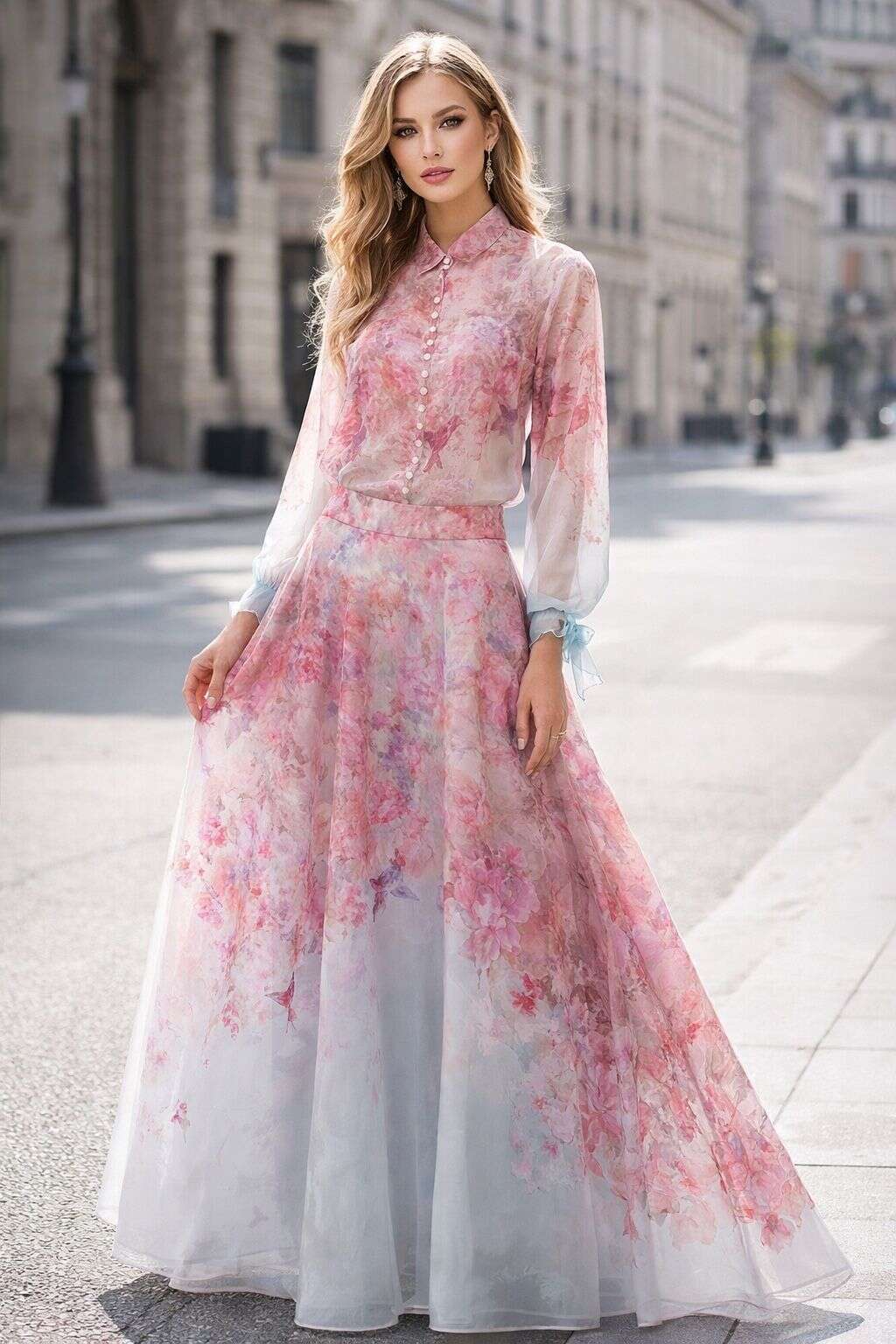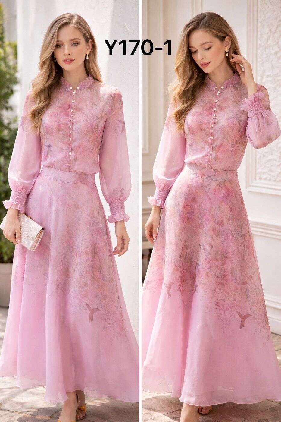 Zwiewny komplet z eleganckiej tkaniny, subtelny print, romantyczny krój i delikatne perłowe guziki. Idealny wybór na wyjątkowe okazje.