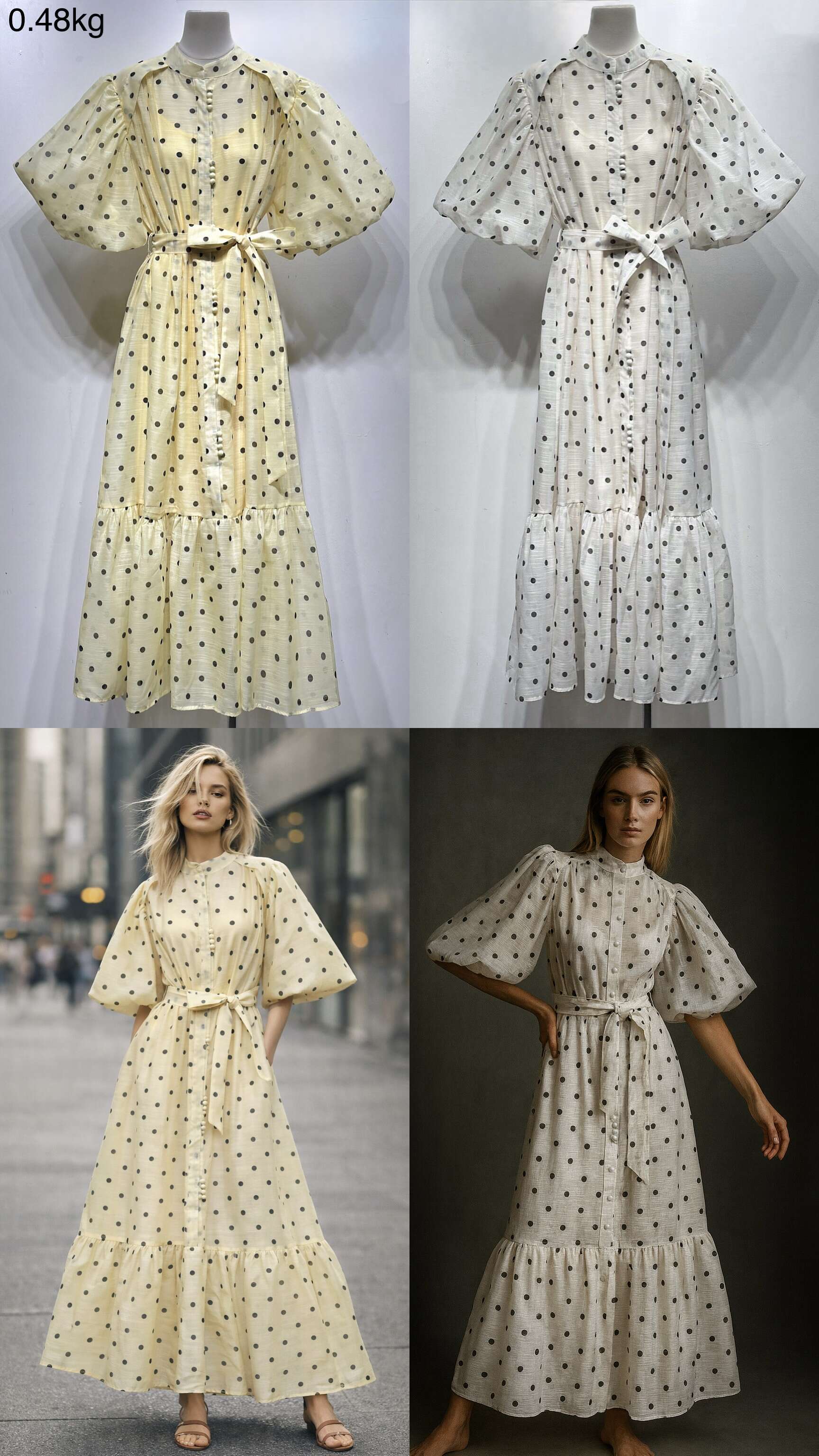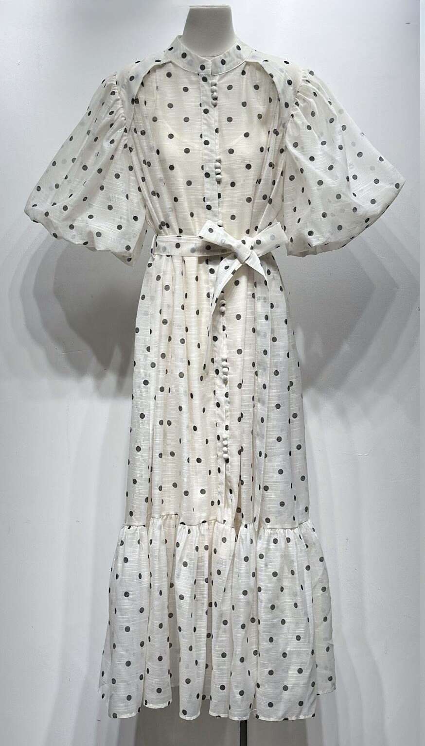 Zwiewna sukienka midi w grochy, z efektownymi bufiastymi rękawami i paskiem podkreślającym talię. Idealna na letnie dni, bardzo kobieca i wygodna.