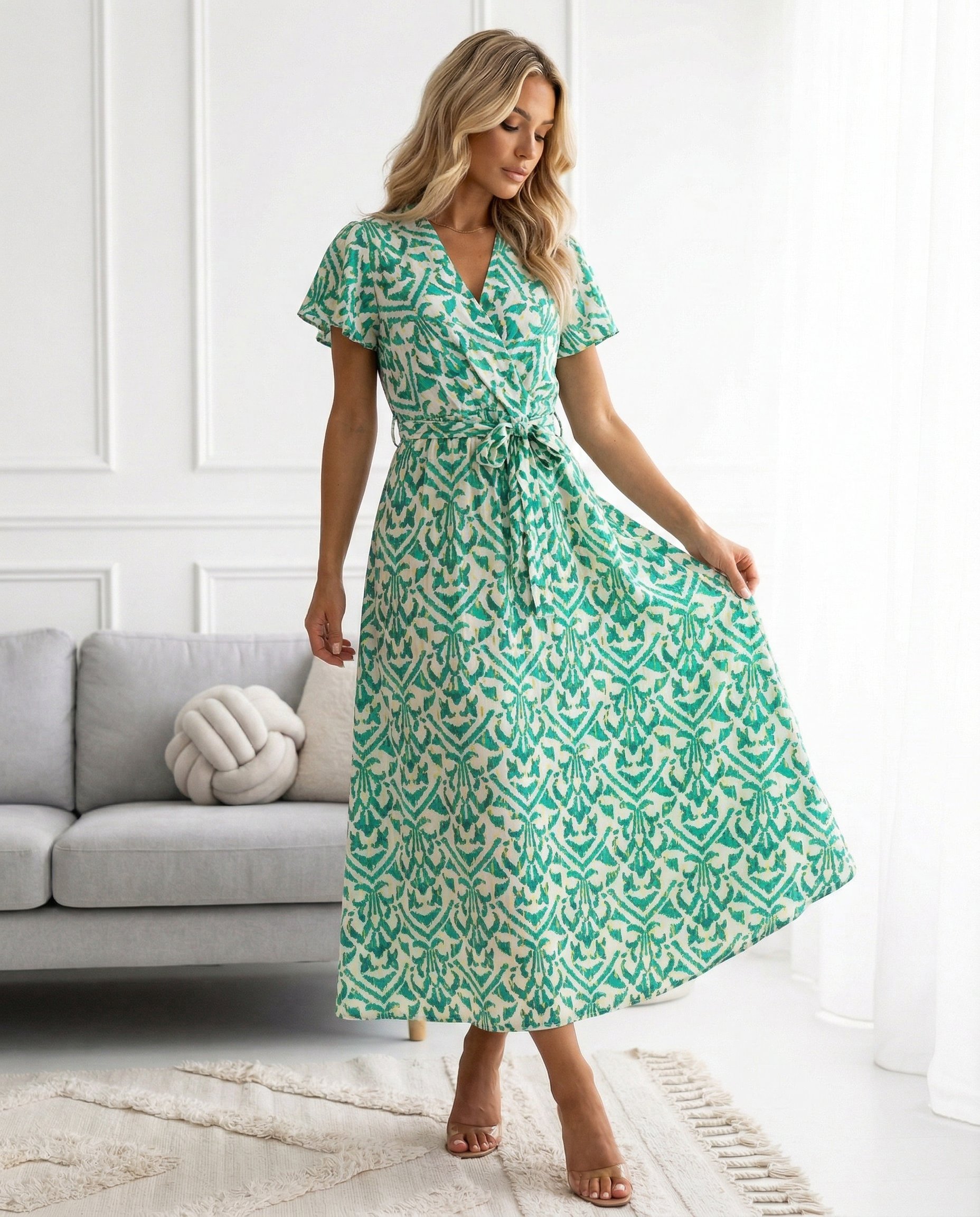 Zwiewna maksi sukienka z motywem, wiązana w talii, doskonała na sezon wiosna-lato.