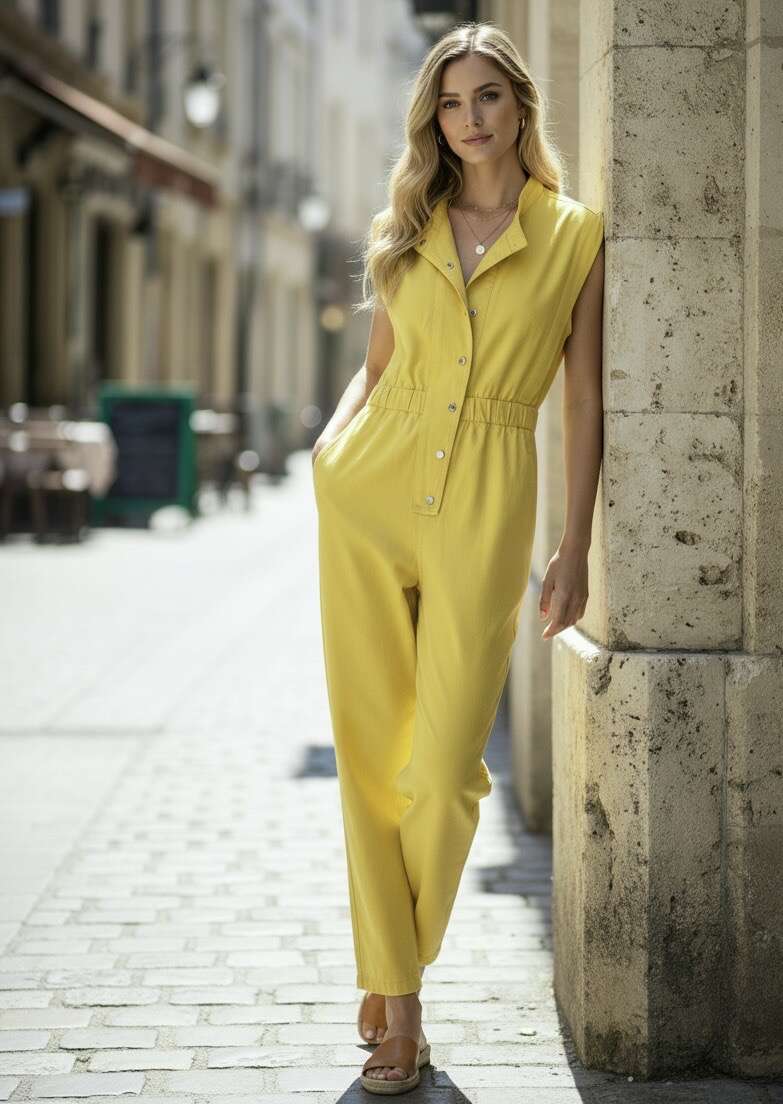Modny kombinezon bez rękawów z kołnierzem i marszczeniem w talii, gwarantuje wygodę i swobodny look.