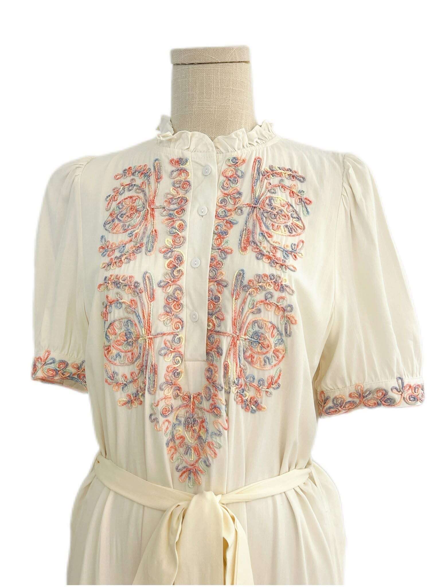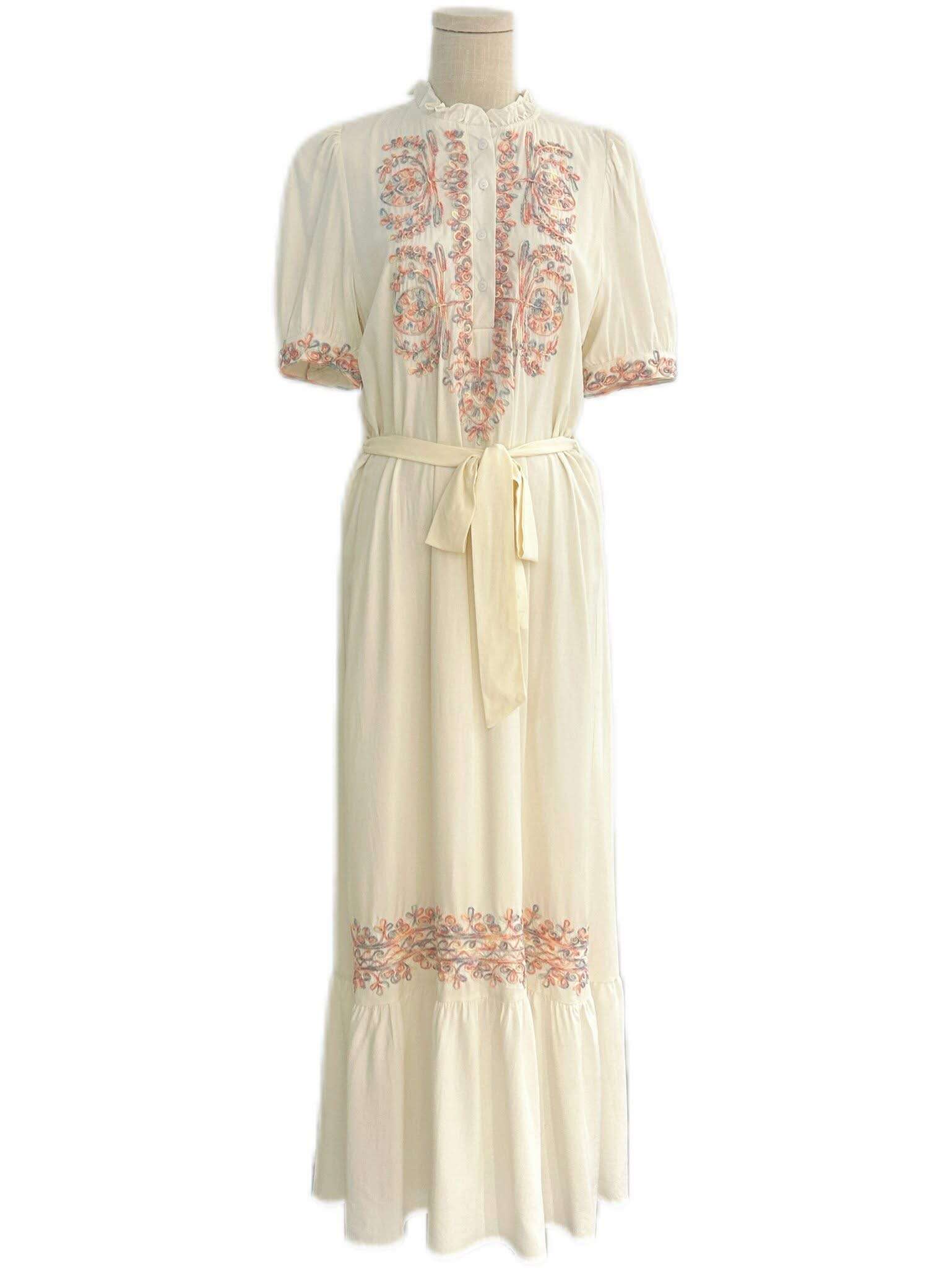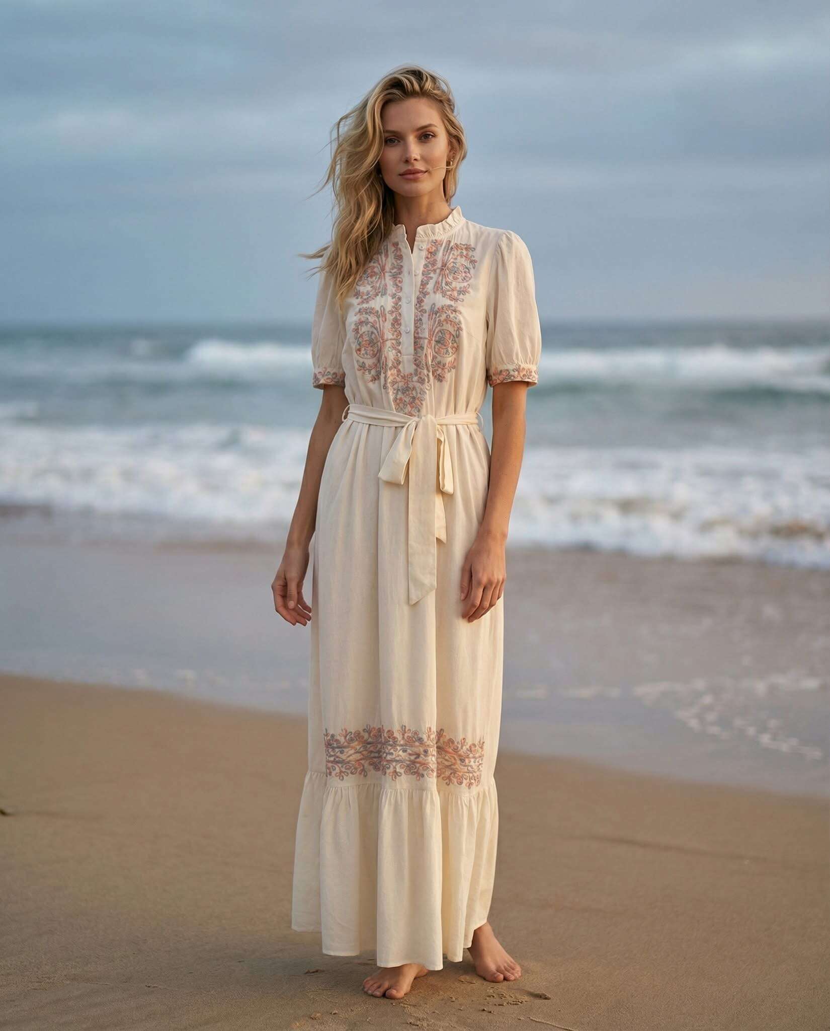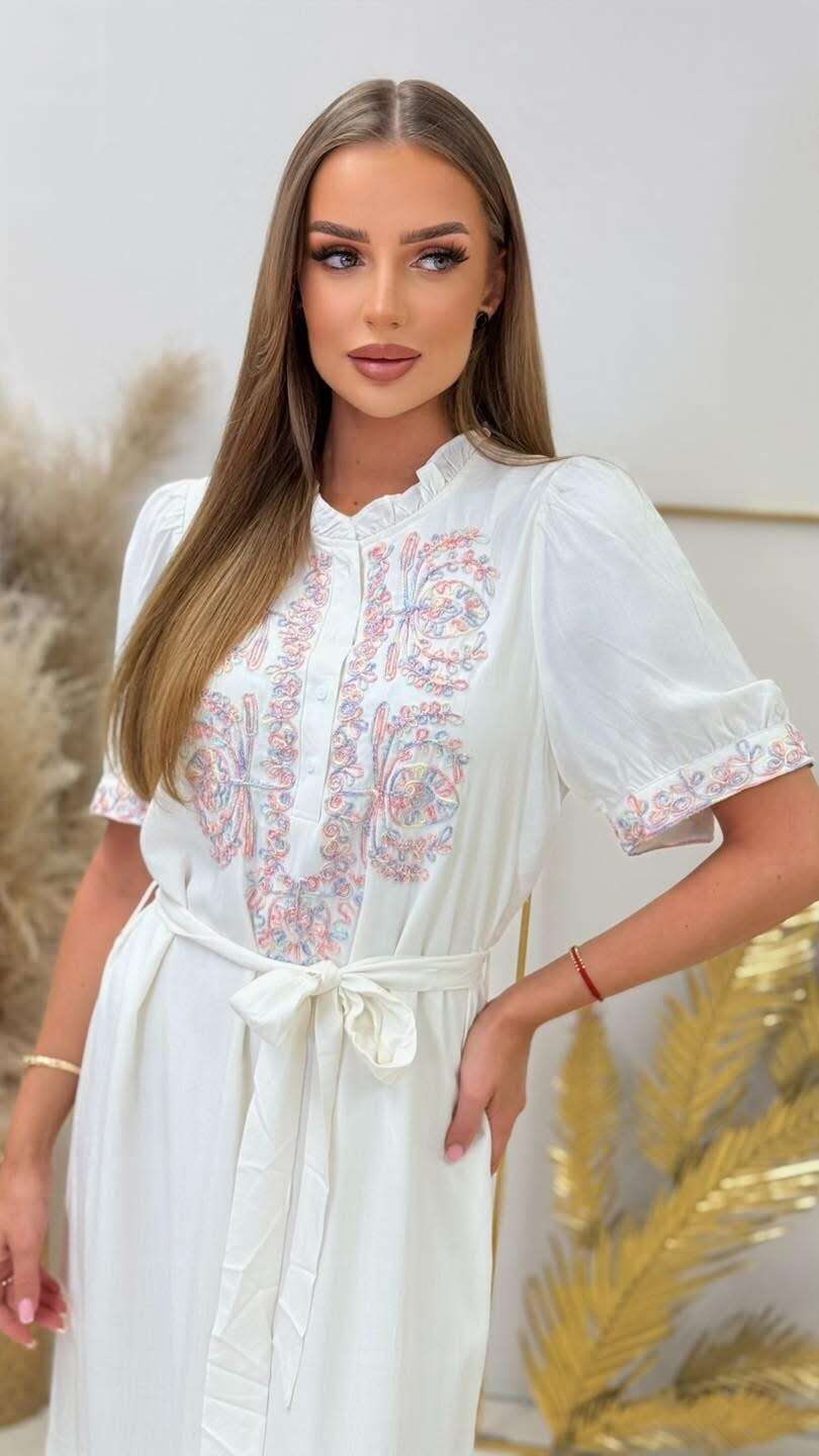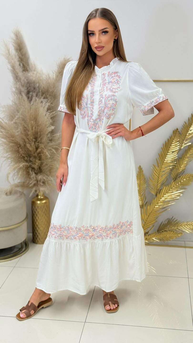 Stylowa, długa sukienka z efektownym haftem, wiązana w talii, gwarantująca wygodę i romantyczny look na każdą okazję.