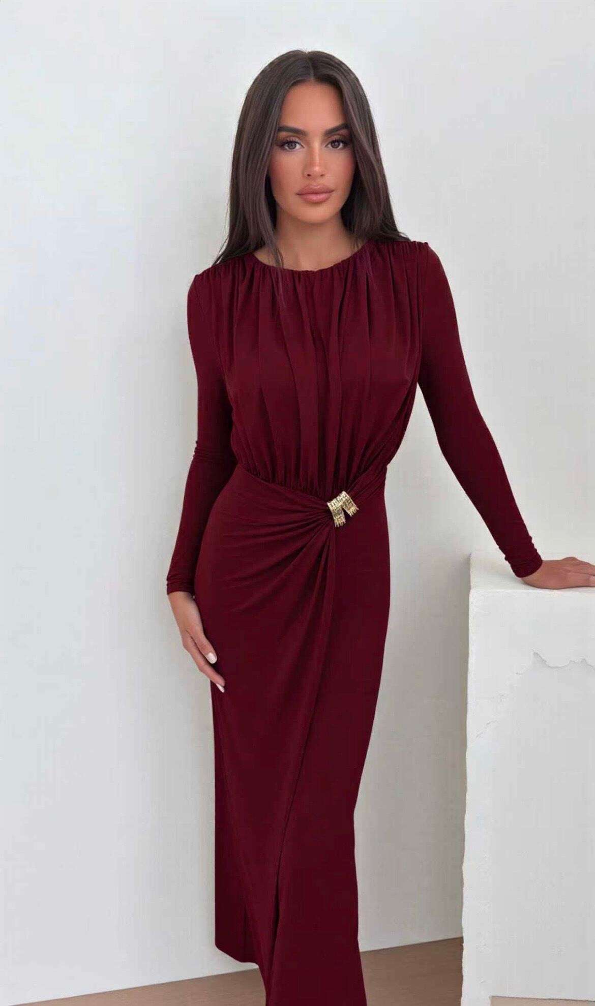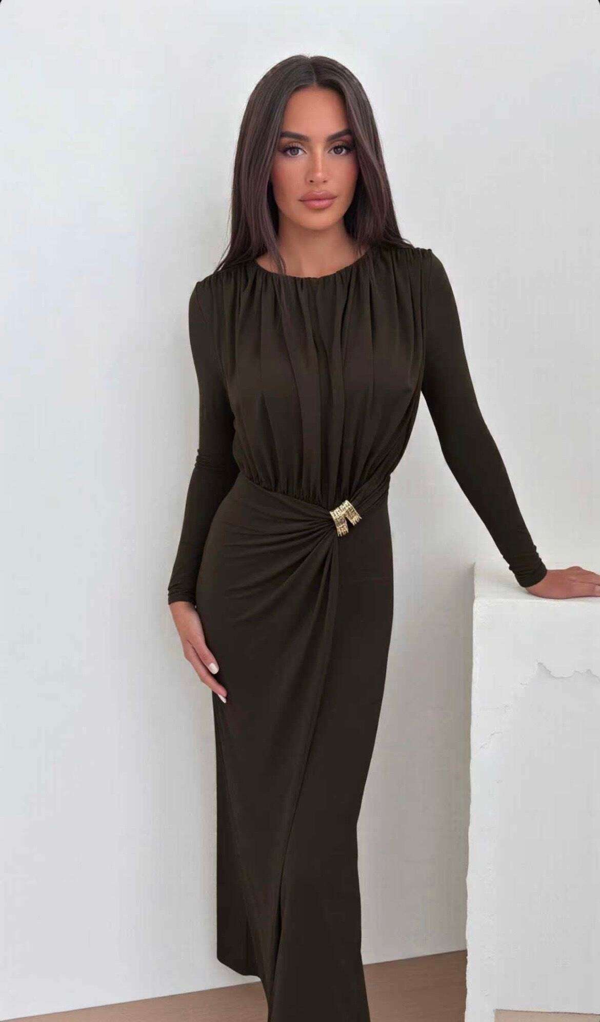 Elegancka długa sukienka z marszczeniami i ozdobną klamrą, wykonana z elastycznego, przyjemnego materiału, zapewniająca komfort i wyjątkowy wygląd.
