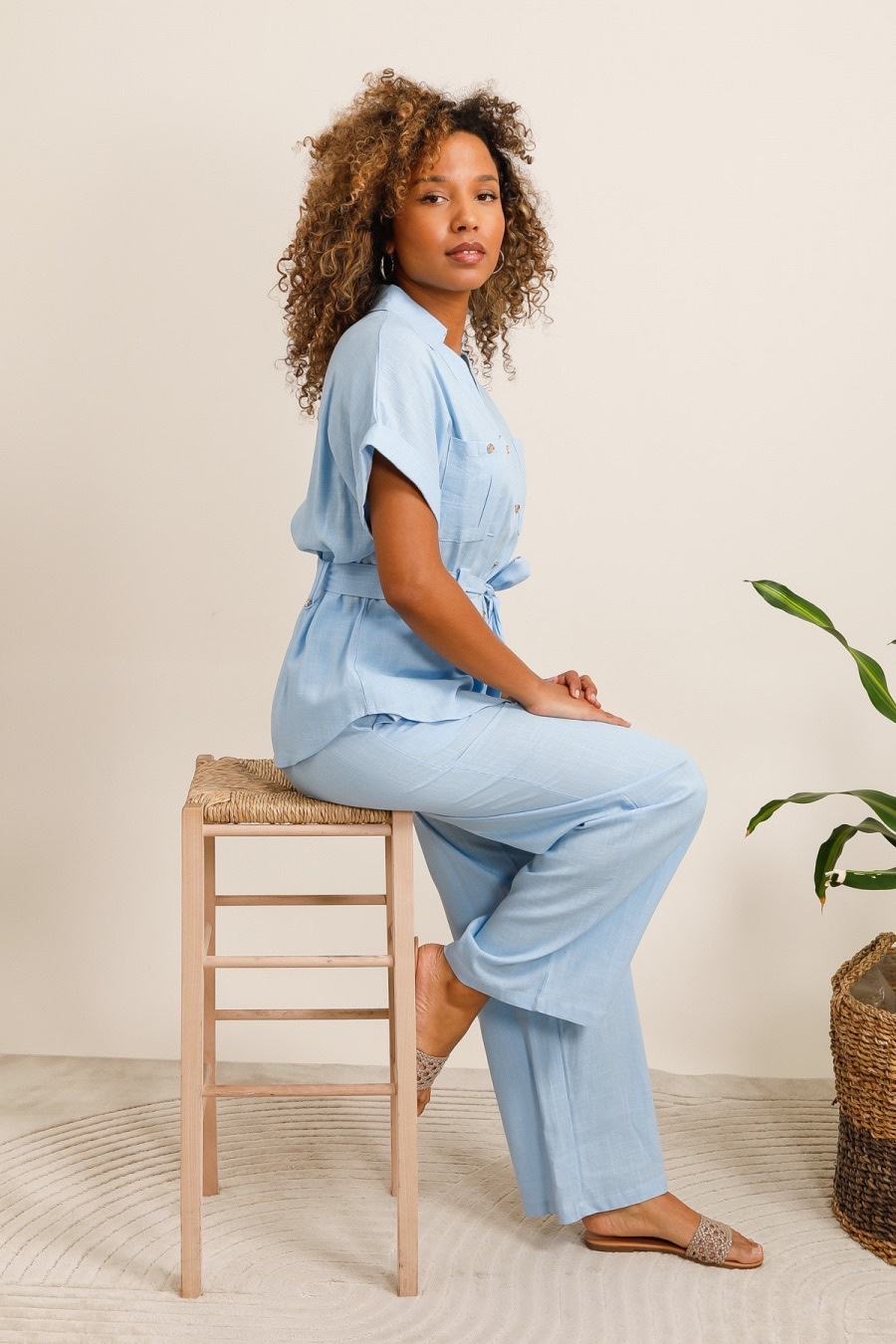 Ten komplet to doskonały wybór dla hurtowni, które stawiają na wygodę, jakość i modny design. Dostępny w pięciu atrakcyjnych kolorach: żółtym, limonce, czarnym, błękitnym oraz beżowym – każda klientka znajdzie idealny odcień dla siebie. Komplet wyróżnia się luźnym krojem spodni z prostą nogawką oraz koszulową górą z kieszonkami i paskiem podkreślającym talię. Oddychający, przyjemny w dotyku materiał sprawdzi się doskonale zarówno latem, jak i podczas wiosennych stylizacji. Idealny na co dzień, do pracy, na spacer czy wieczorne spotkania. Produkt o uniwersalnym stylu i doskonałej jakości – łatwy w stylizacji i sprzedaży.