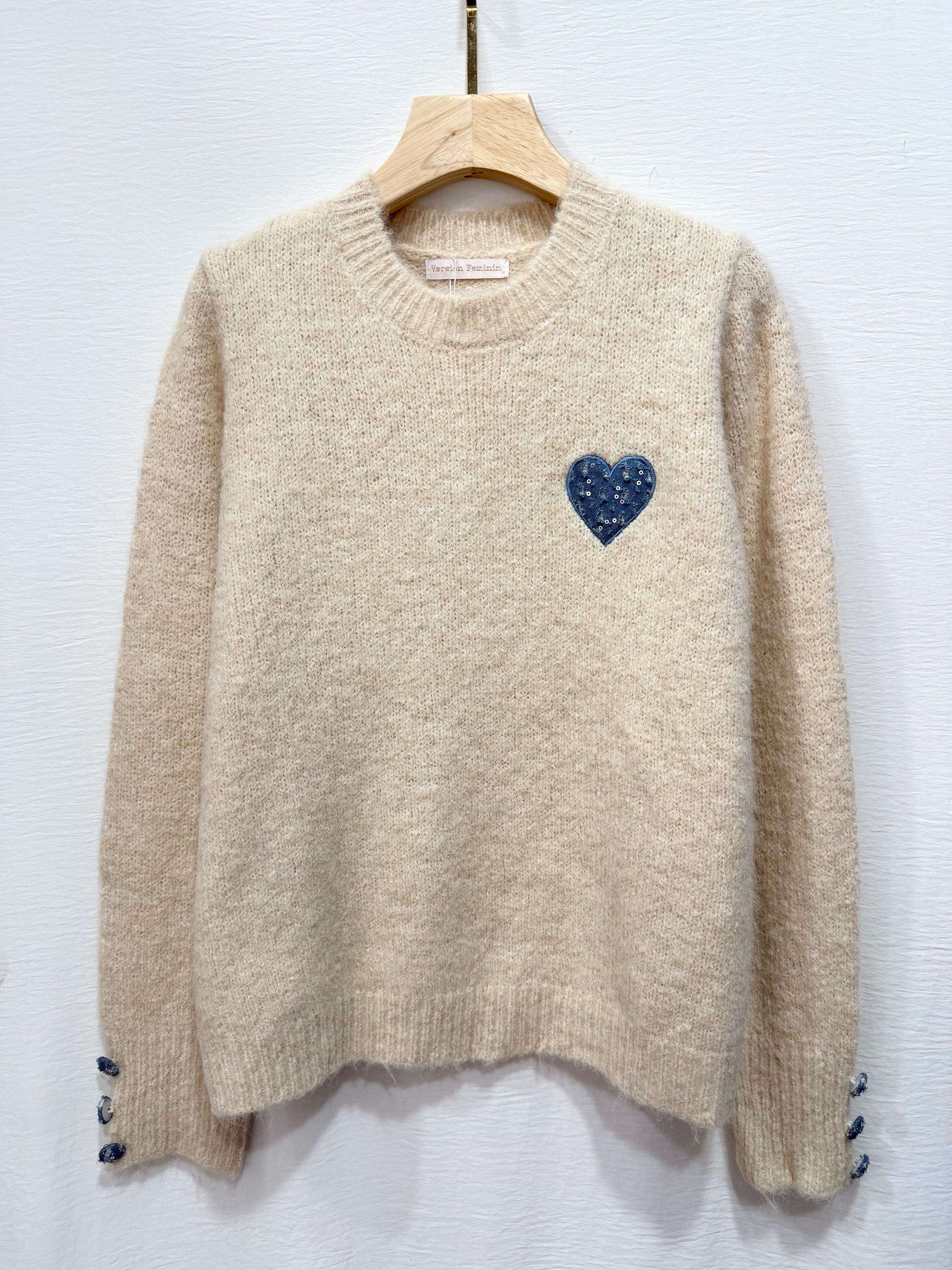 Sweter o luźnym kroju, przyjemny w dotyku, z uroczą naszywką w kształcie serca i ozdobnymi guzikami na rękawach.