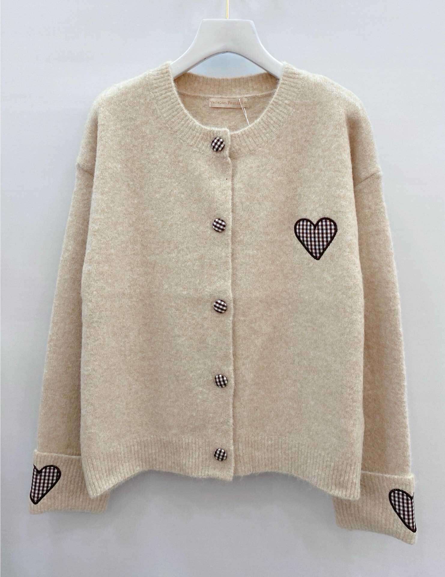 Sweter o klasycznym kroju z ozdobnymi guzikami i aplikacją serca – połączenie stylu, wygody i przytulnego materiału.