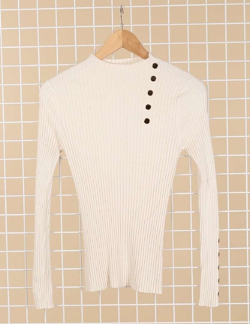 Prążkowany materiał, elegancki fason, dekoracyjne guziki na ramieniu i rękawie, wygoda oraz uniwersalny styl.