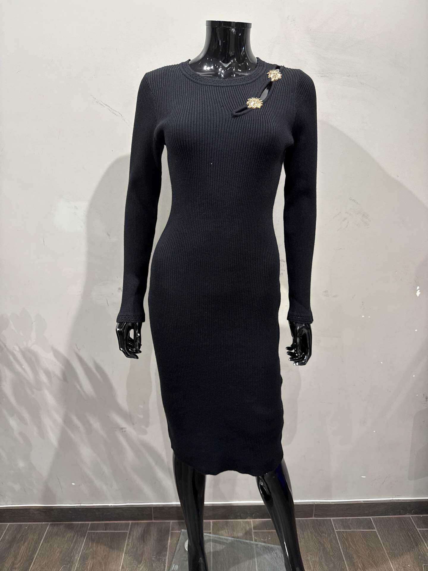 Prążkowana dzianina, dopasowany fason, ozdobne złote detale na ramieniu.