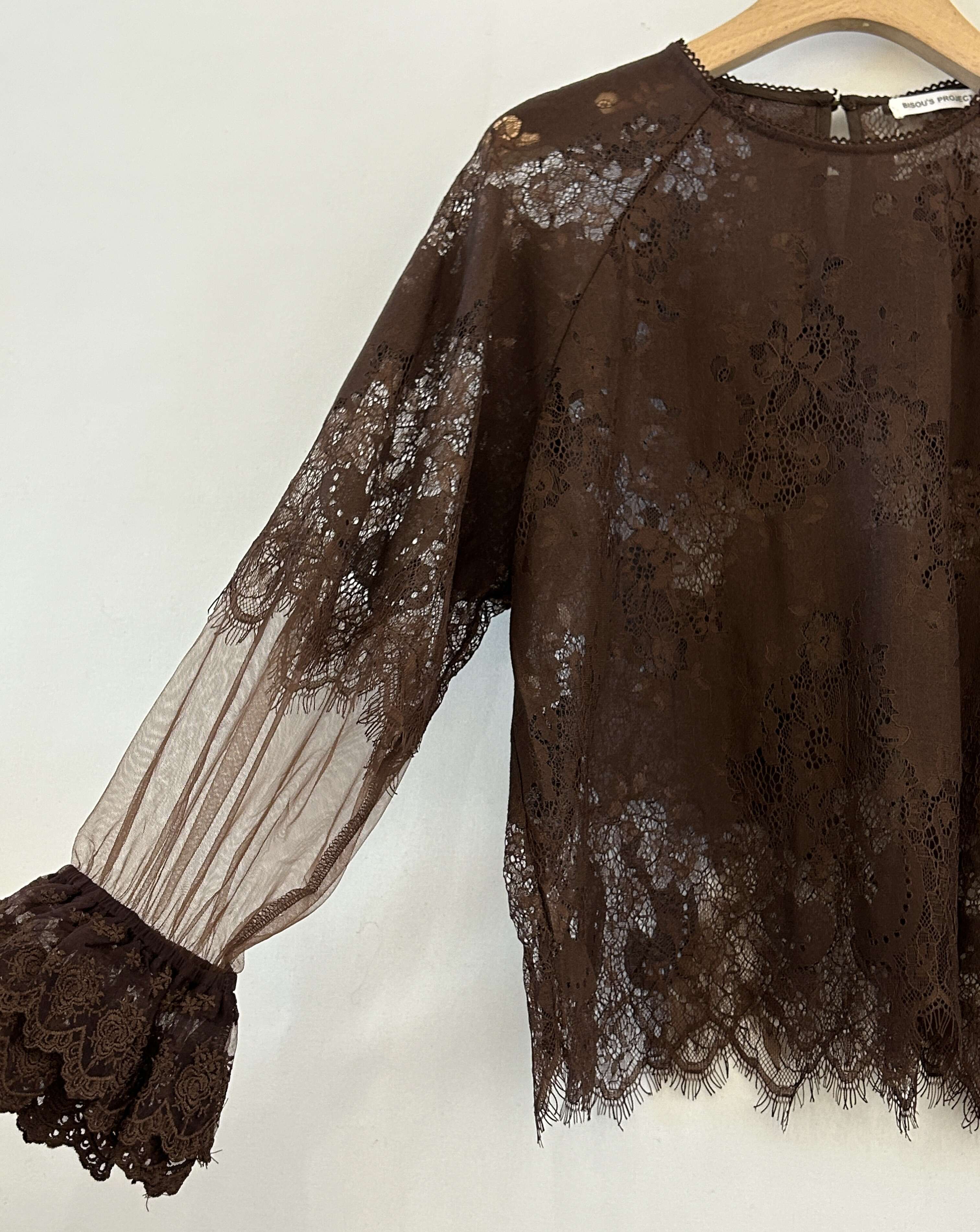 Koronkowa bluzka w czekoladowym kolorze z efektownymi rękawami i romantycznym wykończeniem – idealna na wyjątkowe okazje.