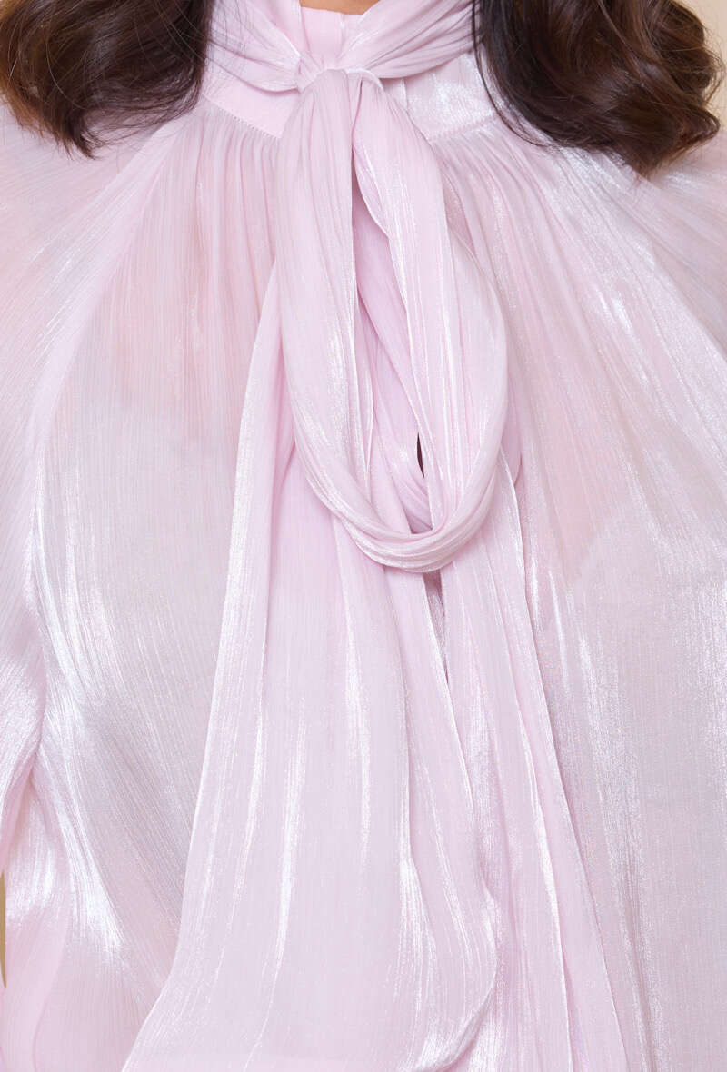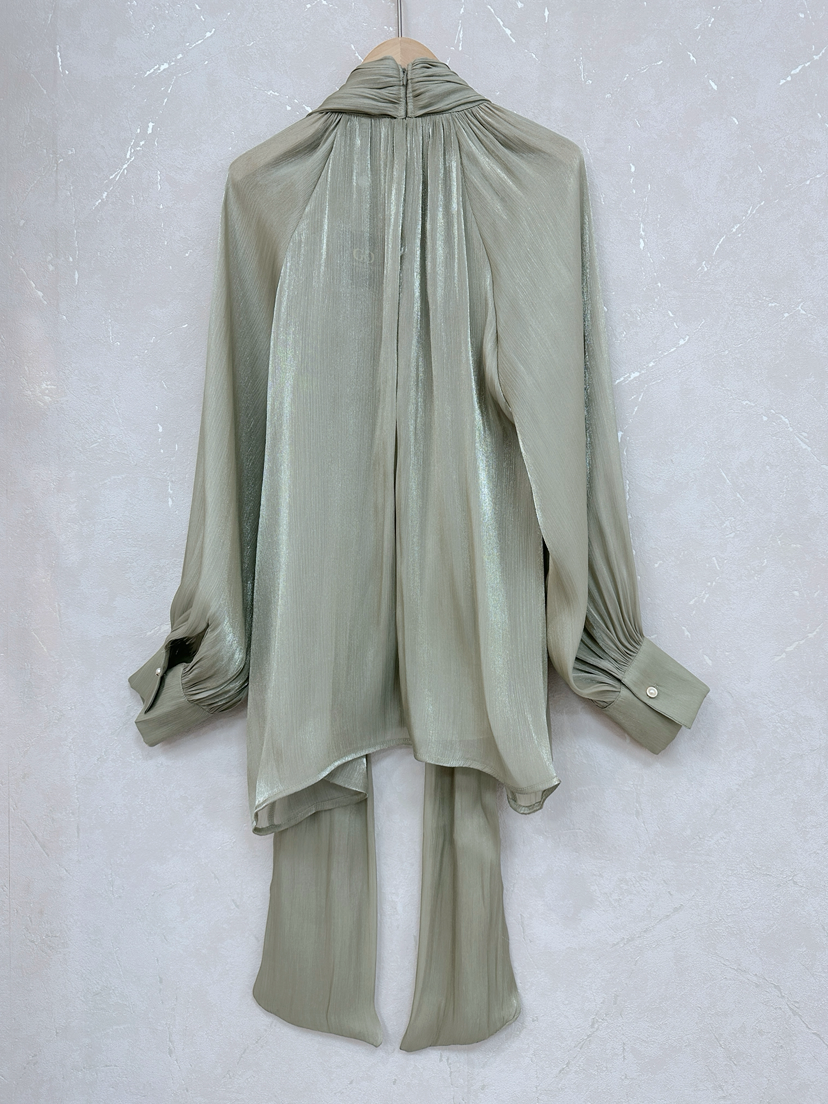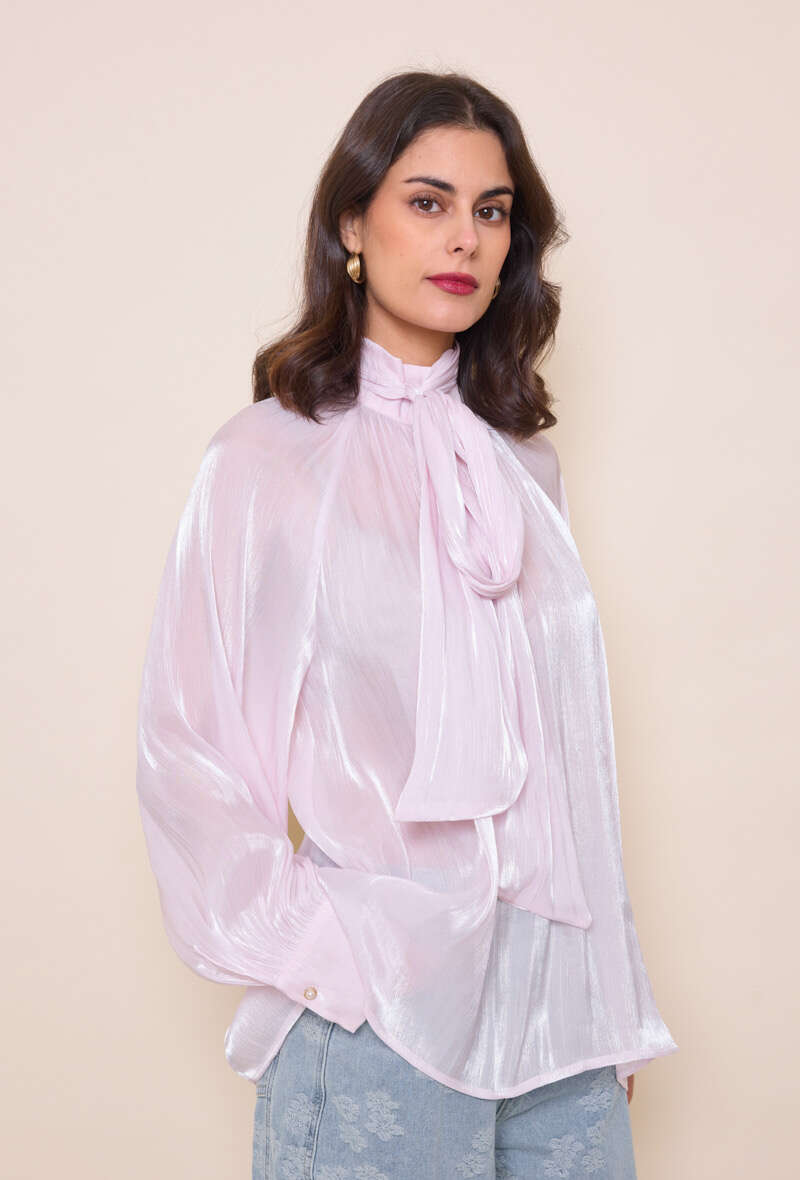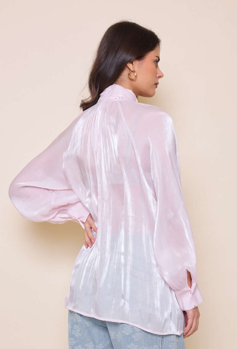 Efektowna koszula o luźnym kroju z połyskującego materiału w kolorze czekoladowym. Stójka i długie bufiaste rękawy dodają jej elegancji i wyjątkowego stylu.